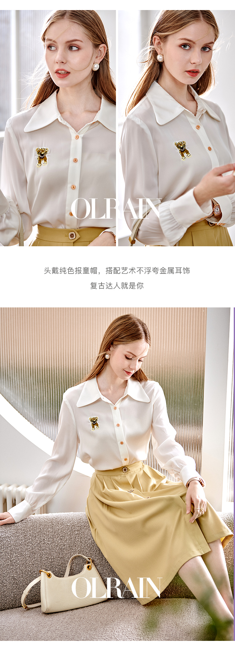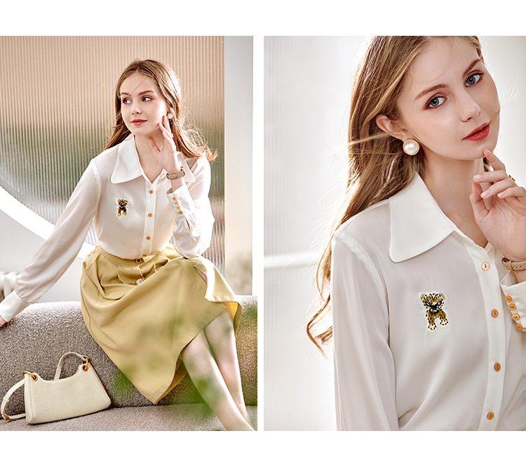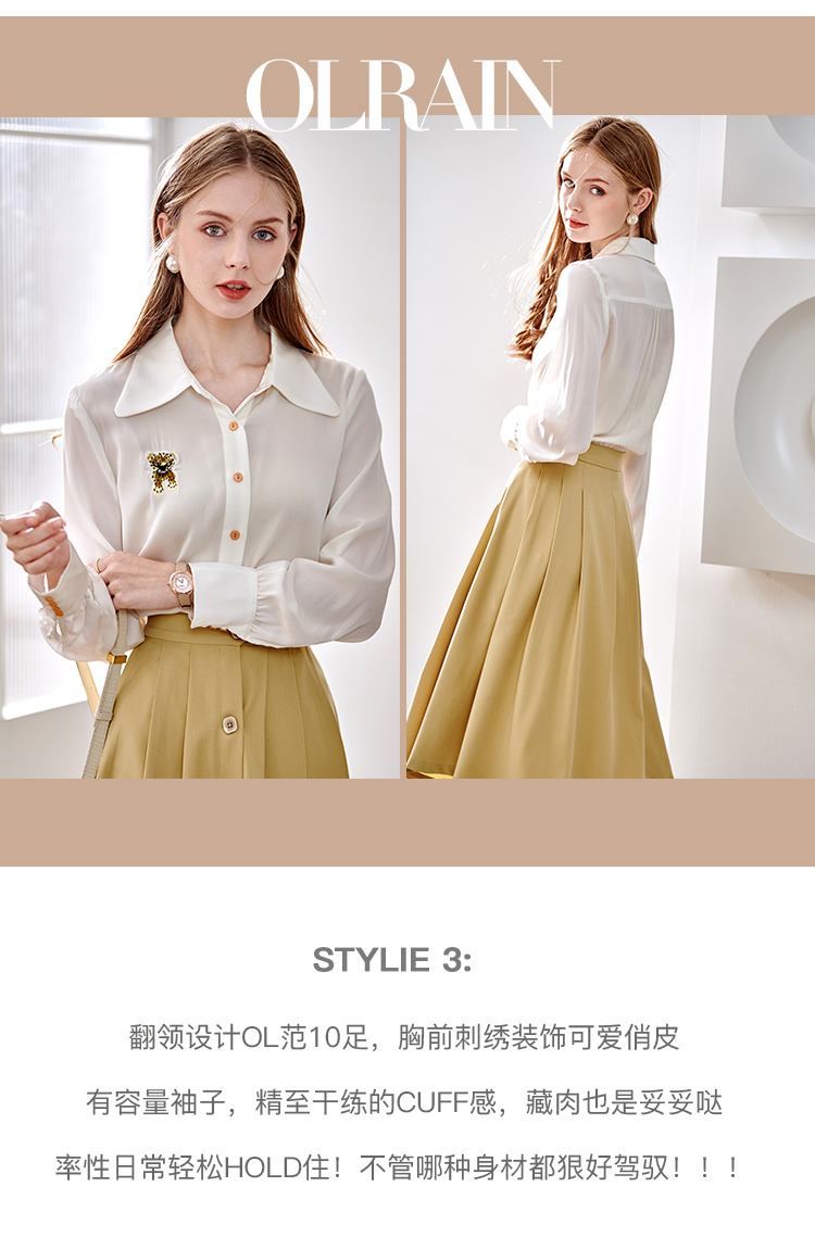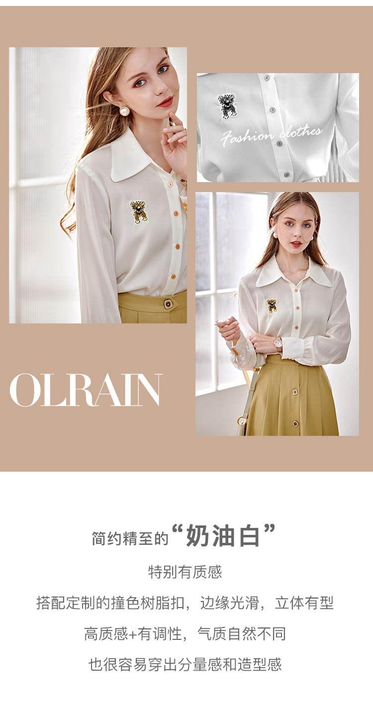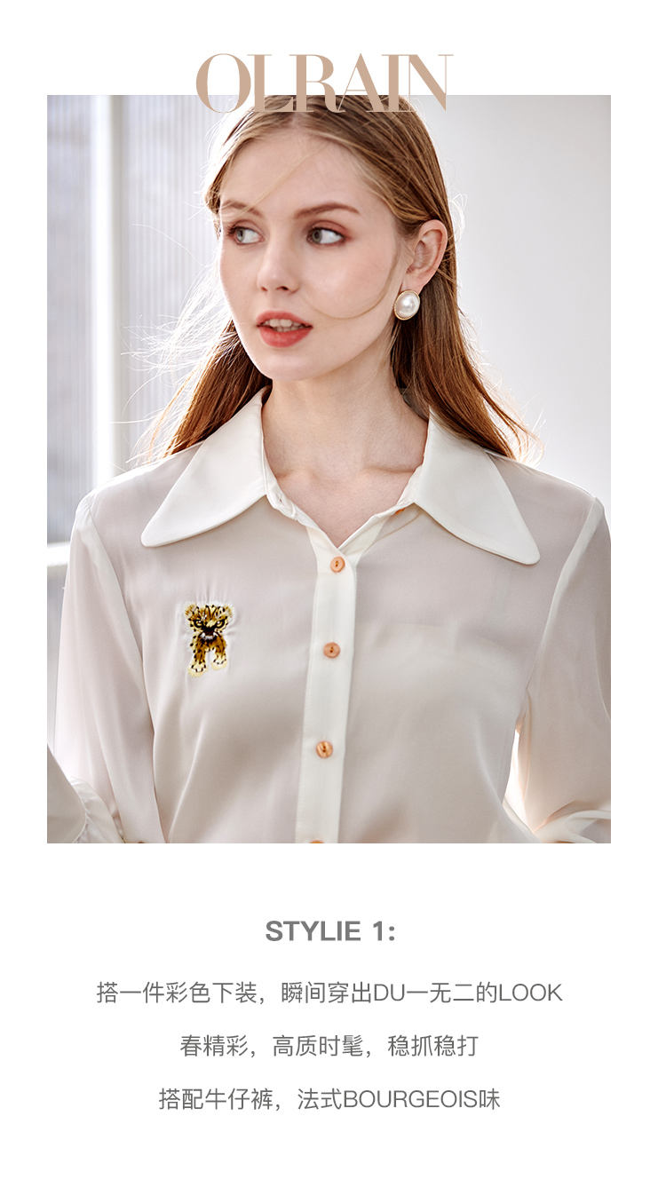 欧芮儿翻领长袖衬衫女春季新款时髦知性简约刺绣优雅俏皮减龄上衣