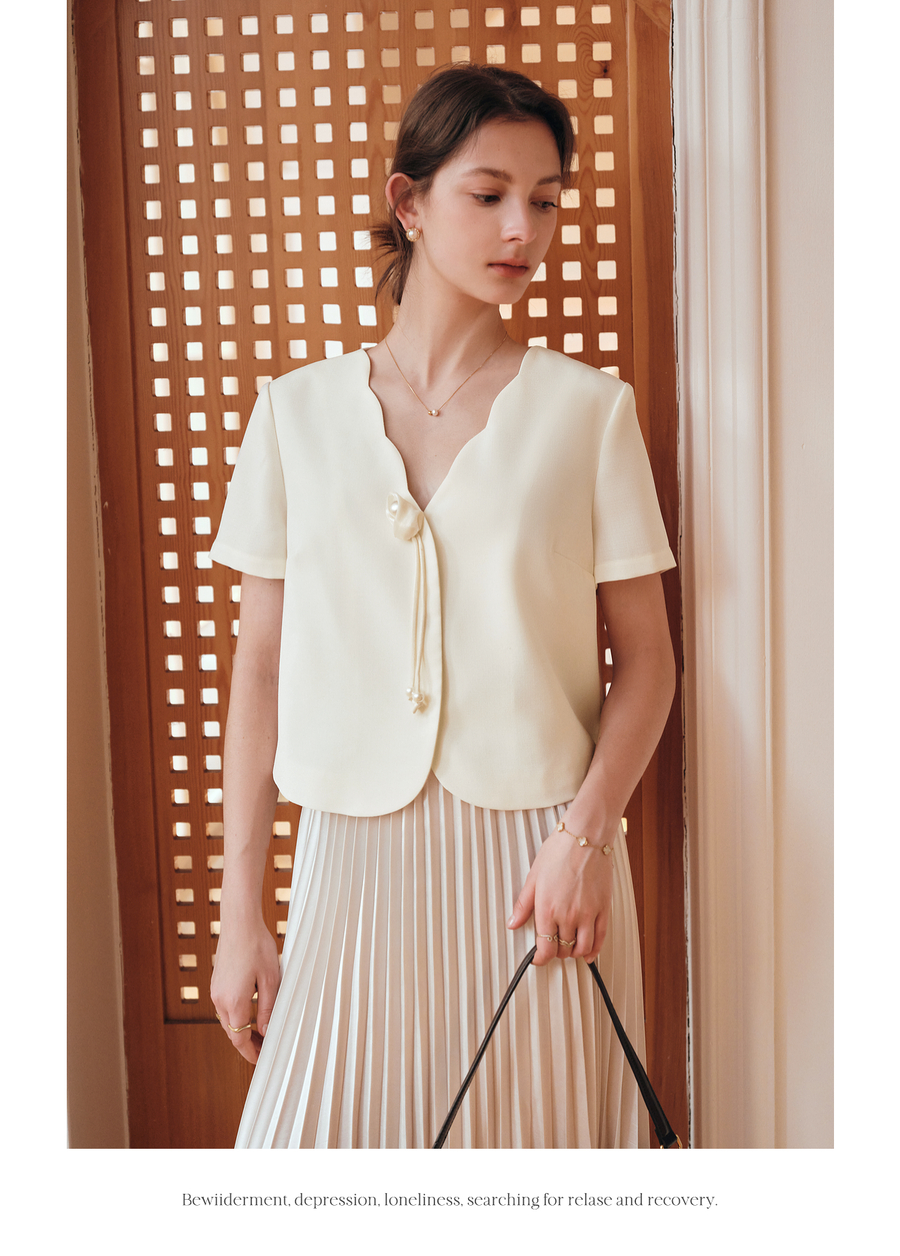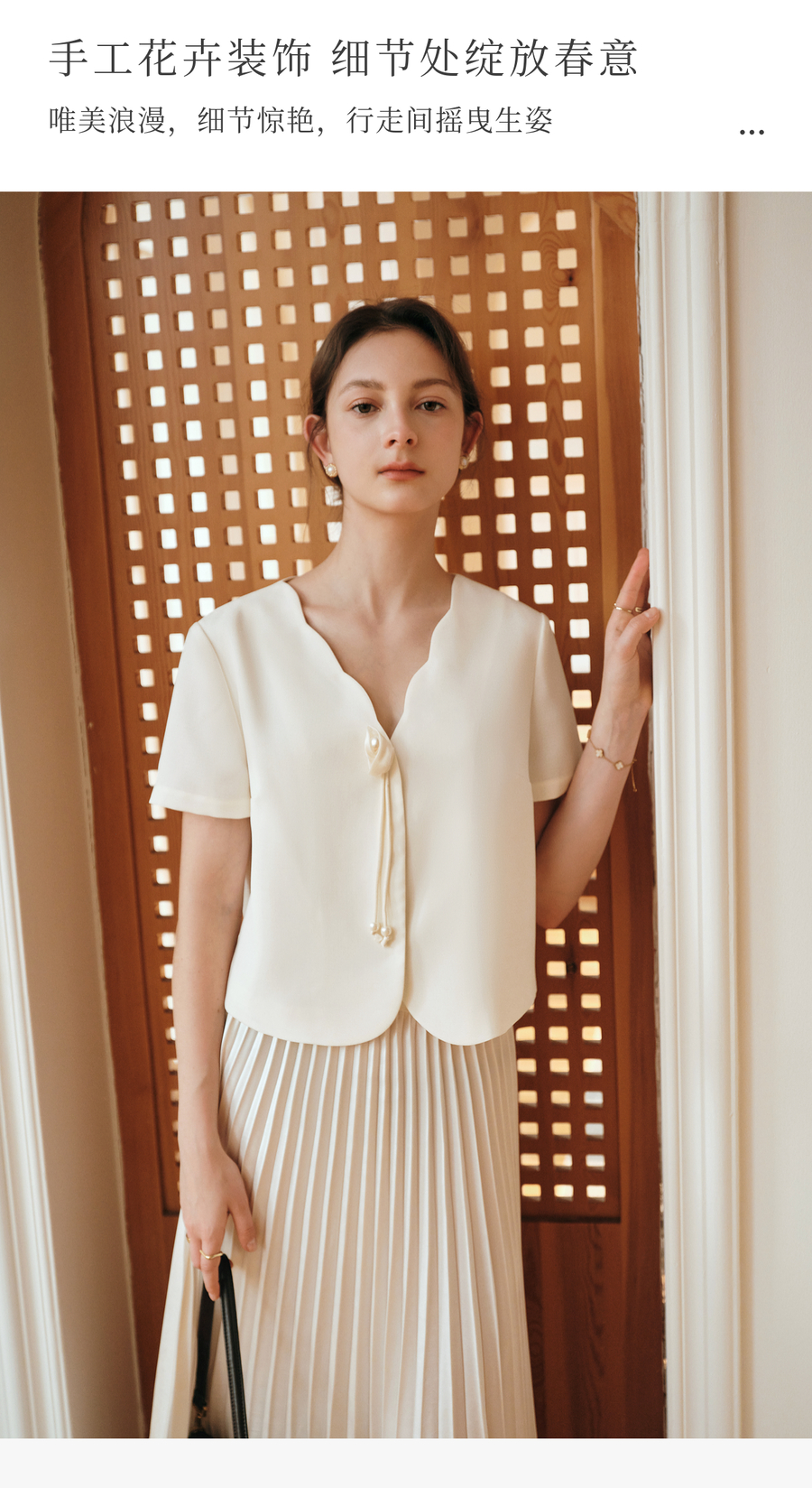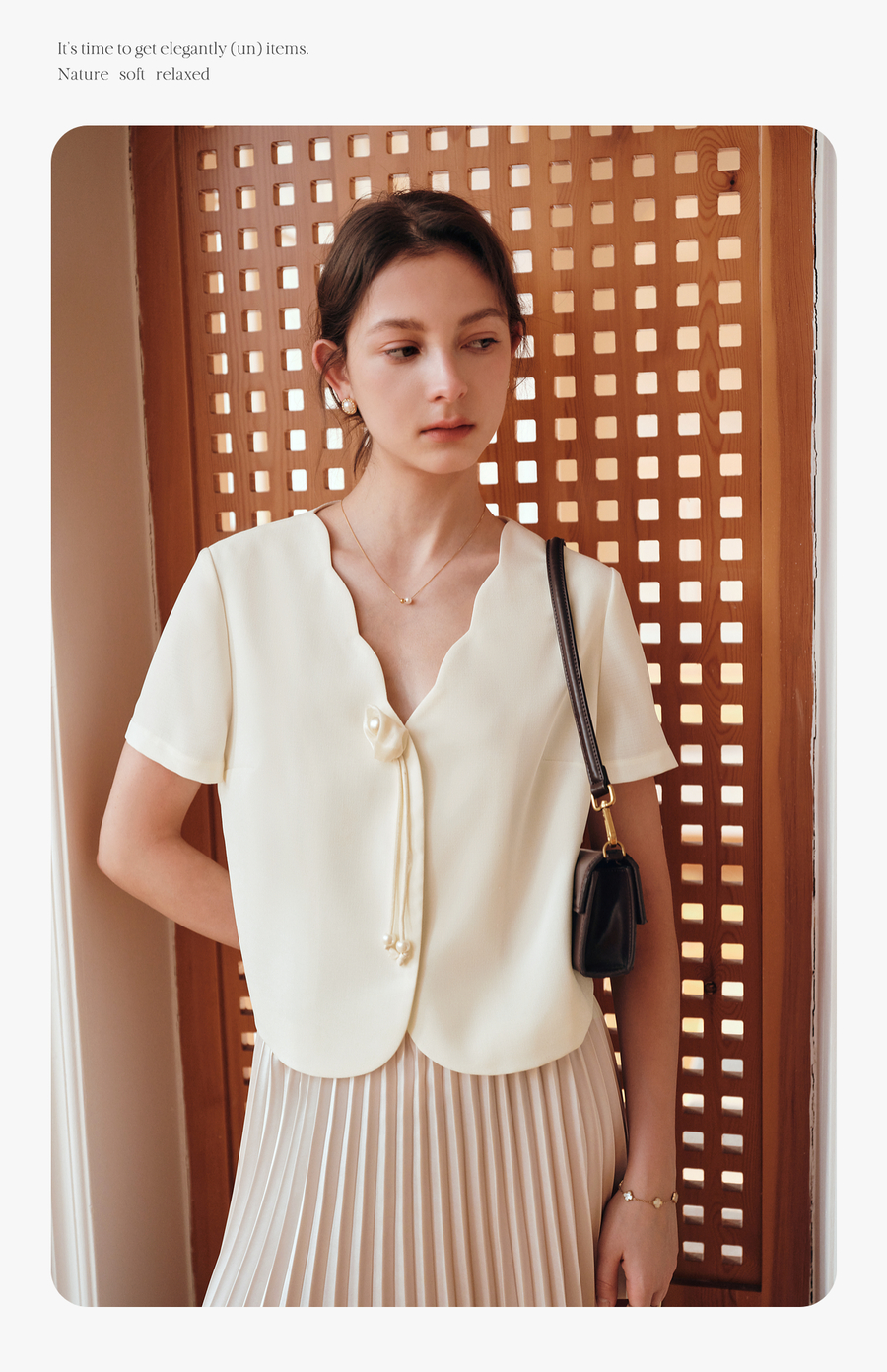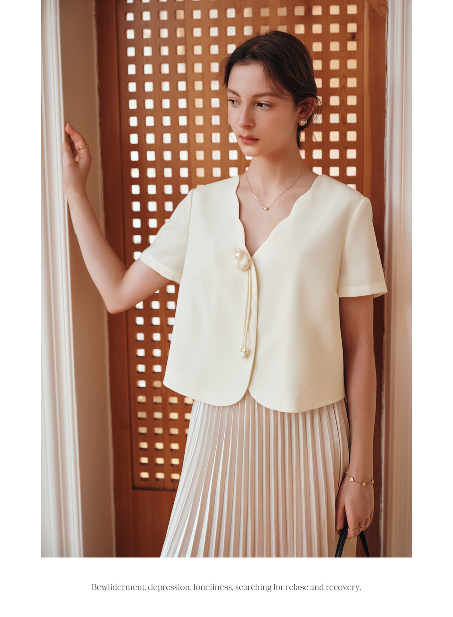 OLrain欧芮儿杏色法式设计感短外套女夏季2025新款波浪边V领上衣