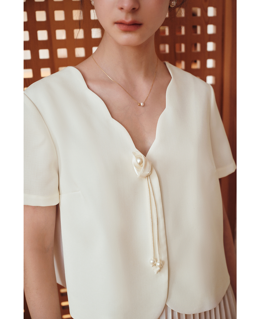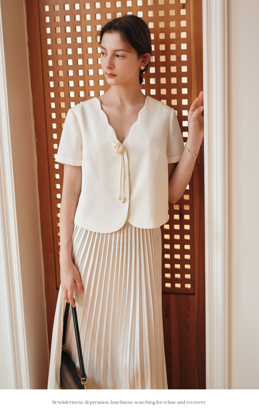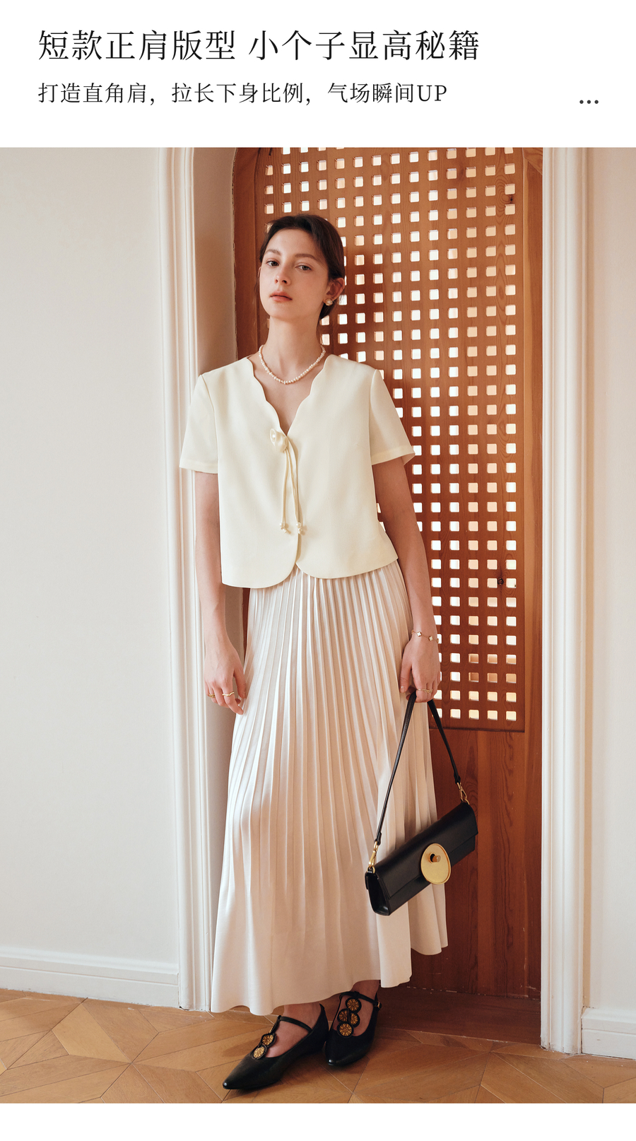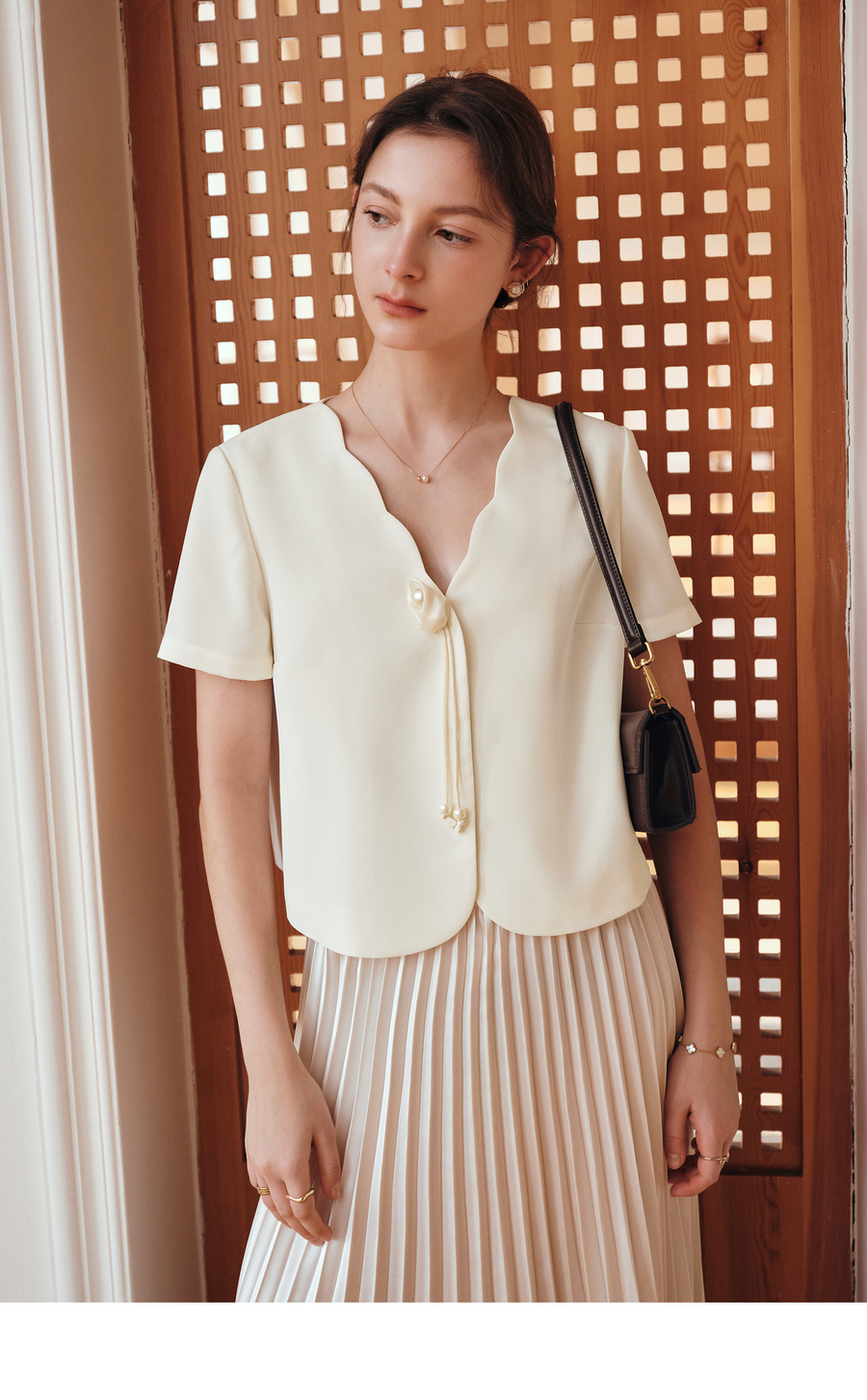 OLrain欧芮儿杏色法式设计感短外套女夏季2025新款波浪边V领上衣