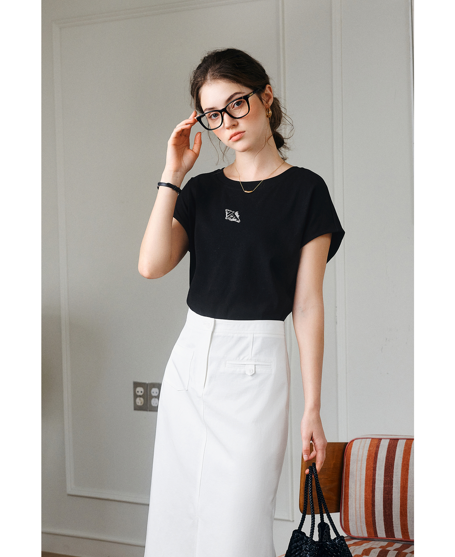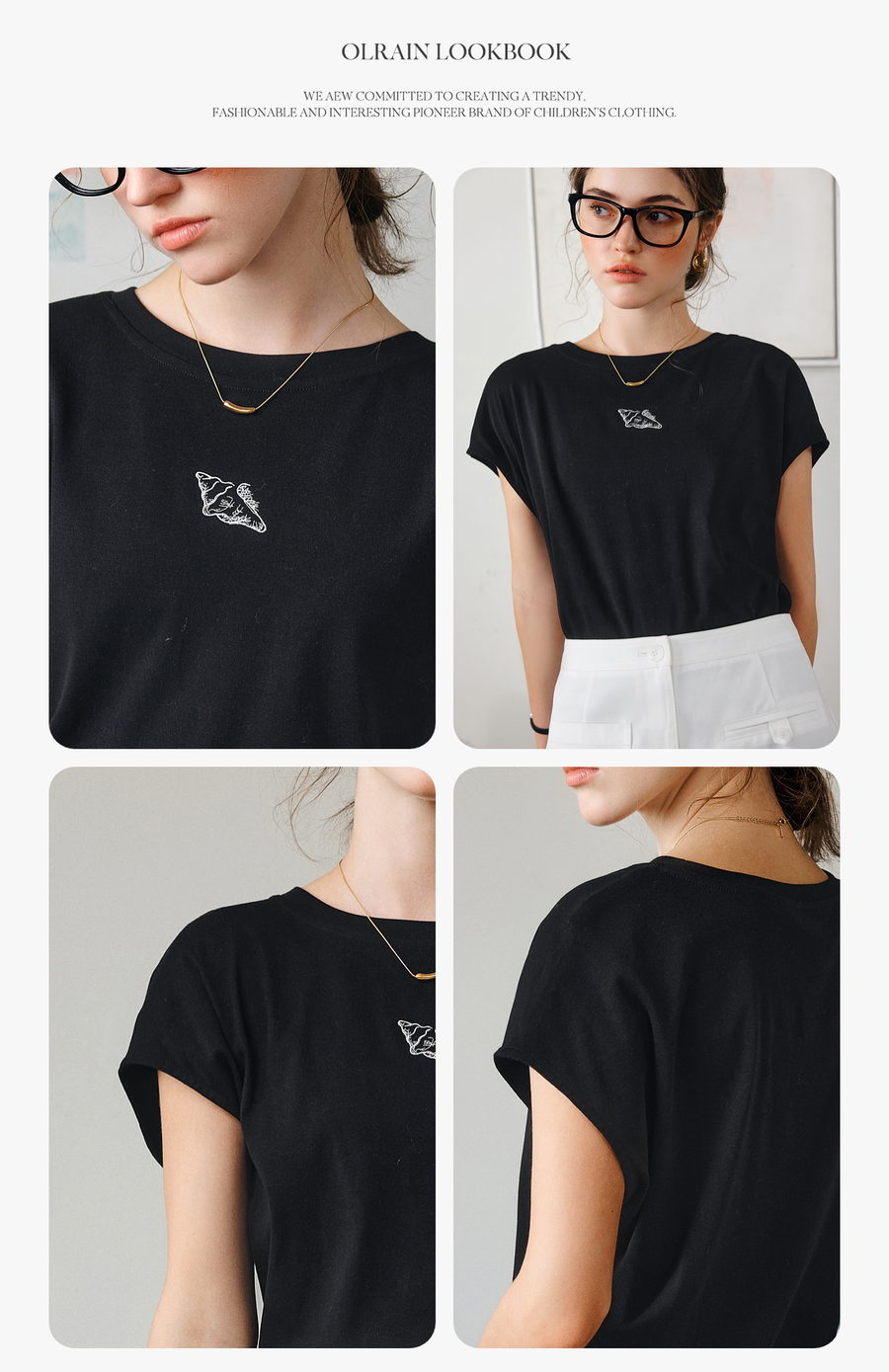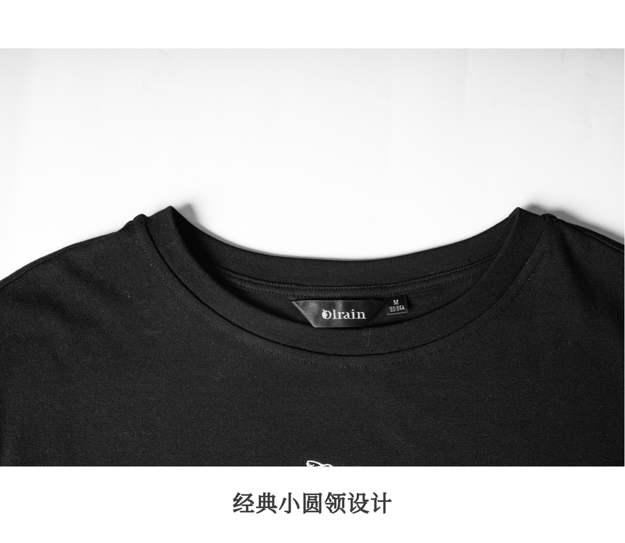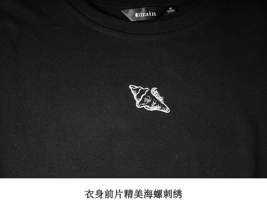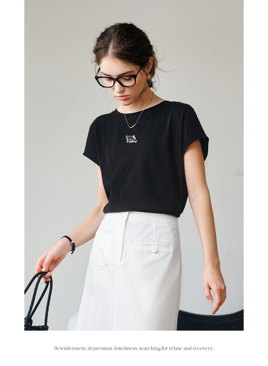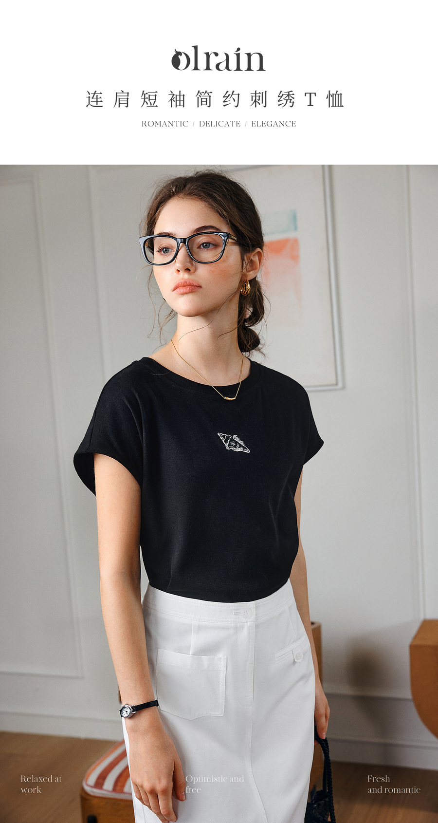 欧芮儿OLrain2025夏季新款连肩短袖简约刺绣T恤女黑色设计感上衣