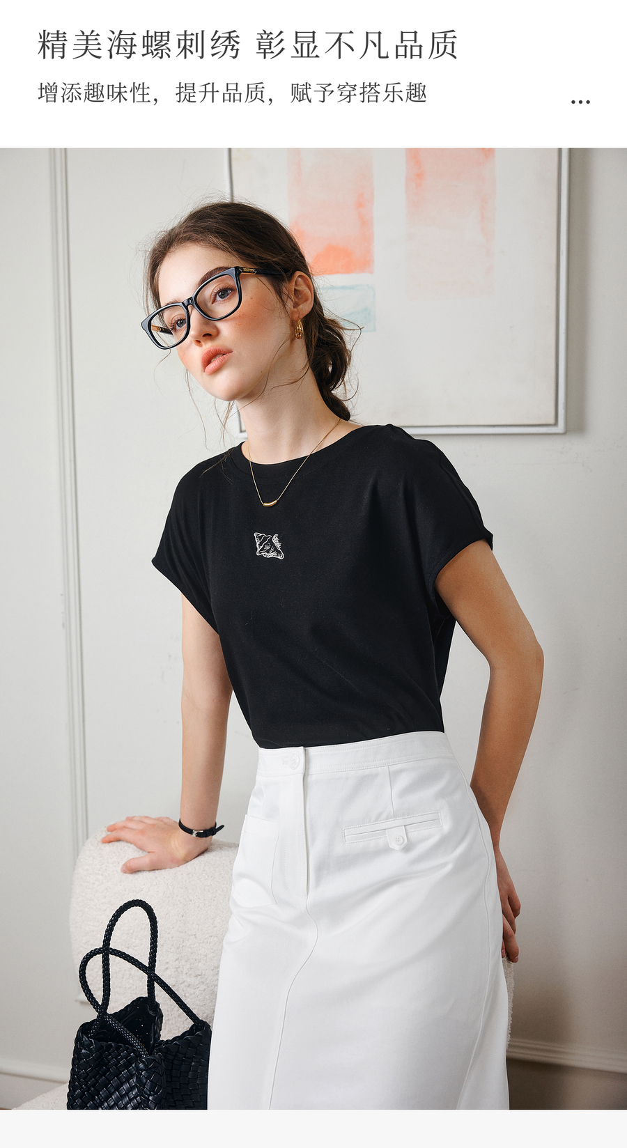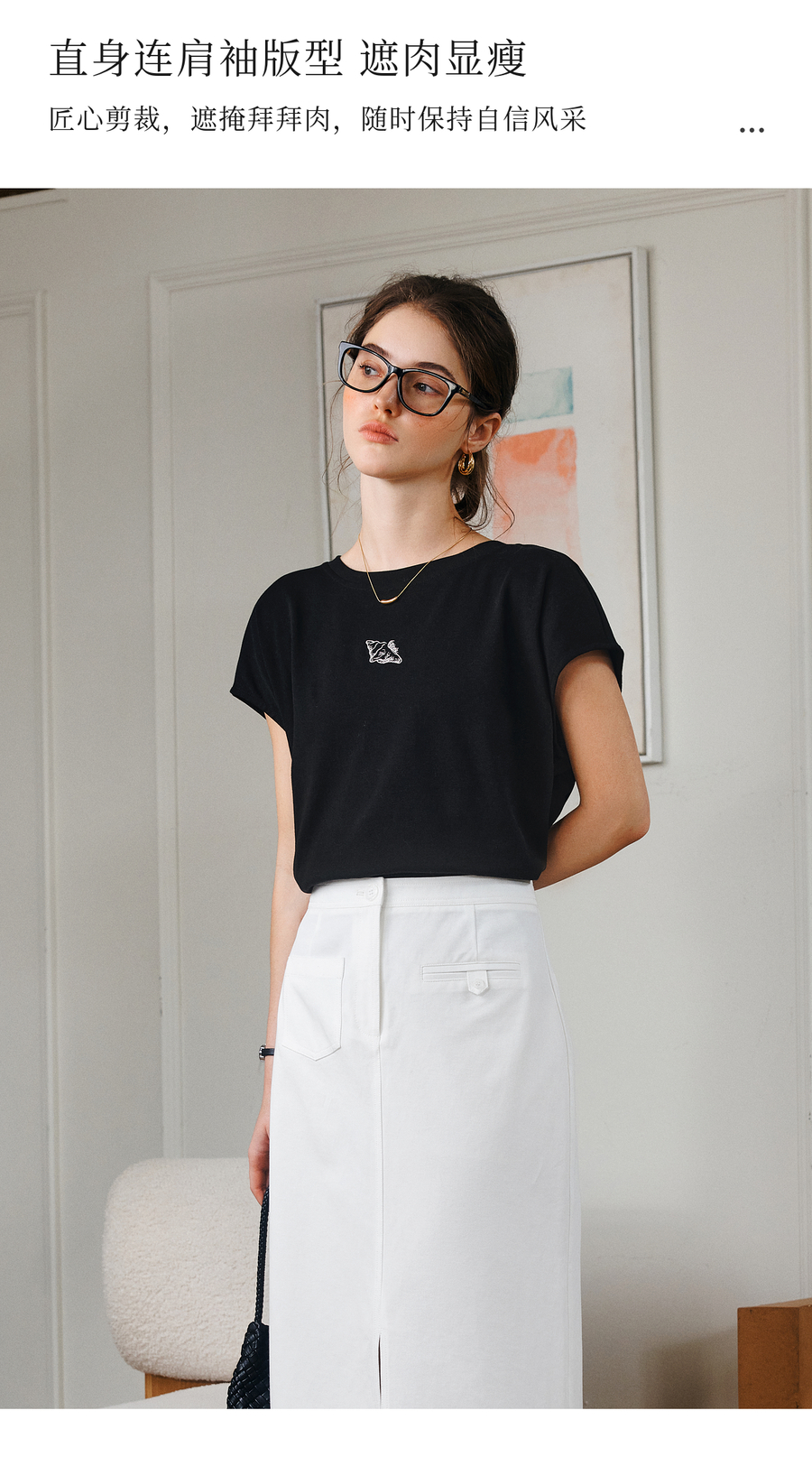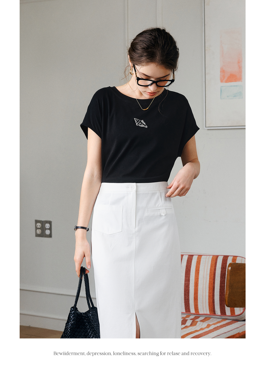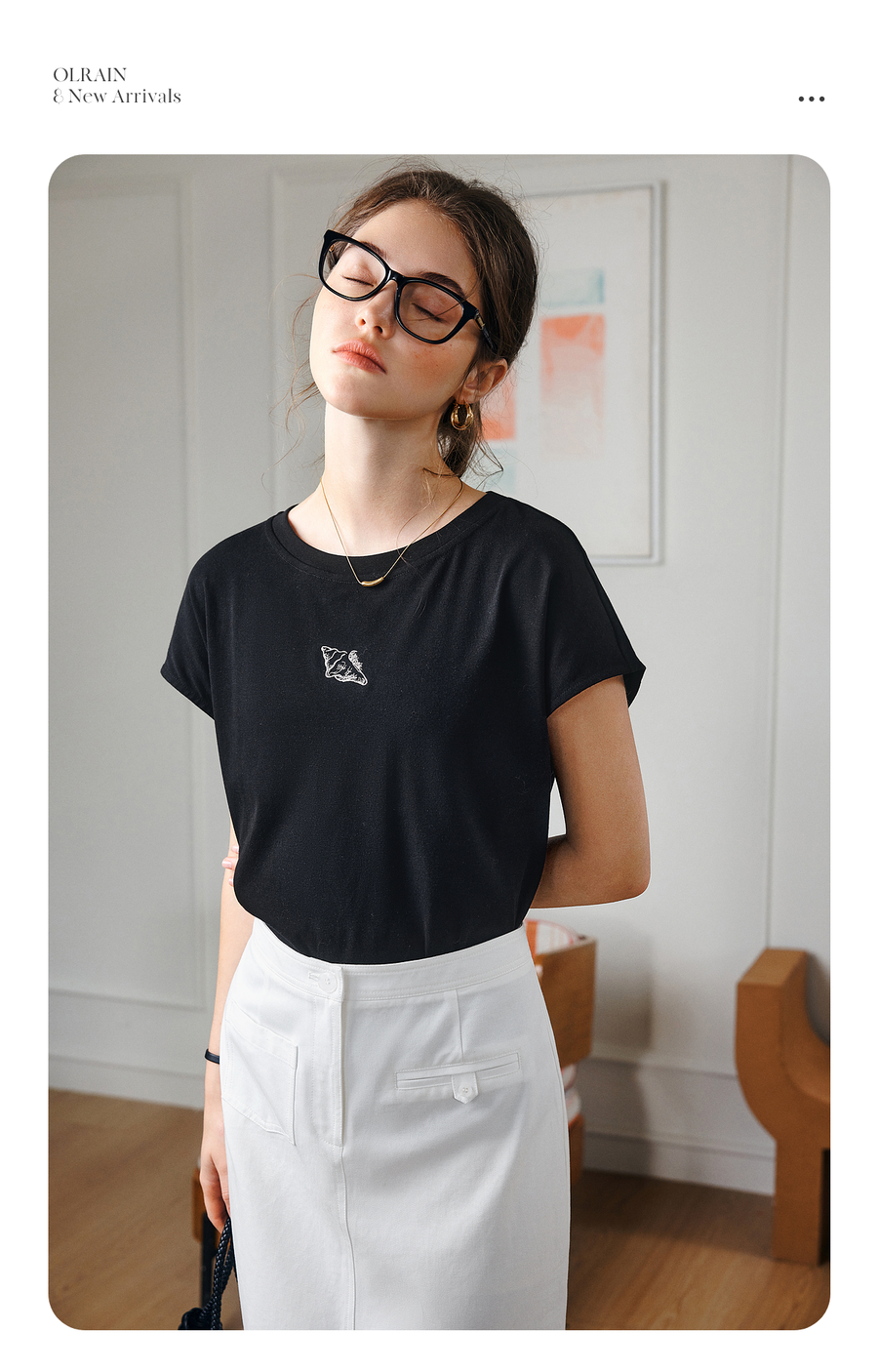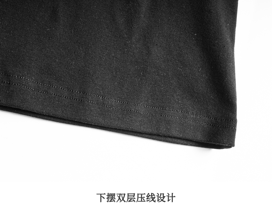 欧芮儿OLrain2025夏季新款连肩短袖简约刺绣T恤女黑色设计感上衣