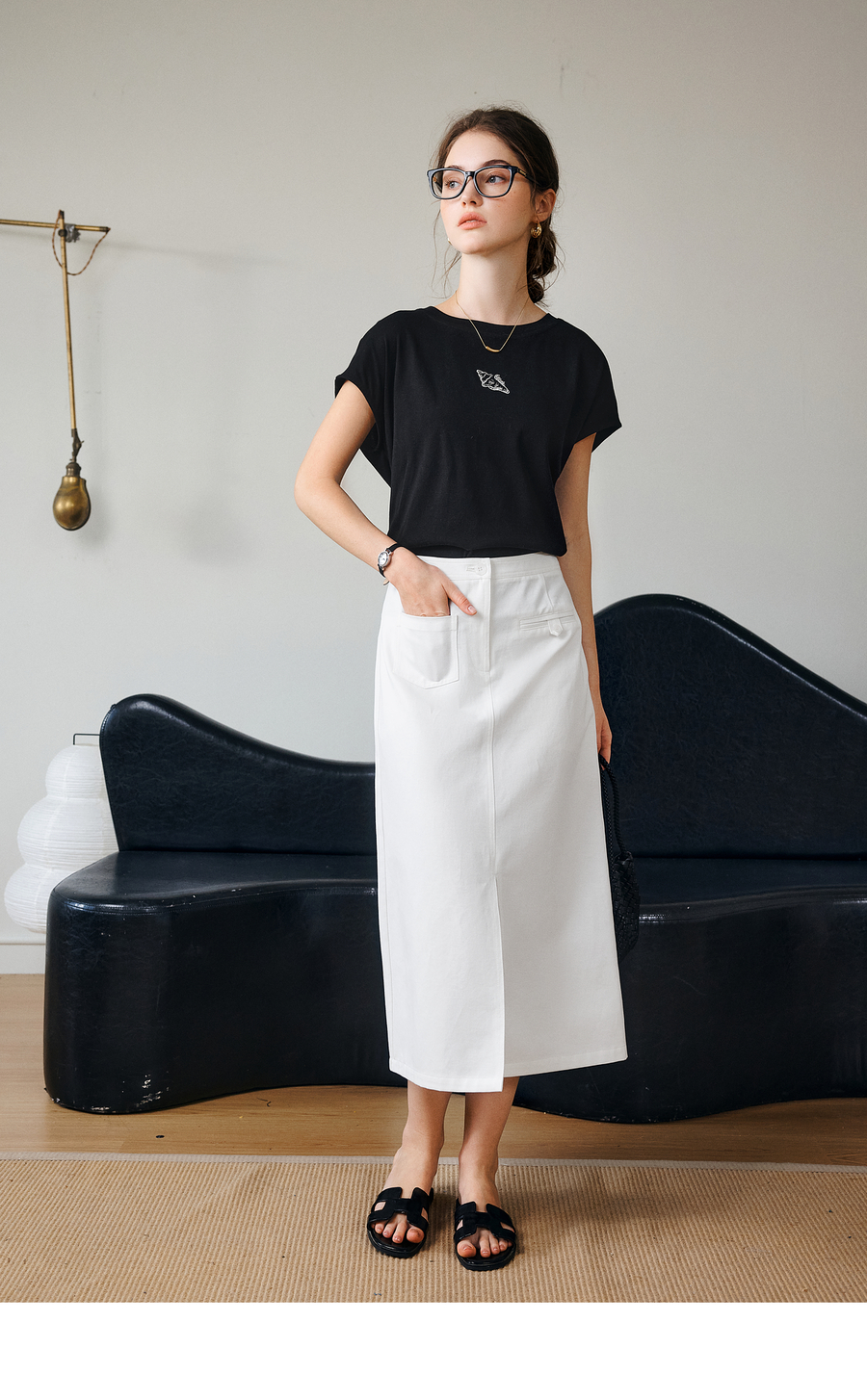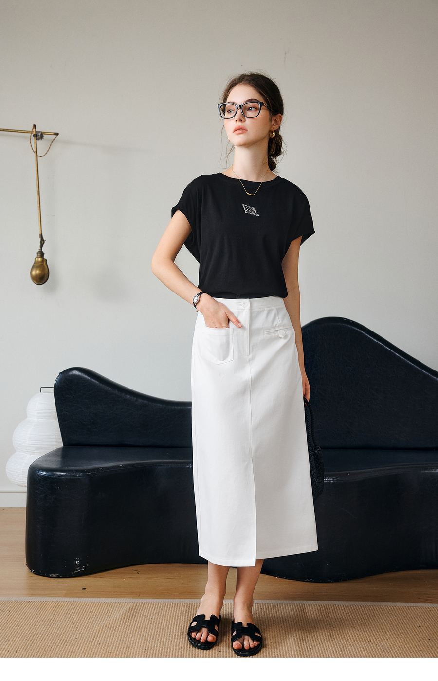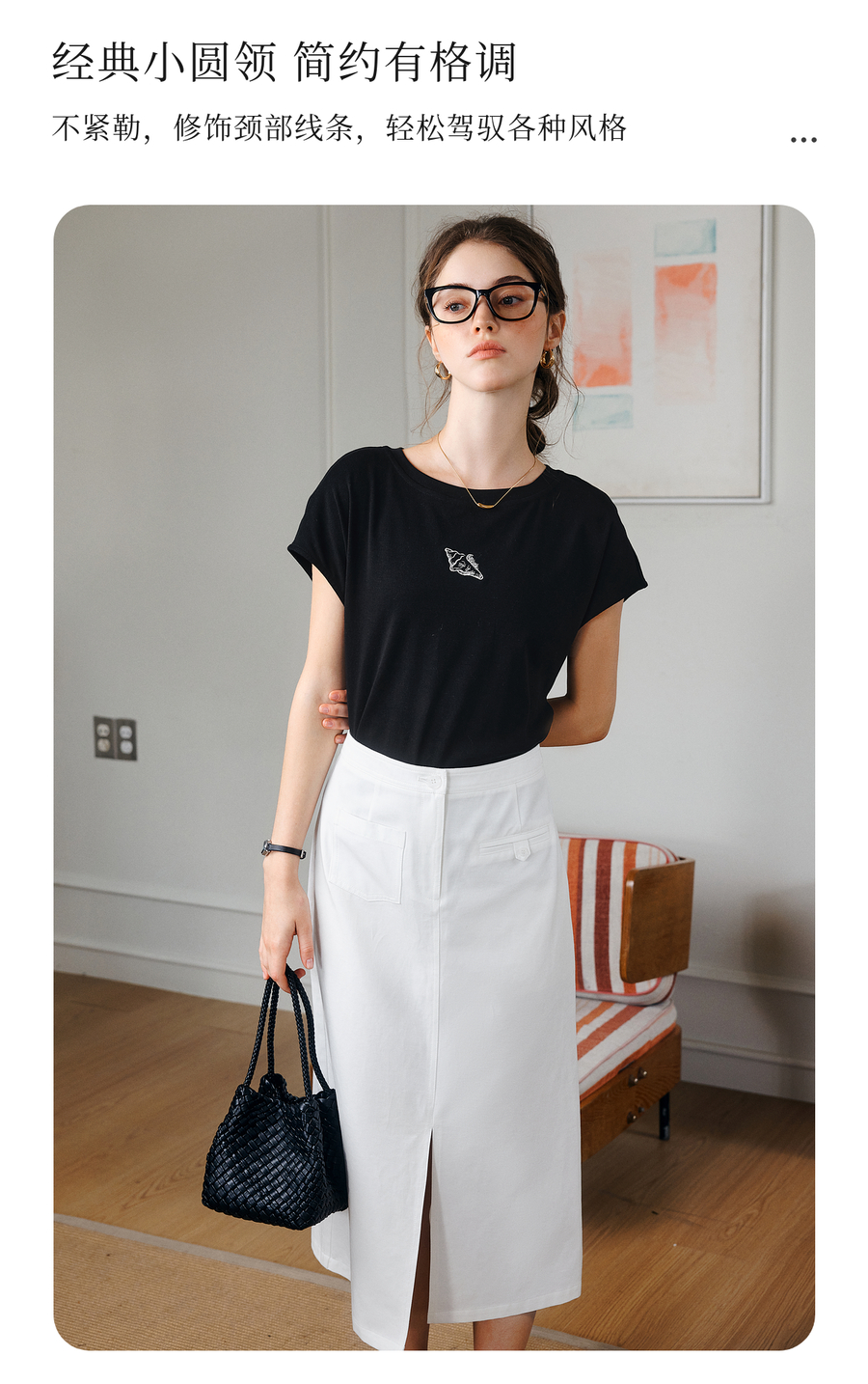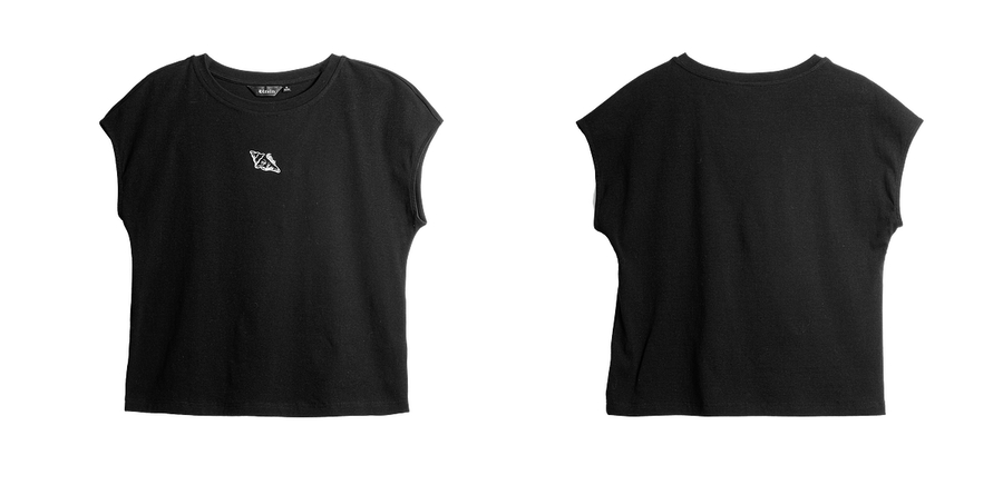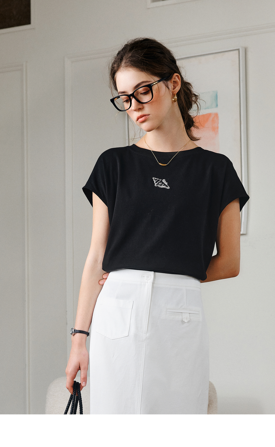 欧芮儿OLrain2025夏季新款连肩短袖简约刺绣T恤女黑色设计感上衣