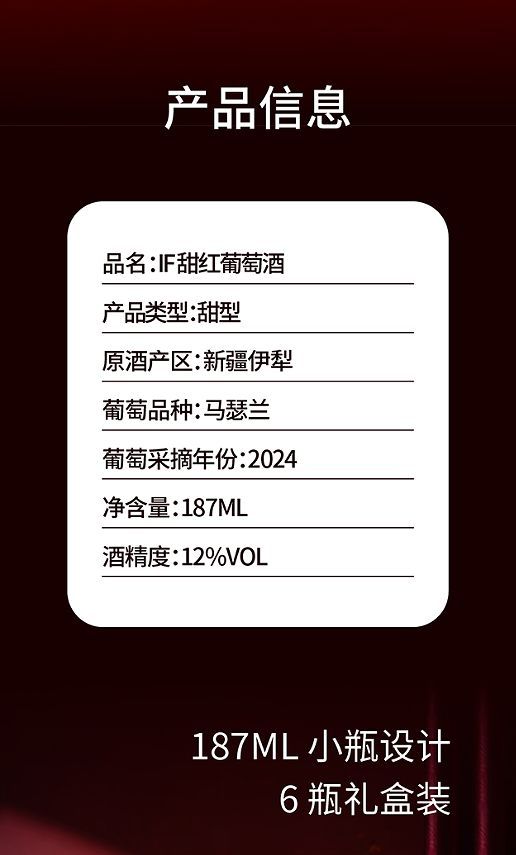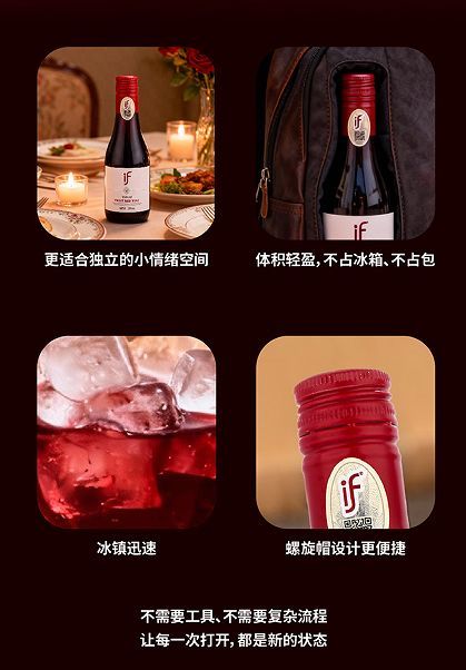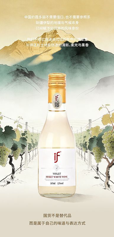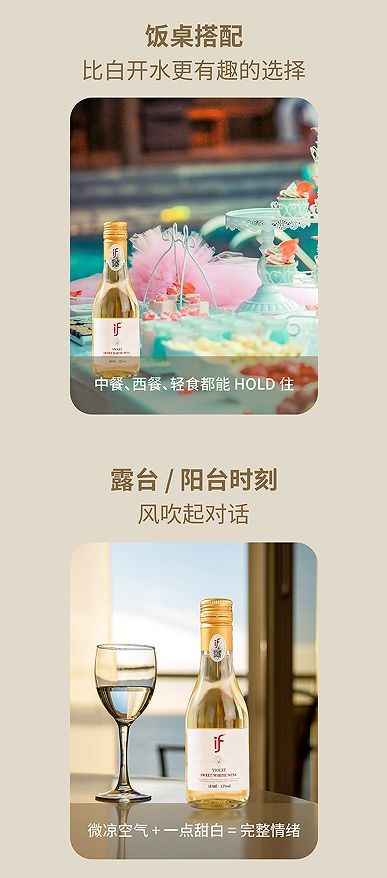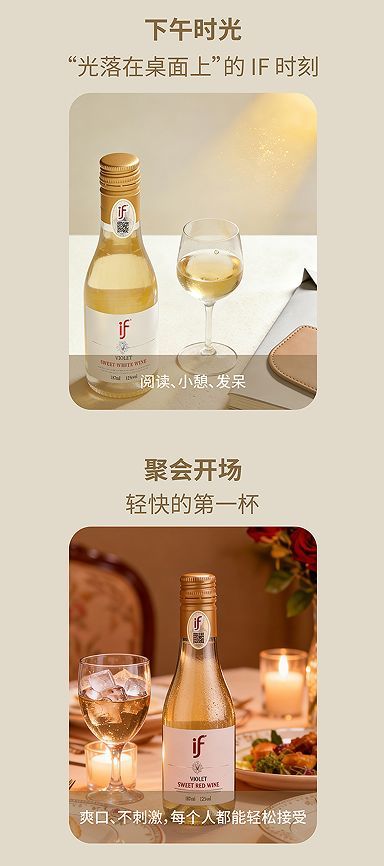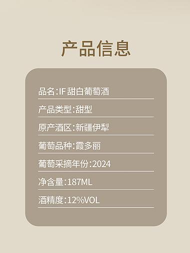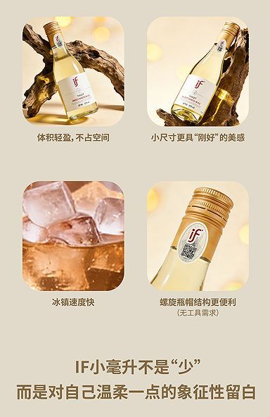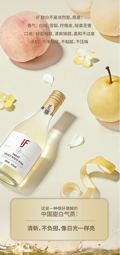 甜白:if甜白——来自天山光里的新疆伊犁霞多丽,白桃雪梨的清新果香配上 187ml小毫升设计,轻盈好携带、不占空间、更少负担地享受一点微甜气氛