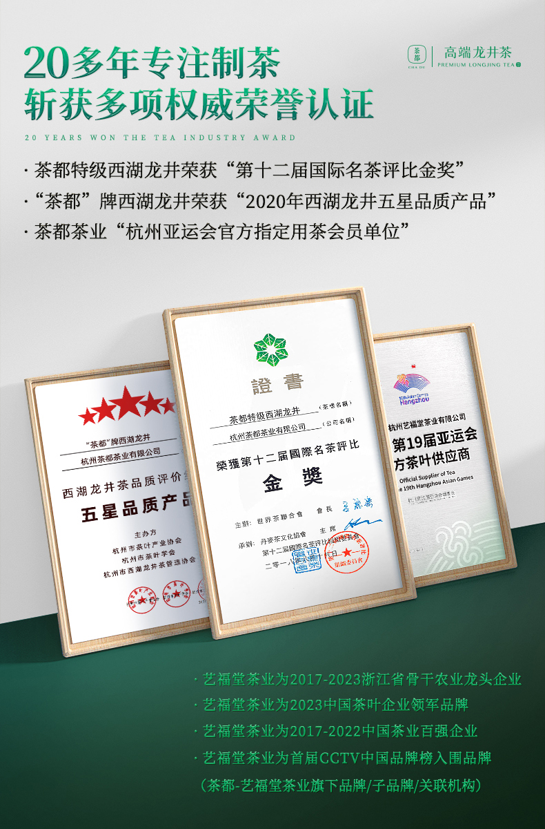 - “艺福堂茶业”创立于2008年,是一家集生产、销售、科研为一体的现代茶业企业,主打西湖龙井,兼营世界各地名优茗茶及花草茶,是中国茶行业为数不多的年销售额过5亿的品牌之一,是杭州亚运会官方指定用茶!