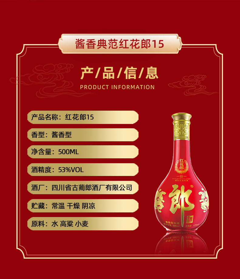 郎酒 红花郎 红十五 酱香型白酒 500ml 53%vol