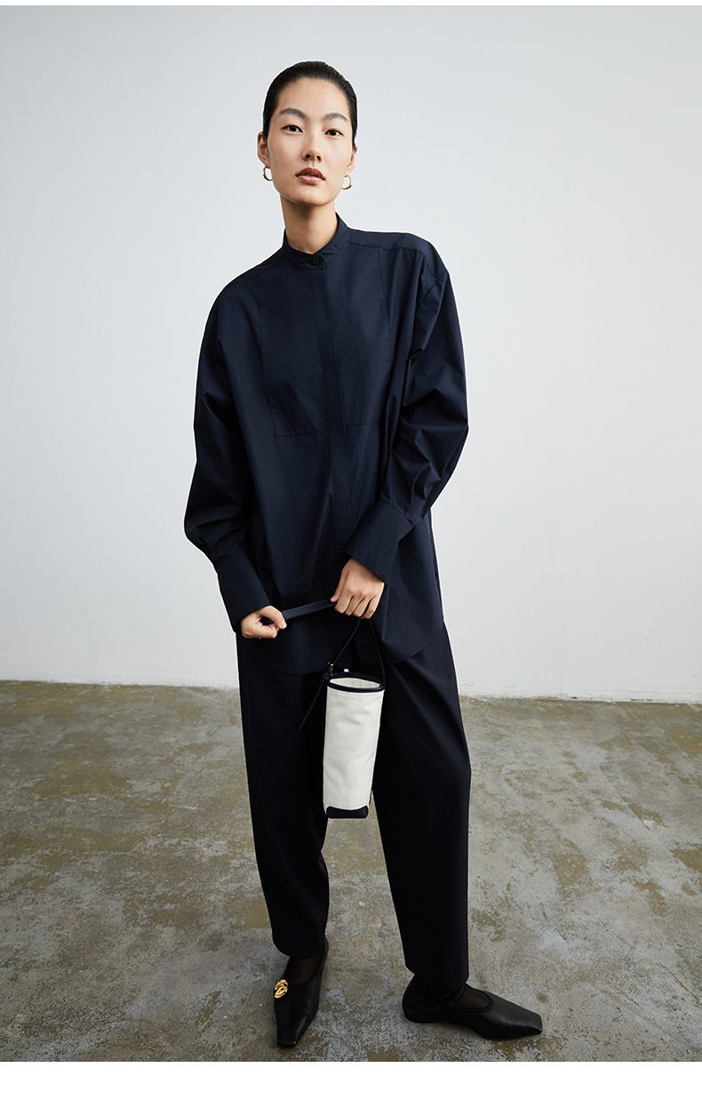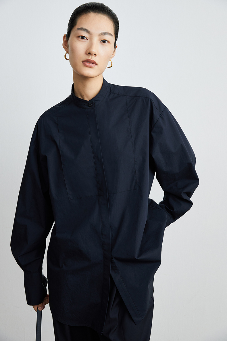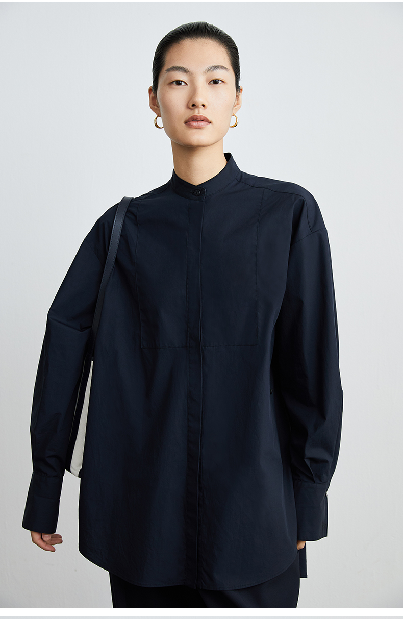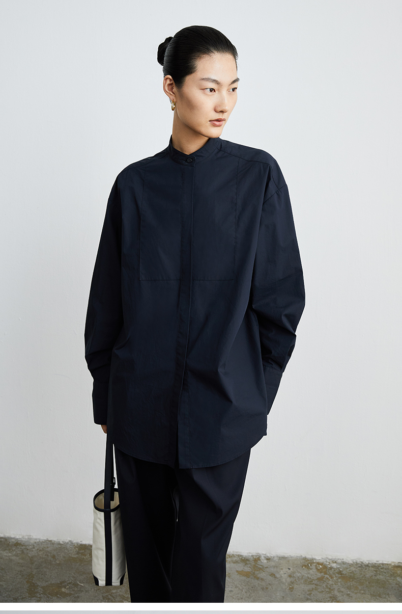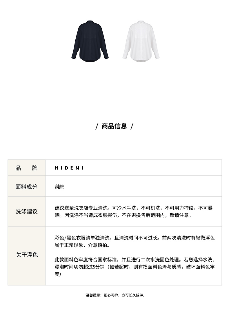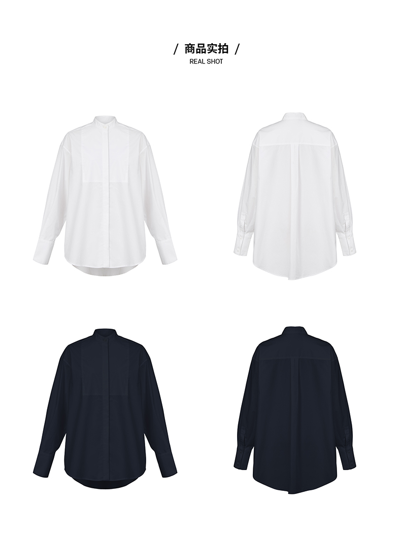 HIDEMI 经典拼接款圆领廓形衬衫 深藏蓝/白色
