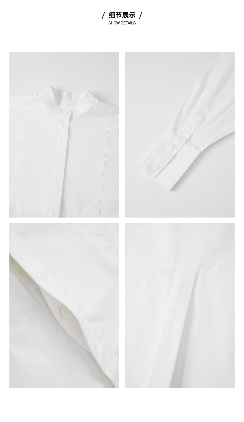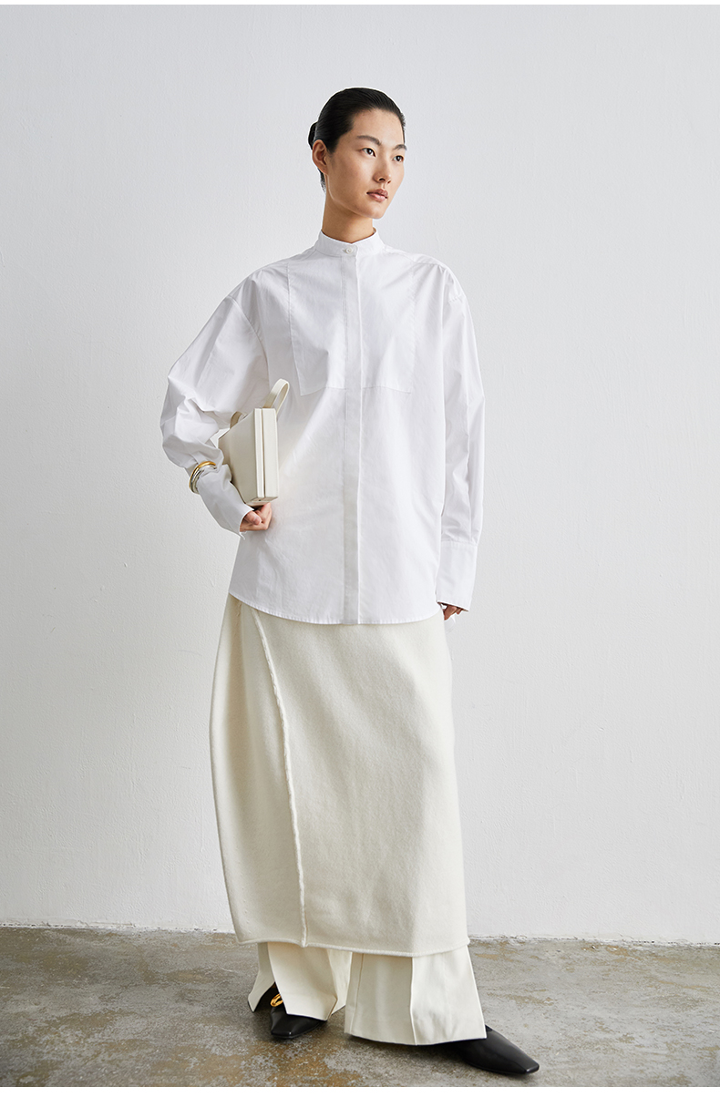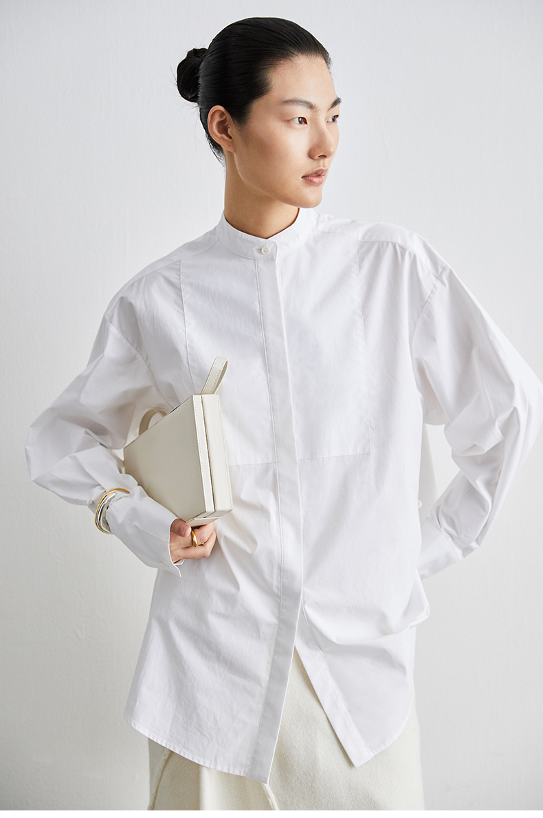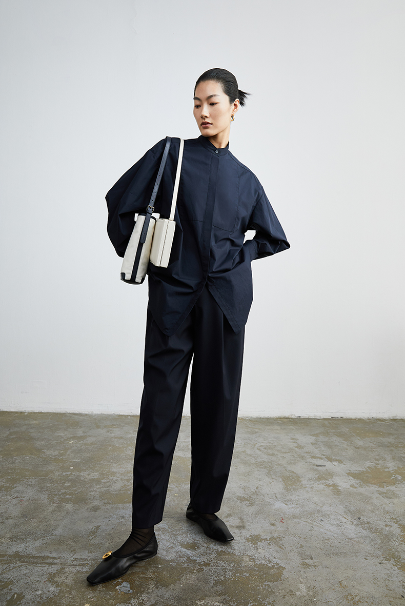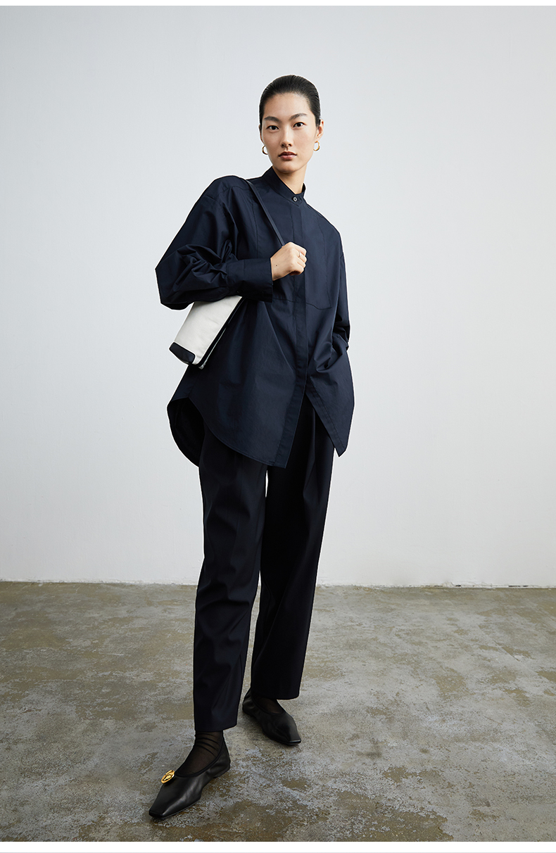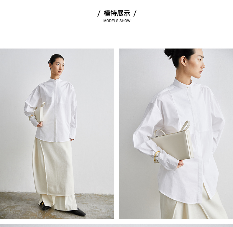 HIDEMI 经典拼接款圆领廓形衬衫 深藏蓝/白色