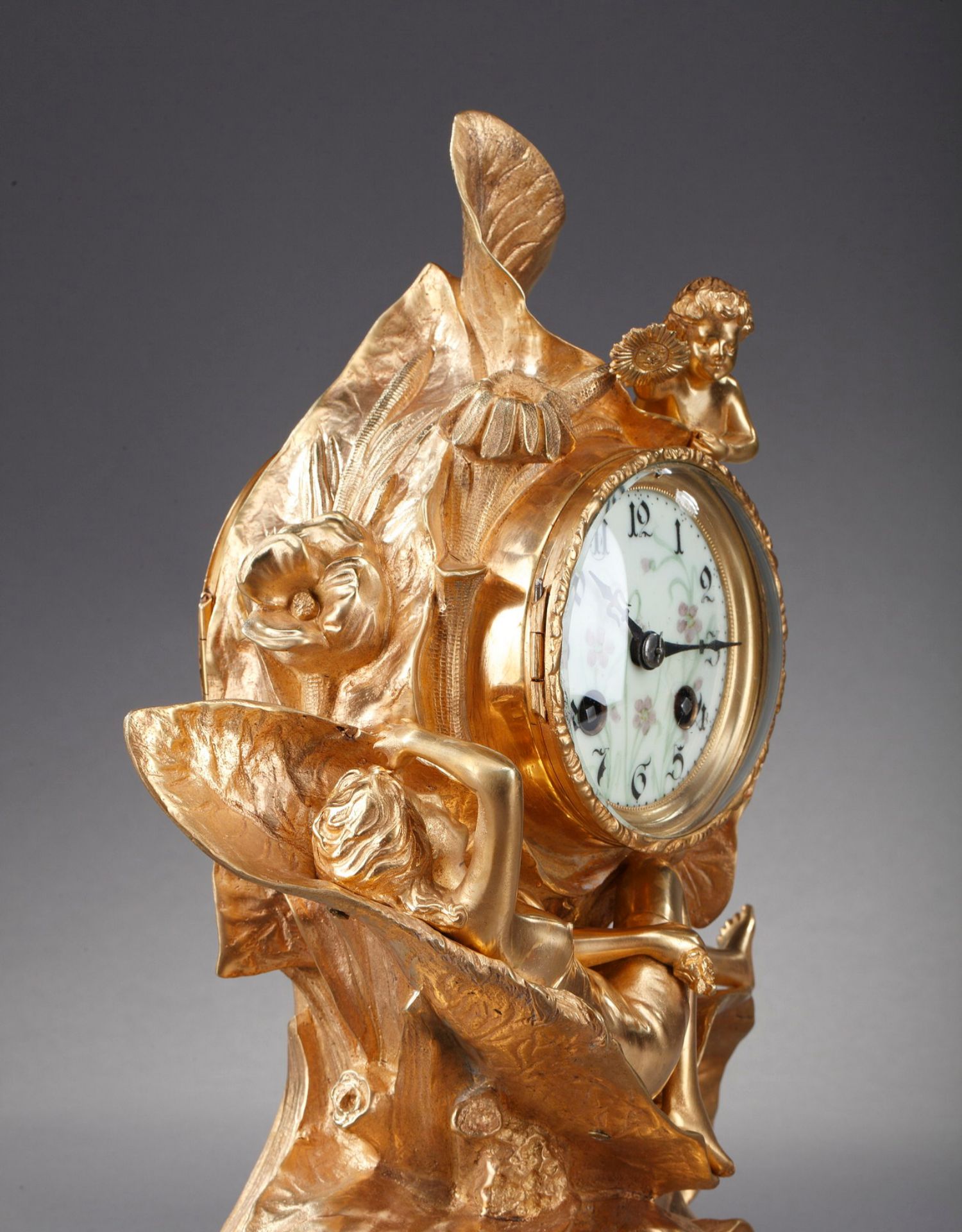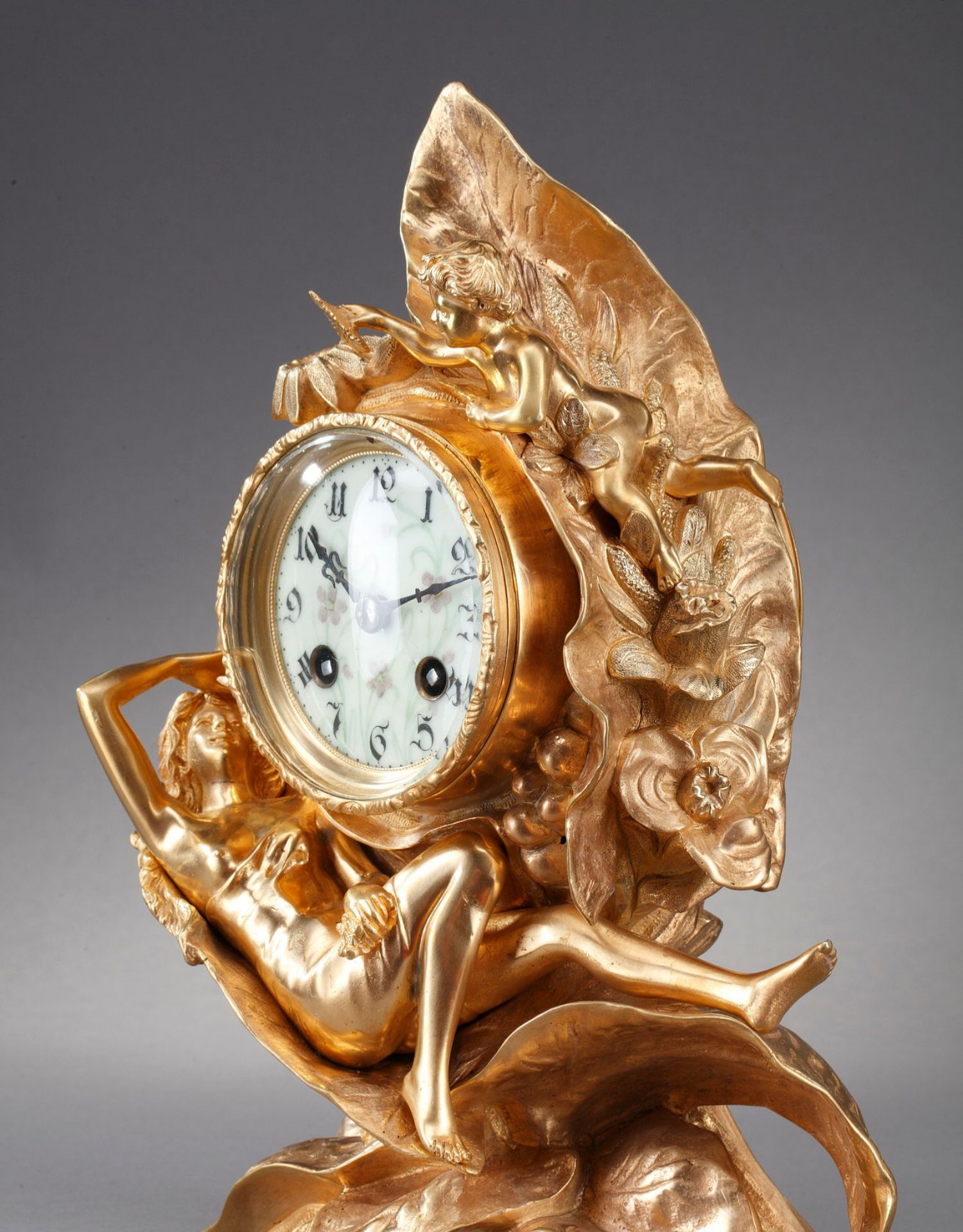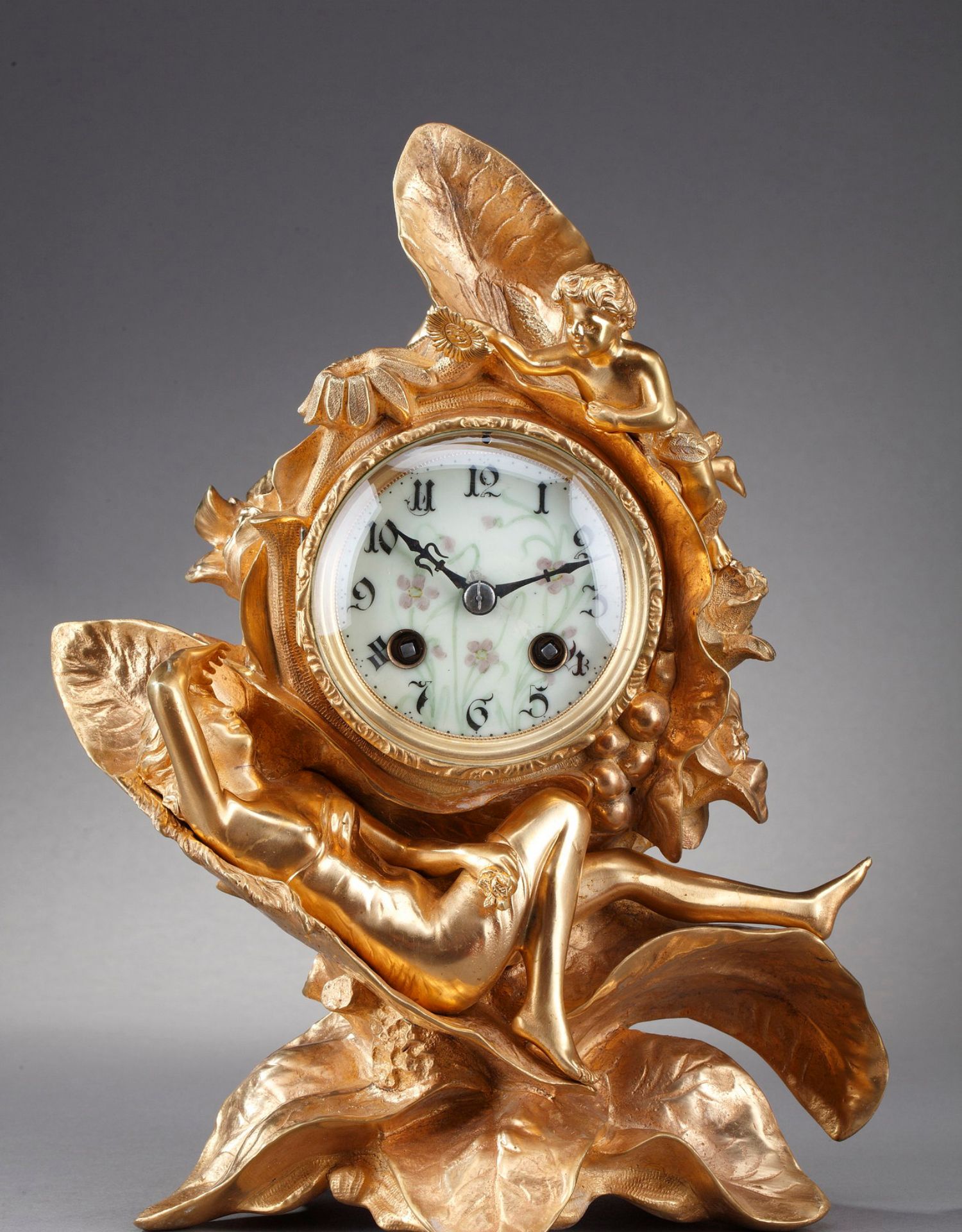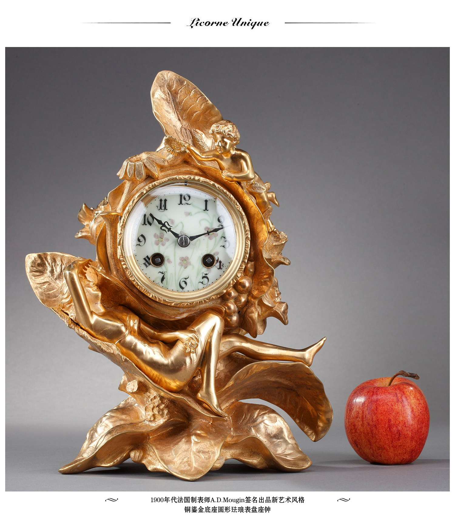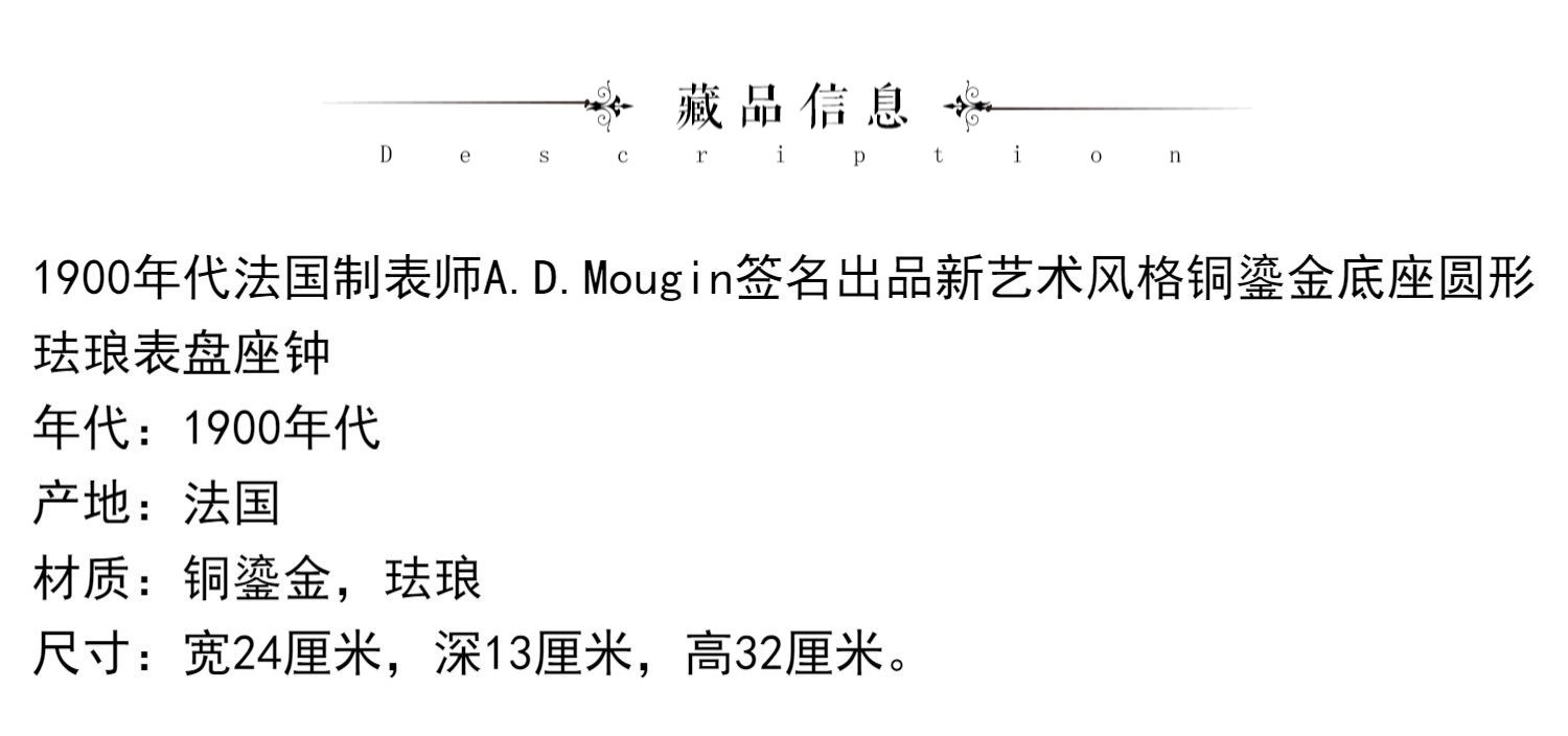 独角鹿西洋古董A.D. Mougin新艺术风铜鎏金底座圆形珐琅表盘座钟