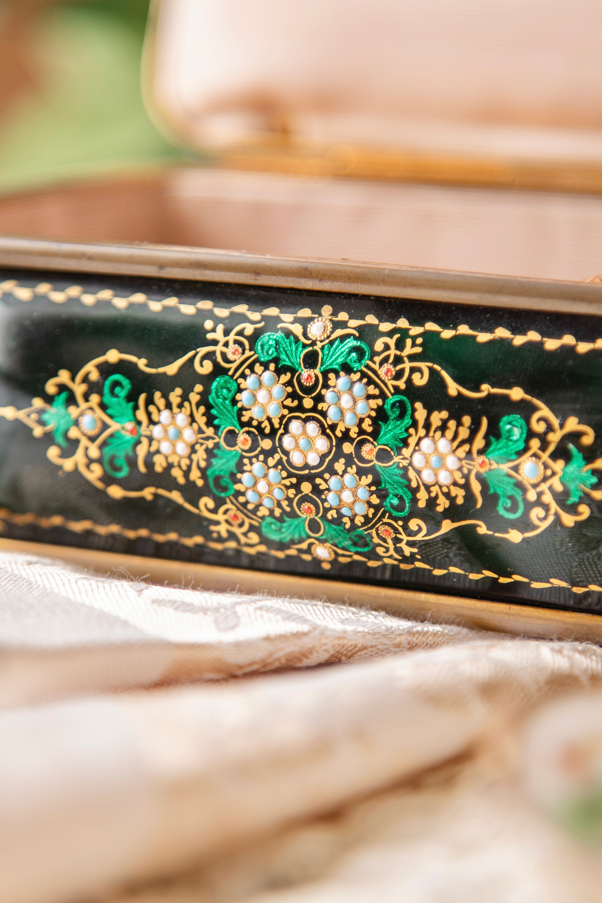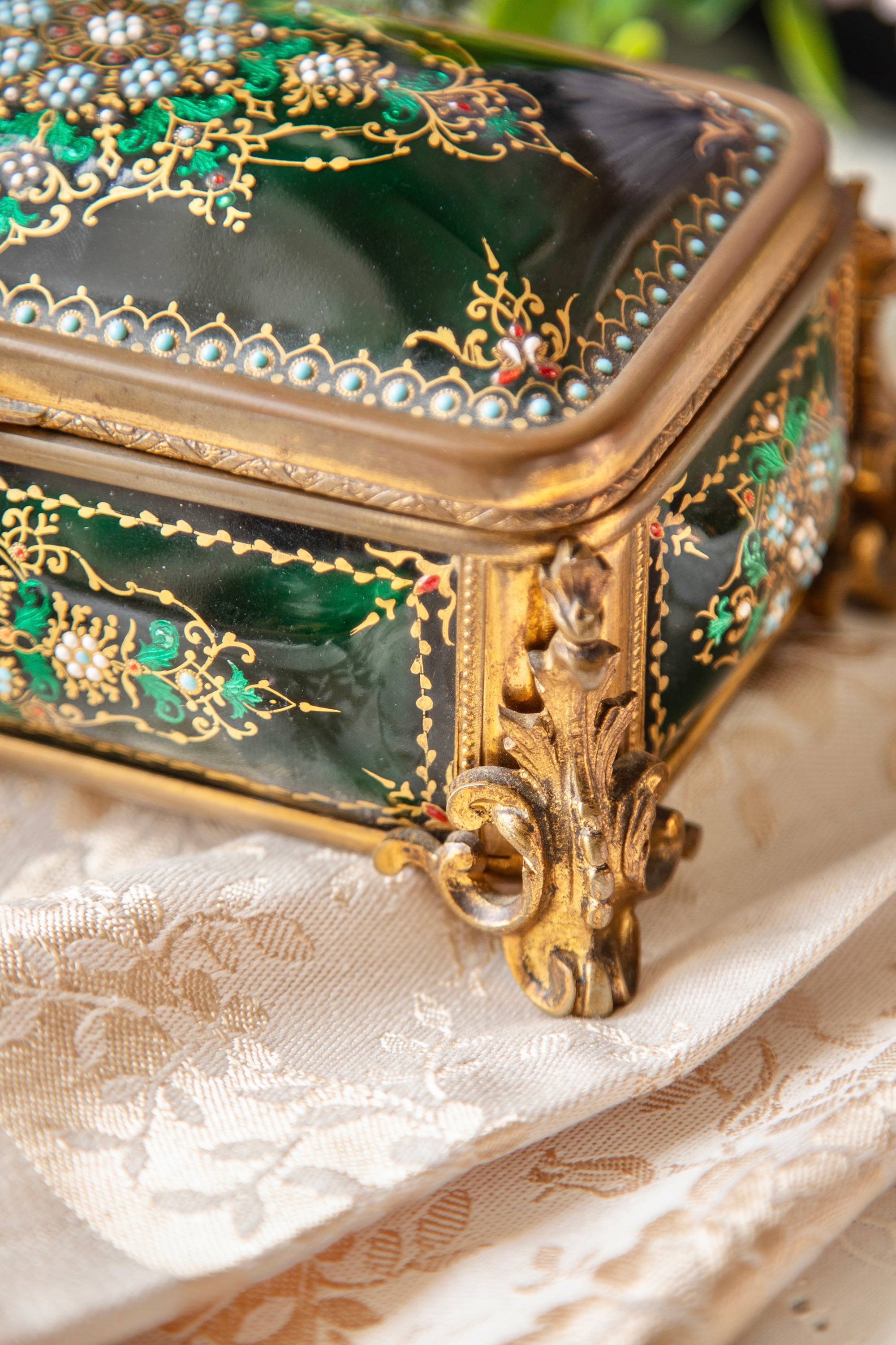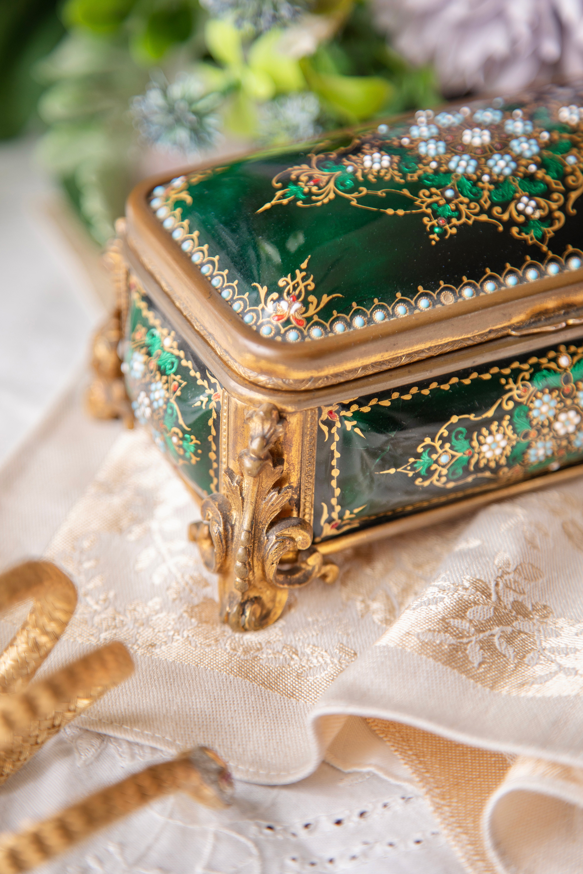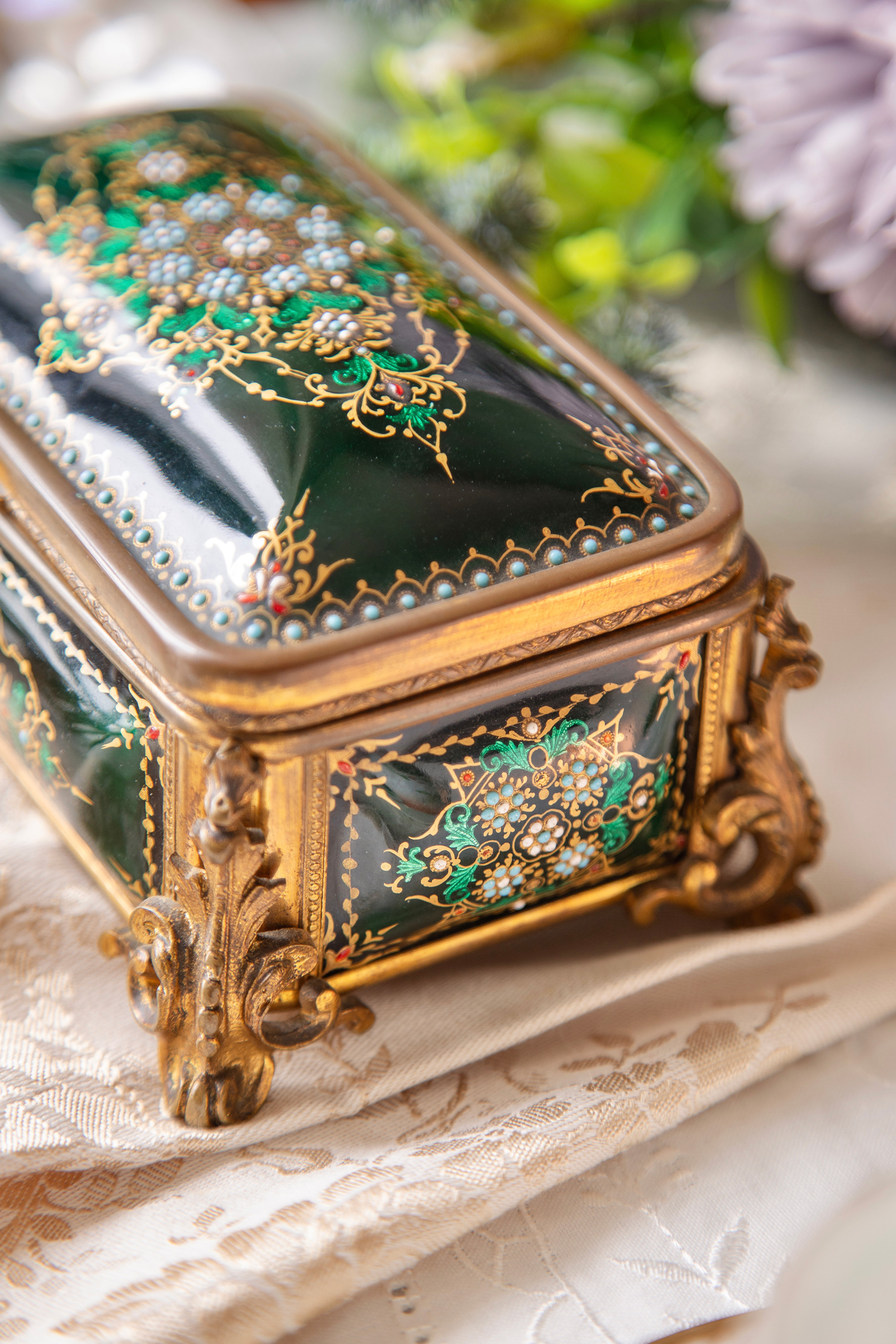 19世纪法国出品铜鎏金精雕装饰黑地卷叶花卉主题布雷松珐琅彩绘描金珍宝盒