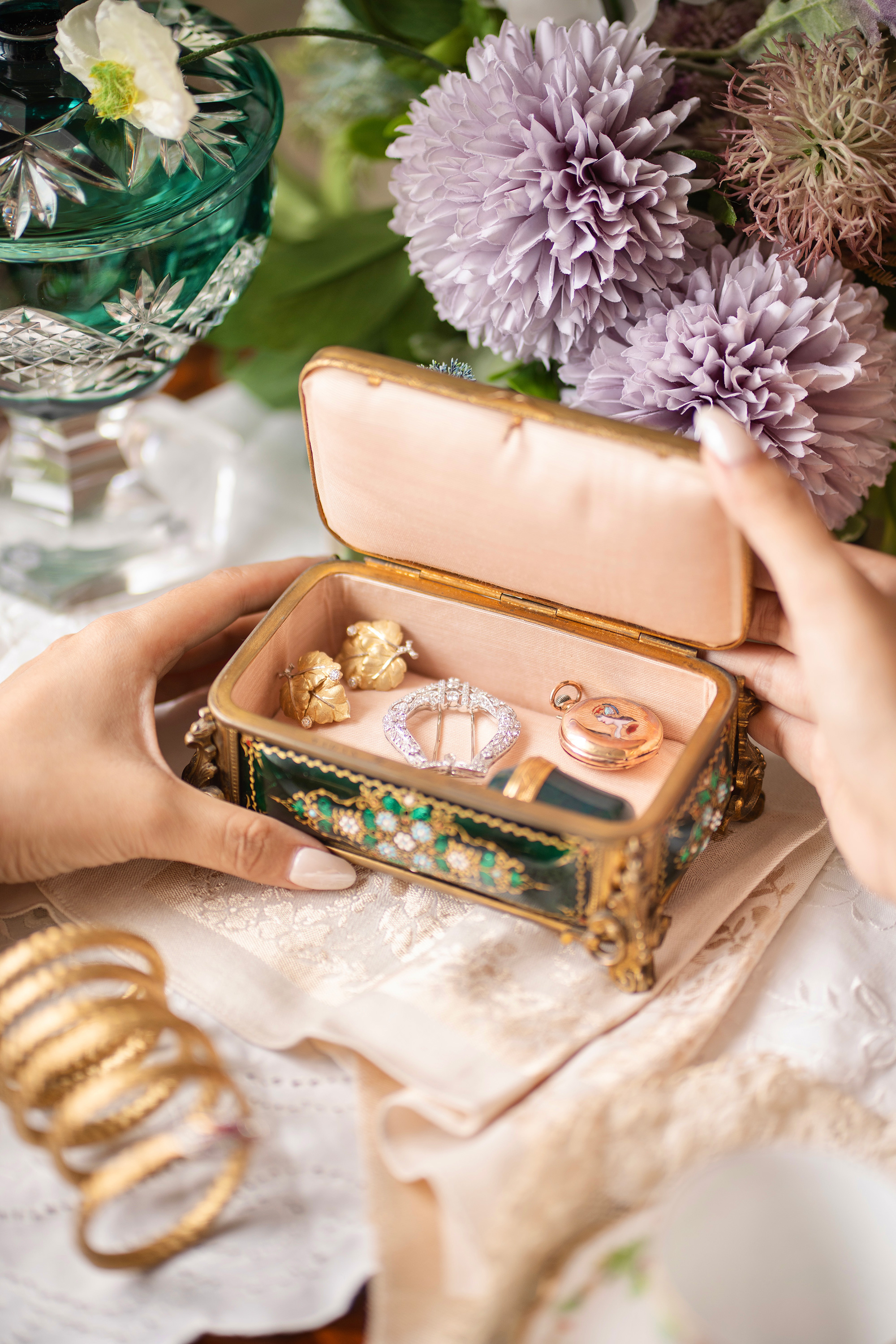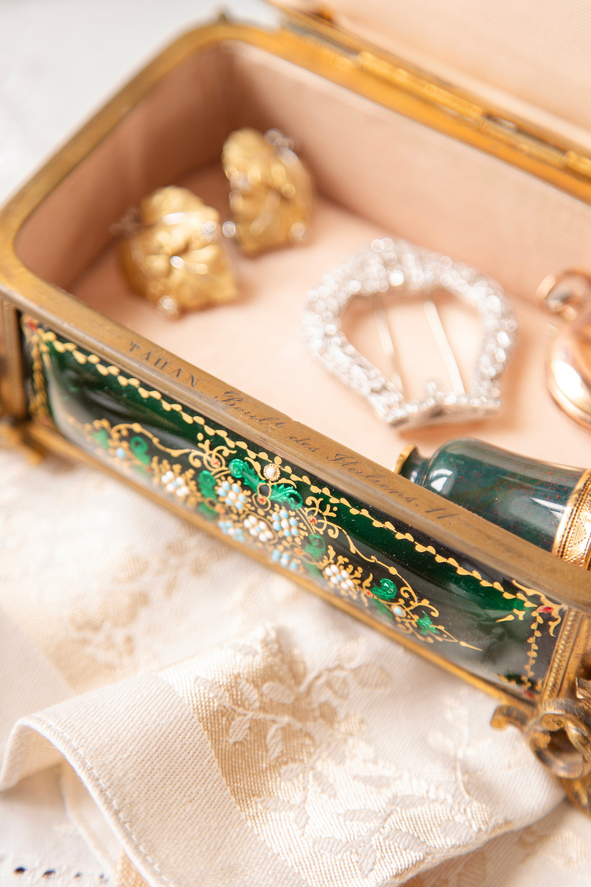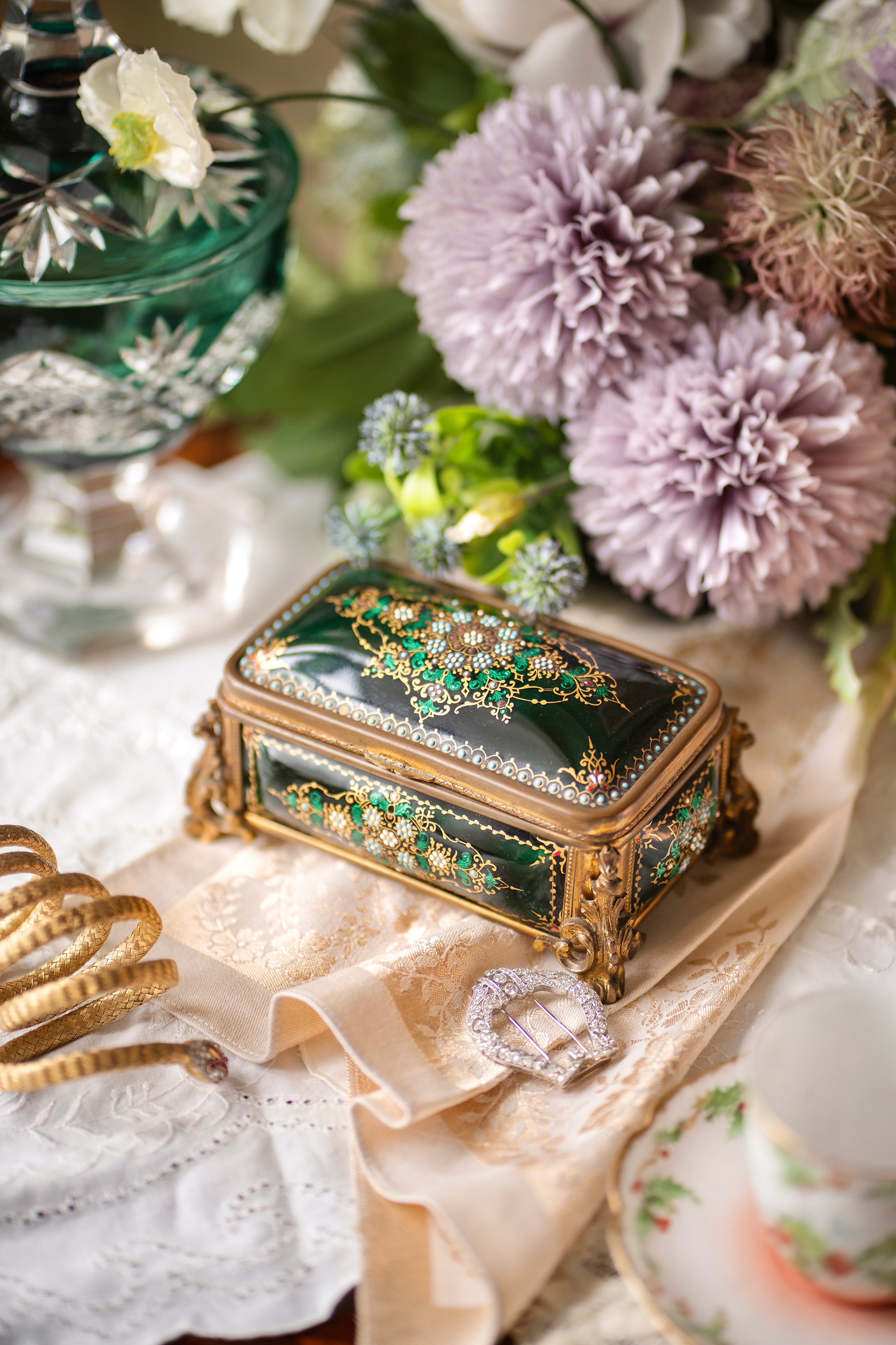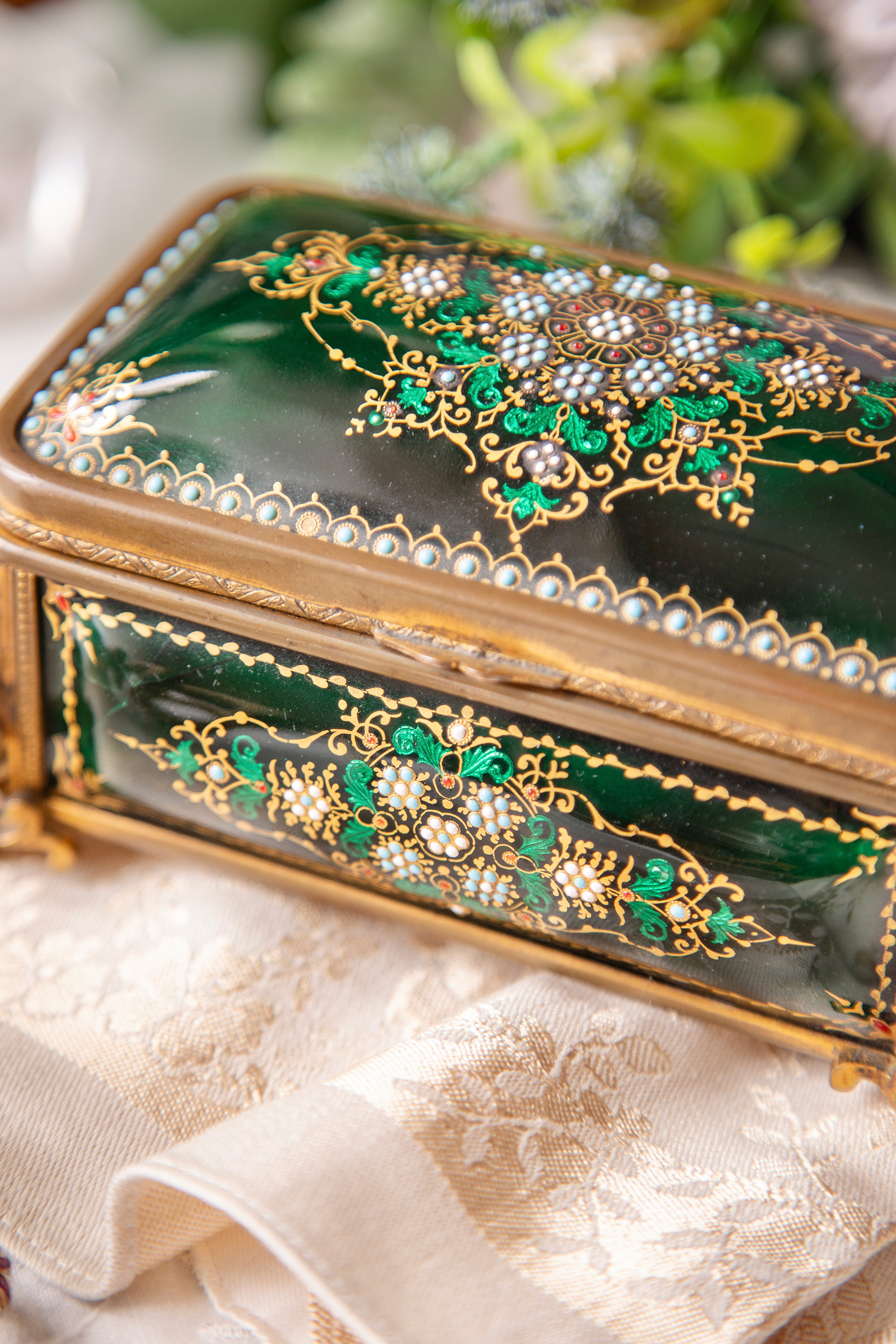 19世纪法国出品铜鎏金精雕装饰黑地卷叶花卉主题布雷松珐琅彩绘描金珍宝盒