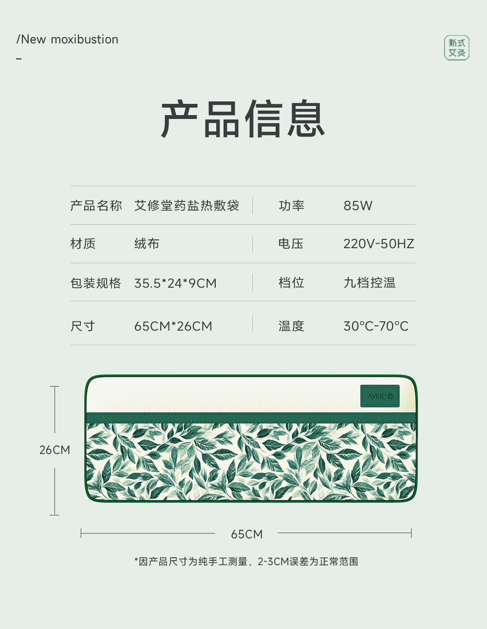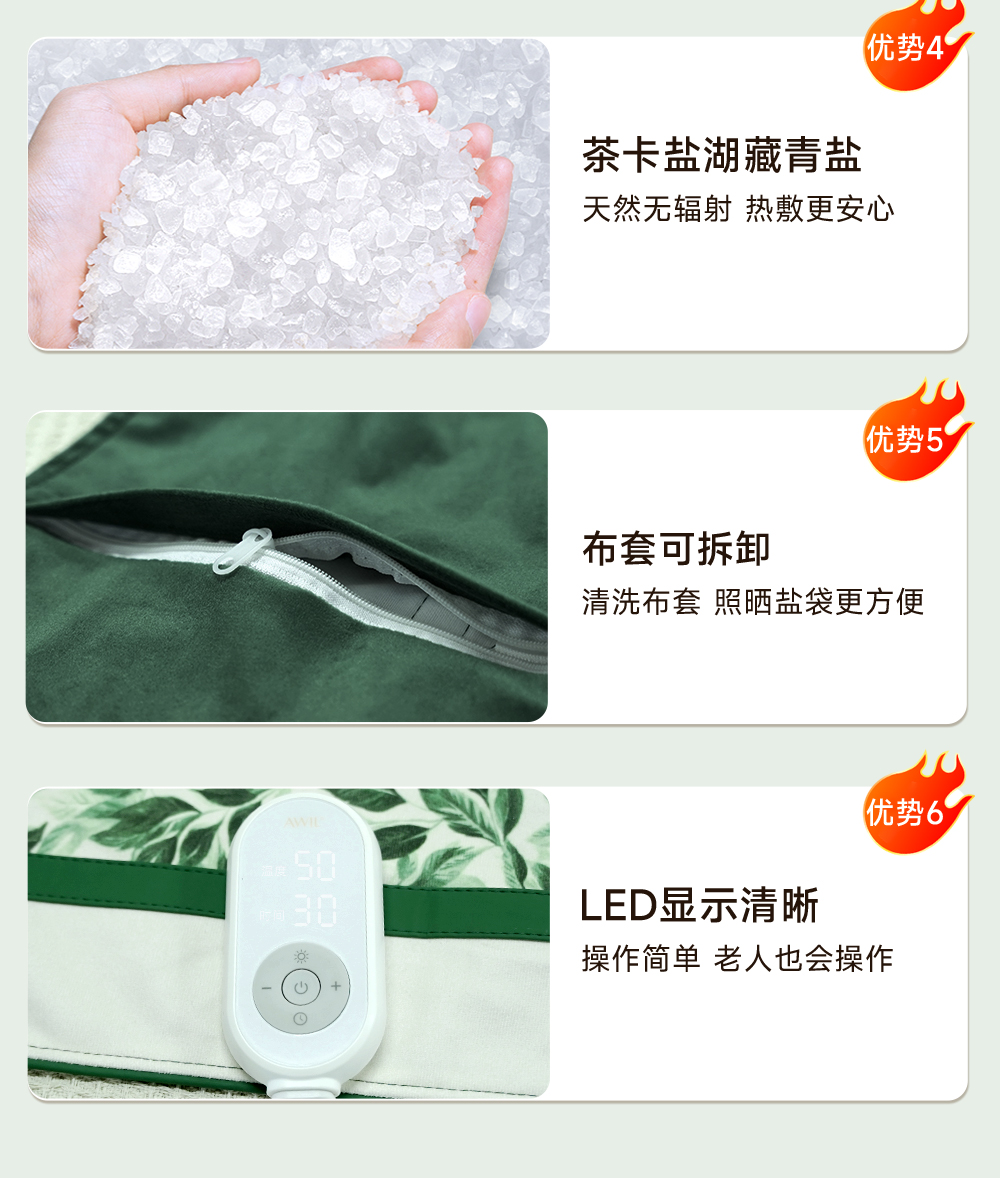 【产品规格】主品藏青盐热敷袋(绒)*1、外袋*1、包装盒*1、温控器*1、艾绒包*1、产品卡)