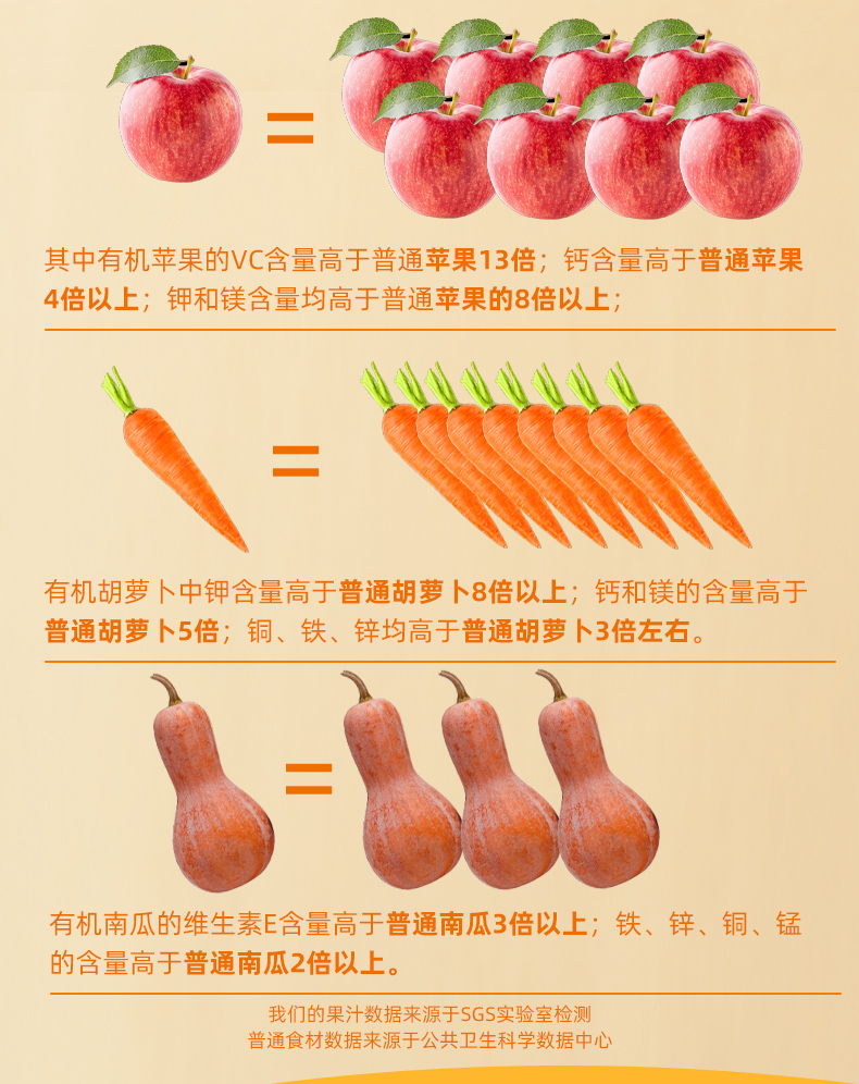 【商品配料表】:有机苹果,有机南瓜,有机胡萝卜,苹果酵素原液,矿物元素浓缩液