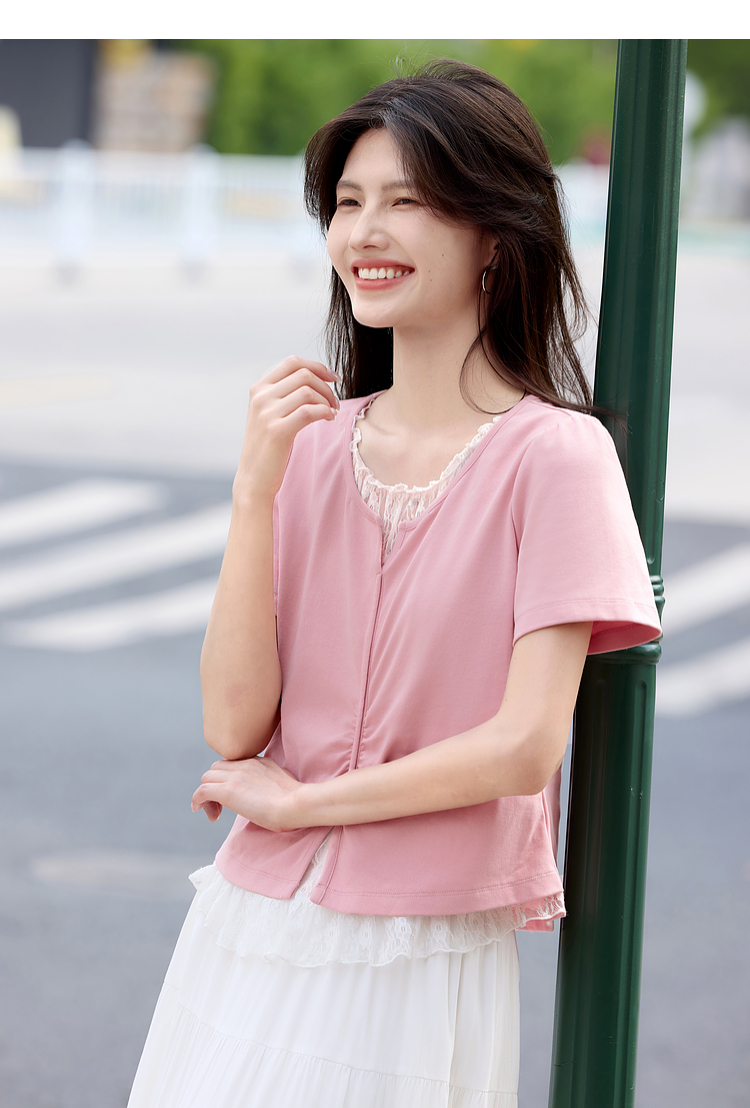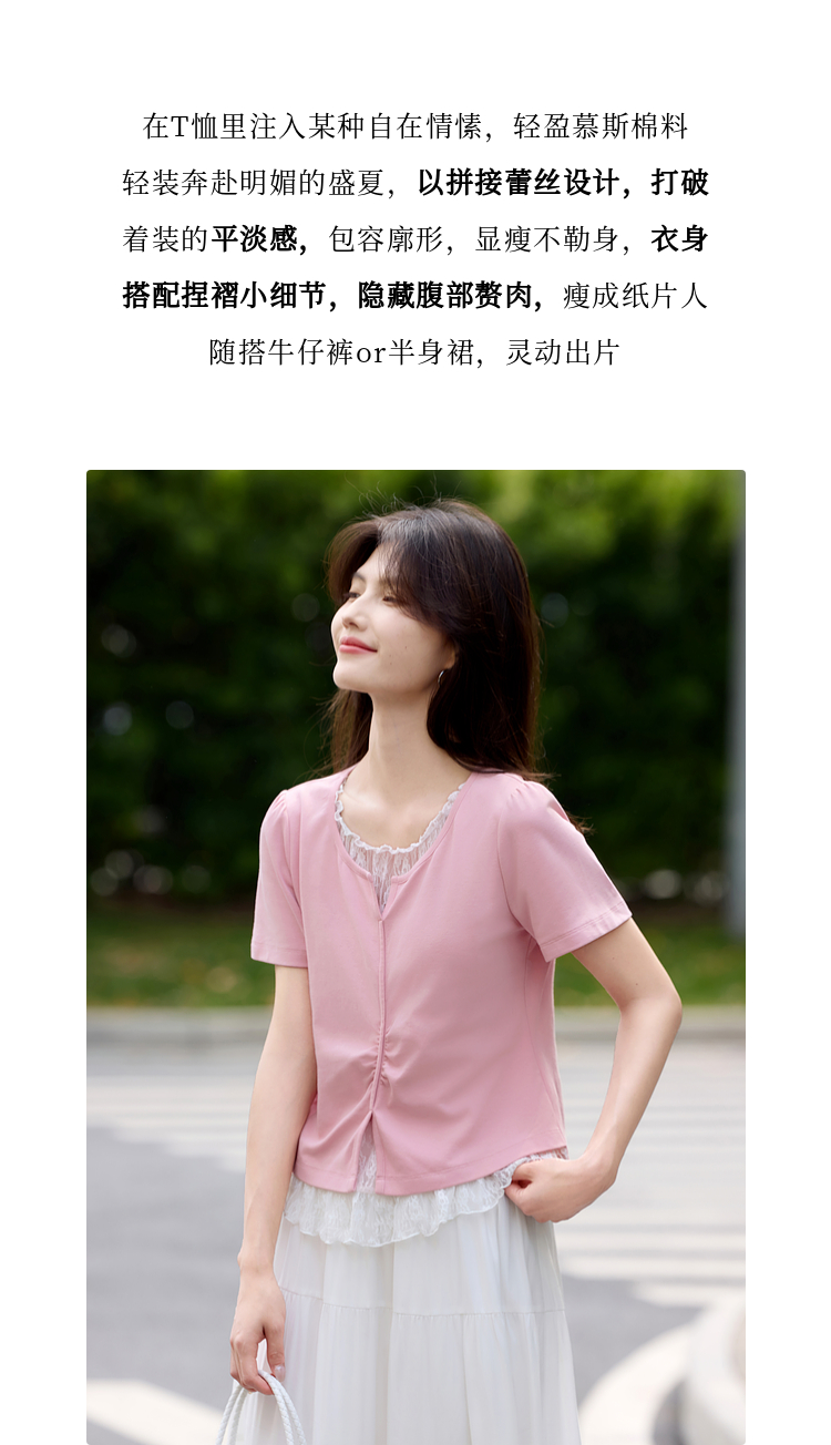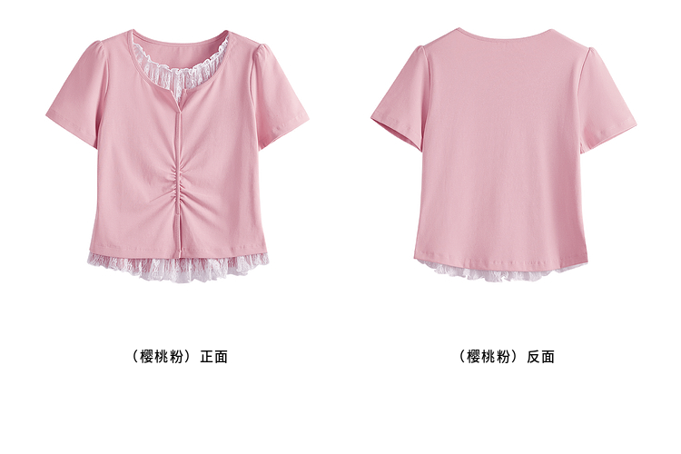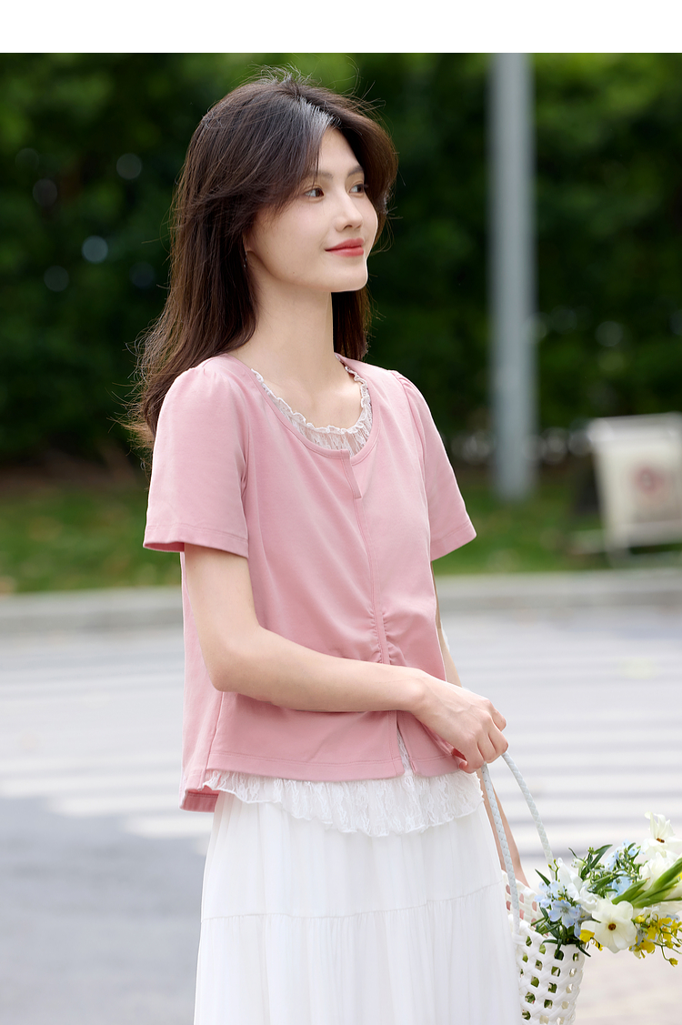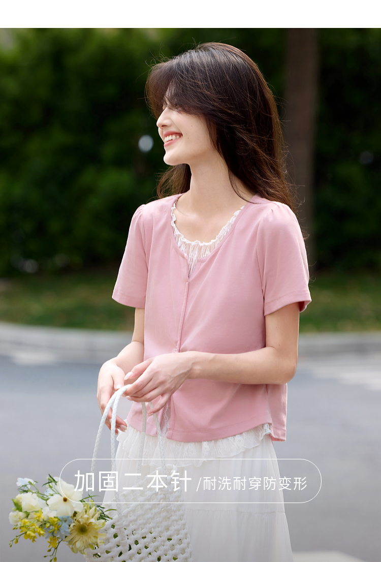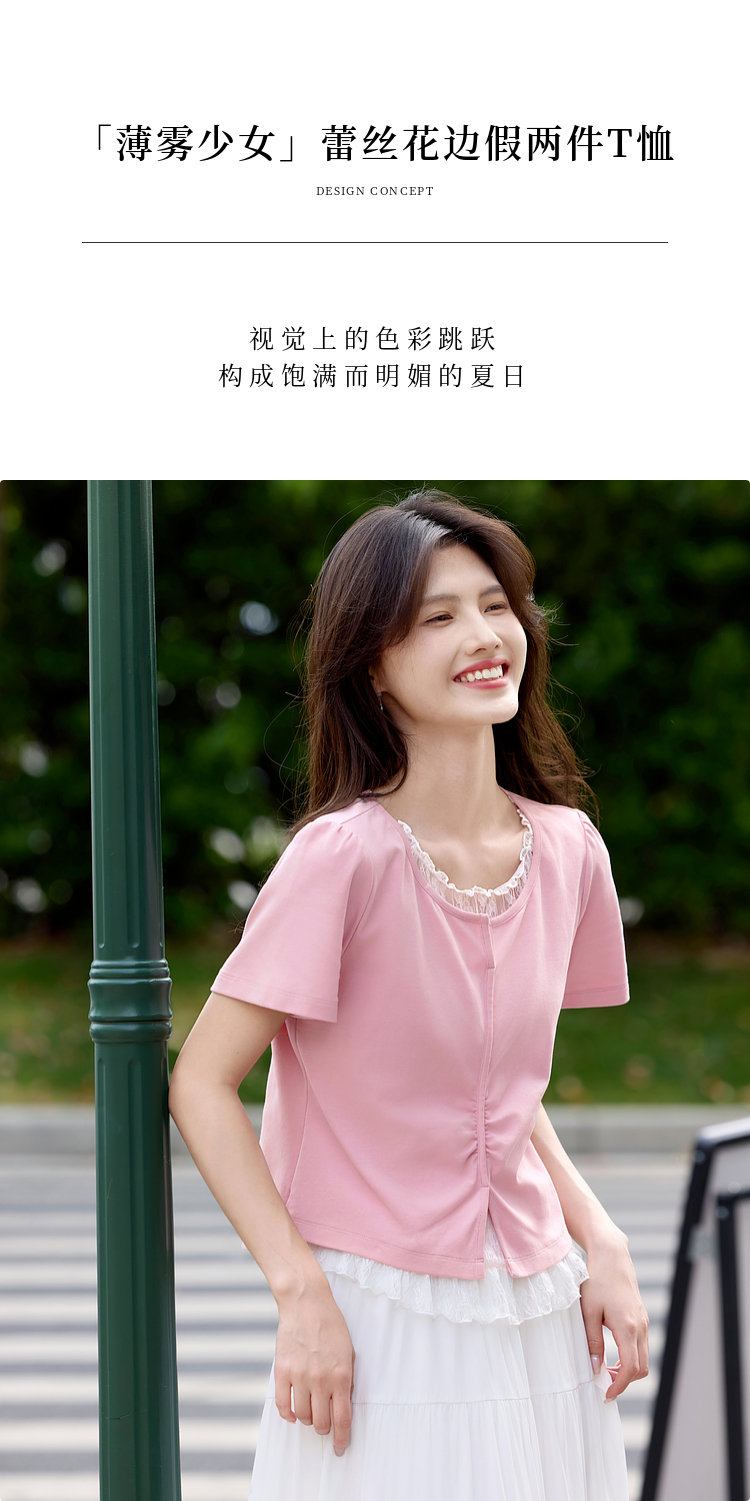 【专属特价】熙世界法式蕾丝花边拼接短袖T恤女设计感假两件上衣2025夏日新款