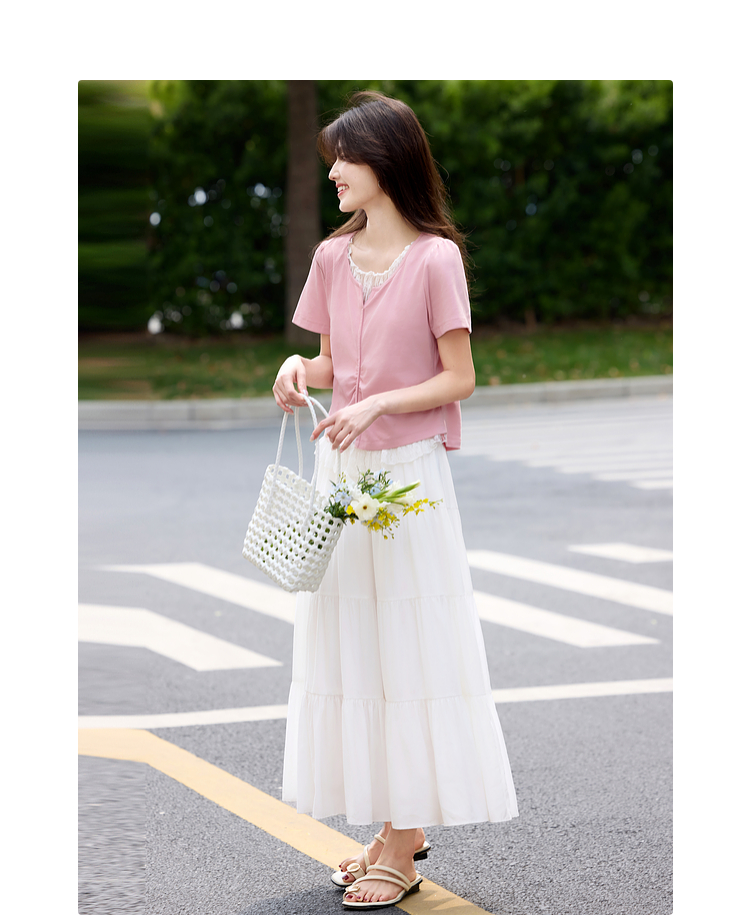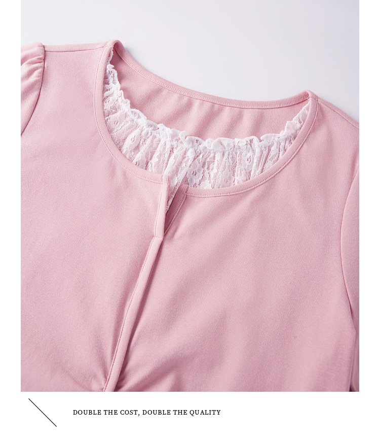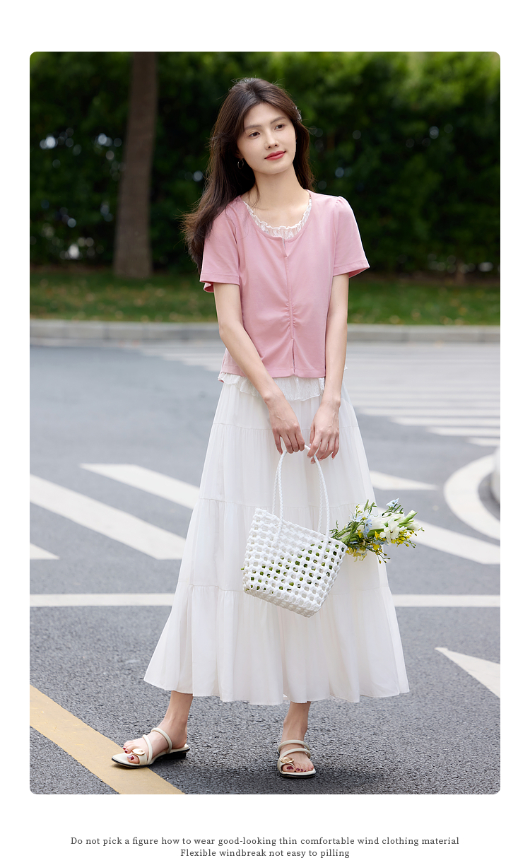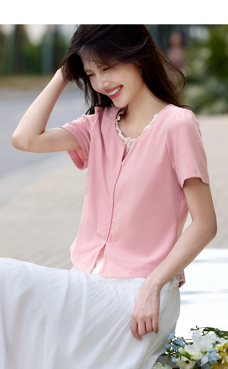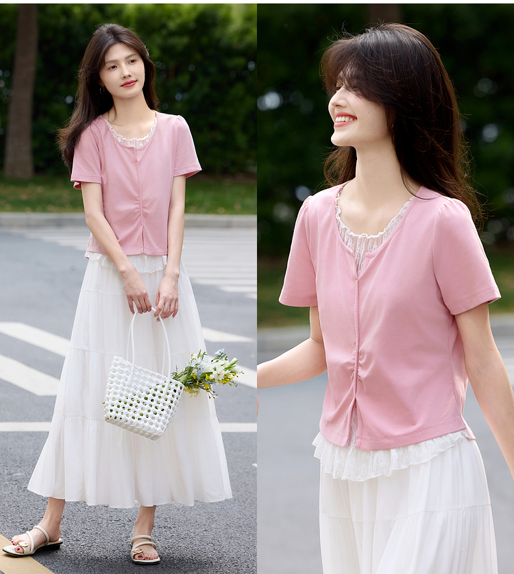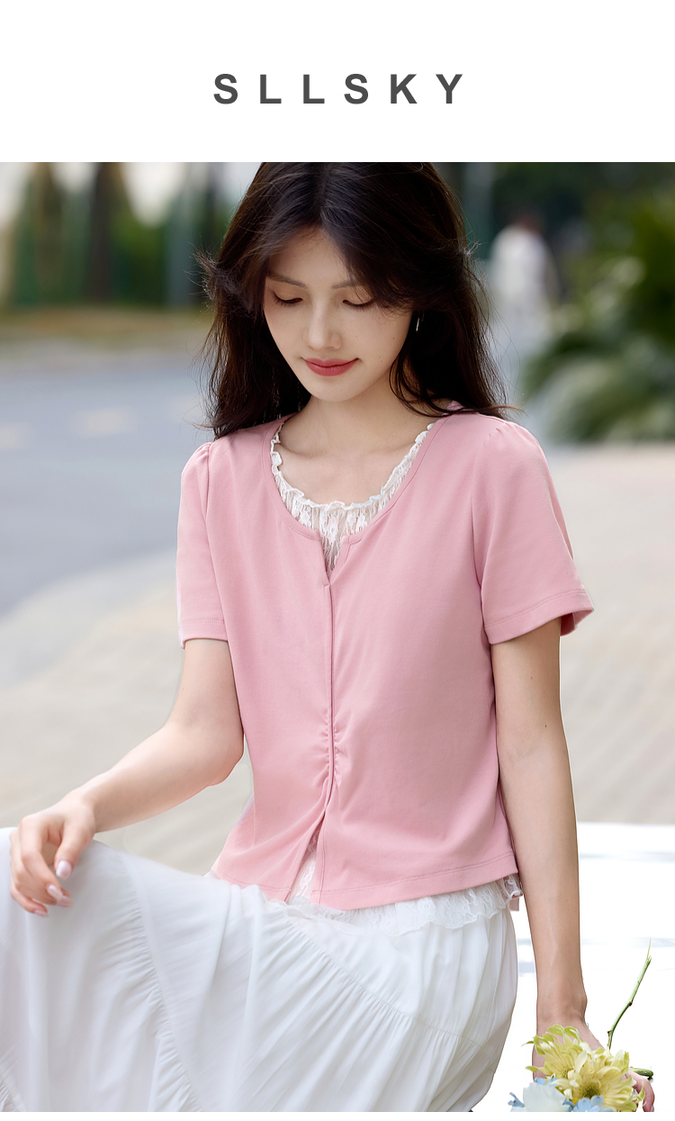 【专属特价】熙世界法式蕾丝花边拼接短袖T恤女设计感假两件上衣2025夏日新款