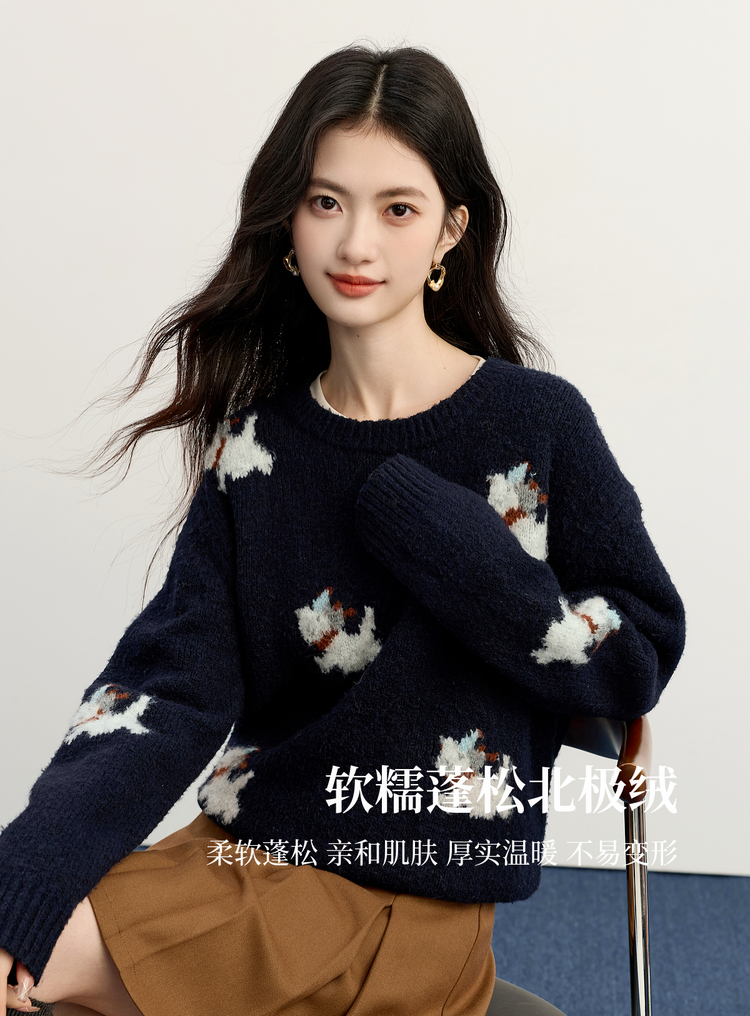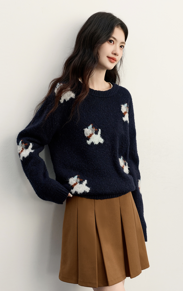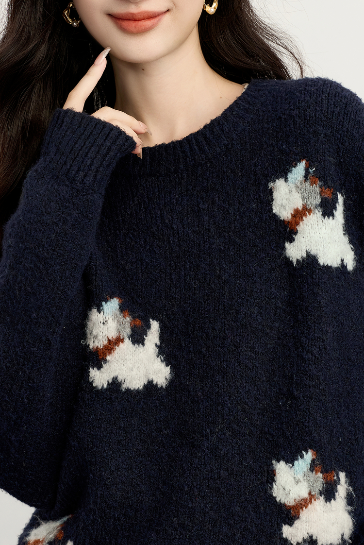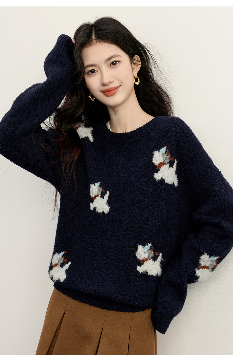 【11/26新品】熙世界糯叽叽小狗提花毛衣女2025冬季新款慵懒圆领内搭打底针织衫