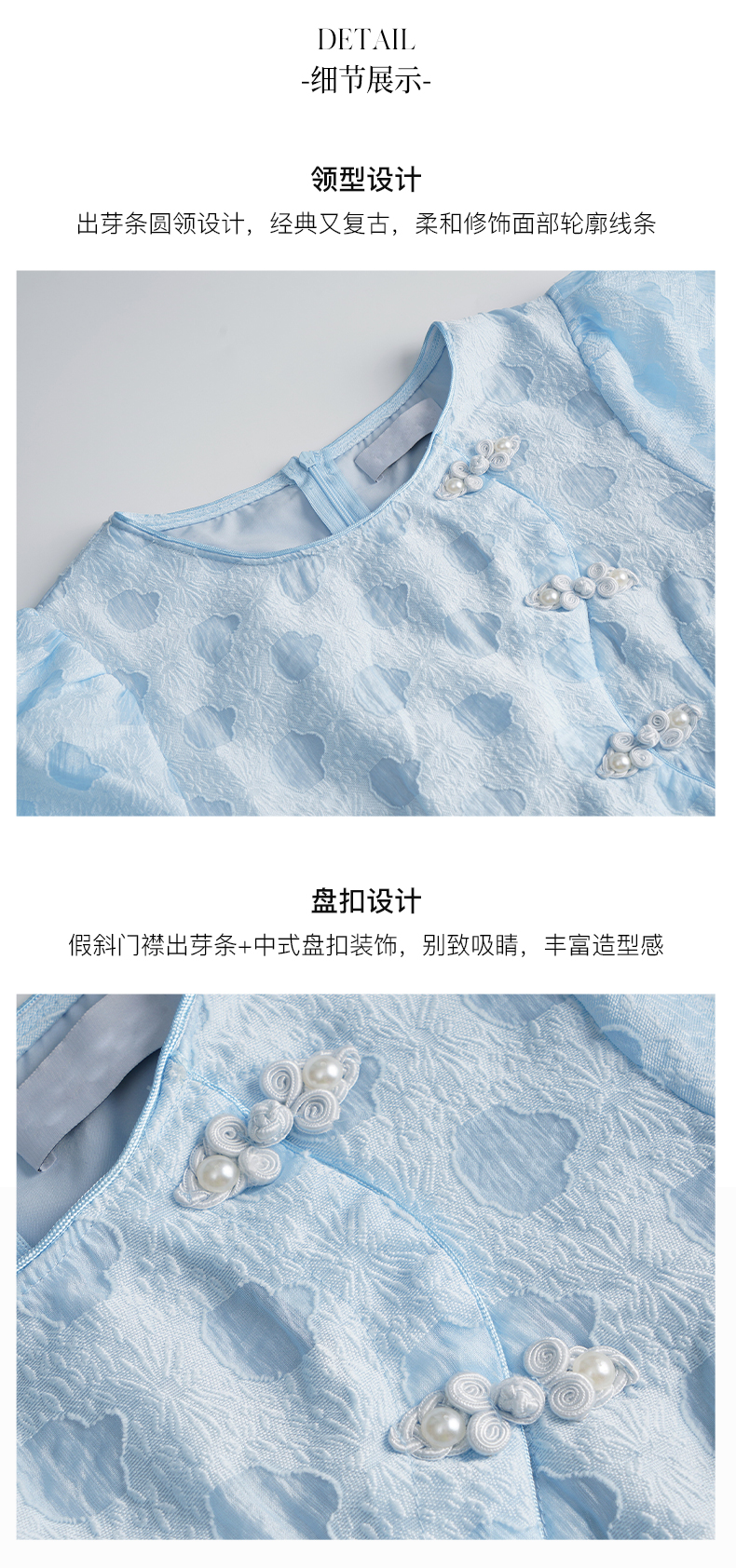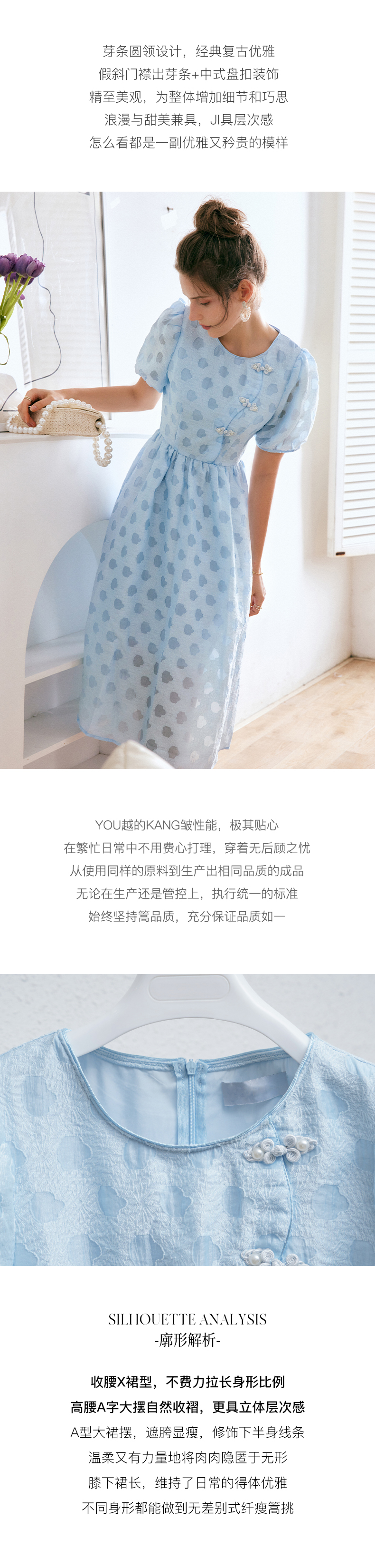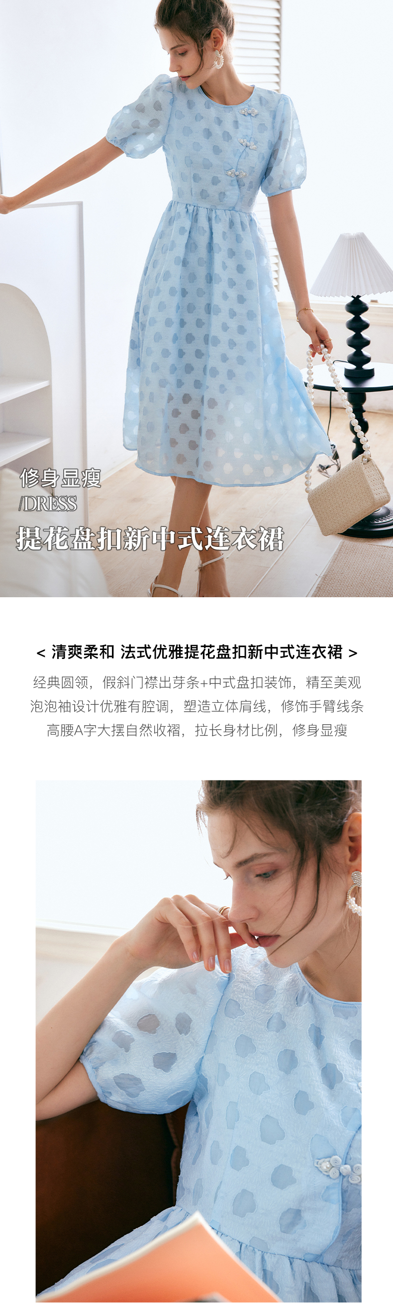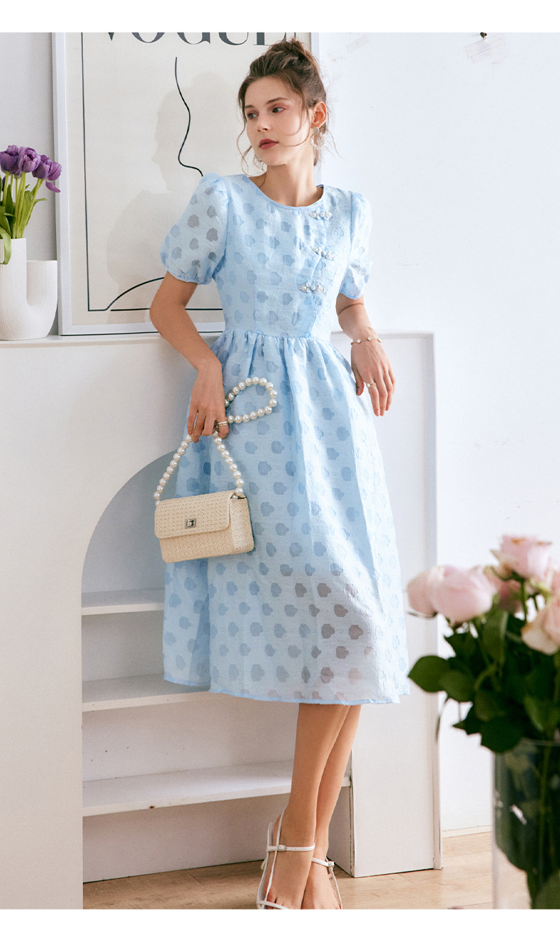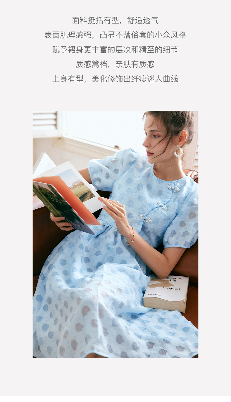 OLrain法式高级穿搭蓝色短袖连衣裙女夏季2022新款新中式气质裙子