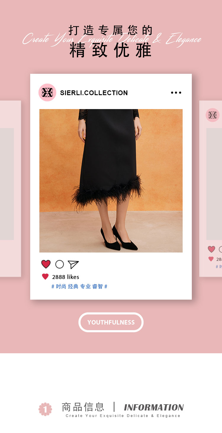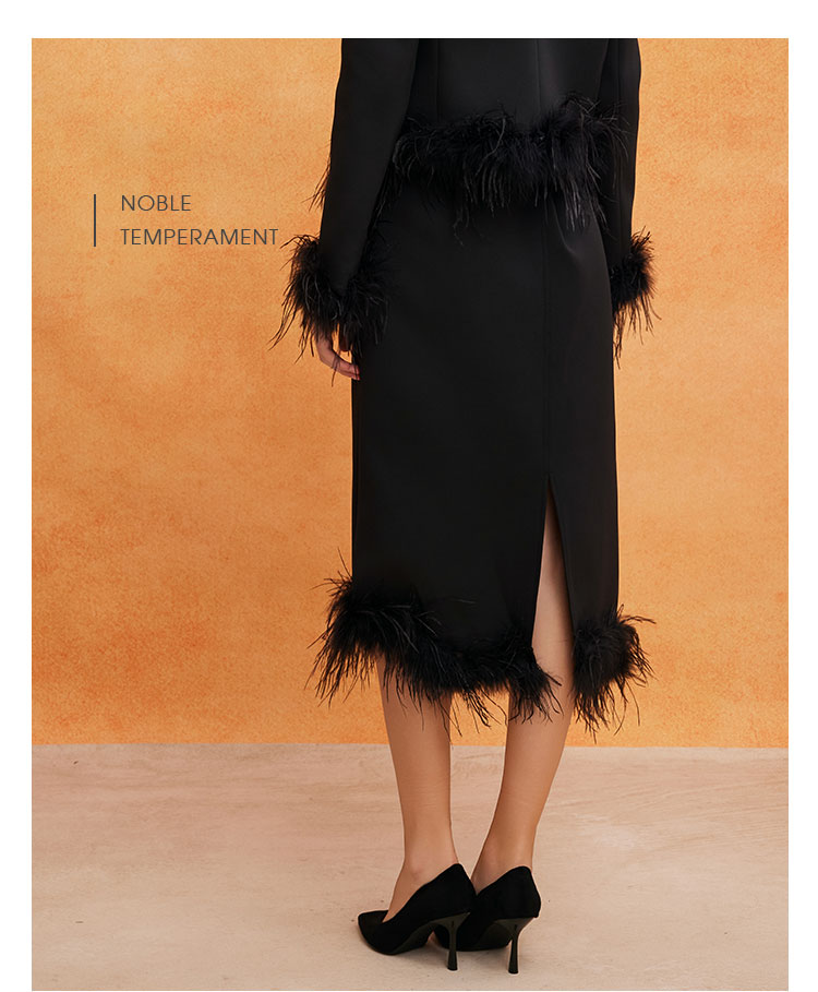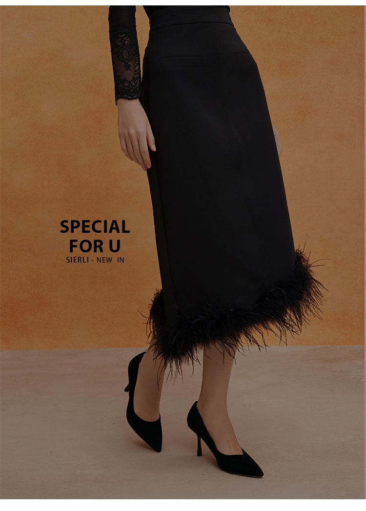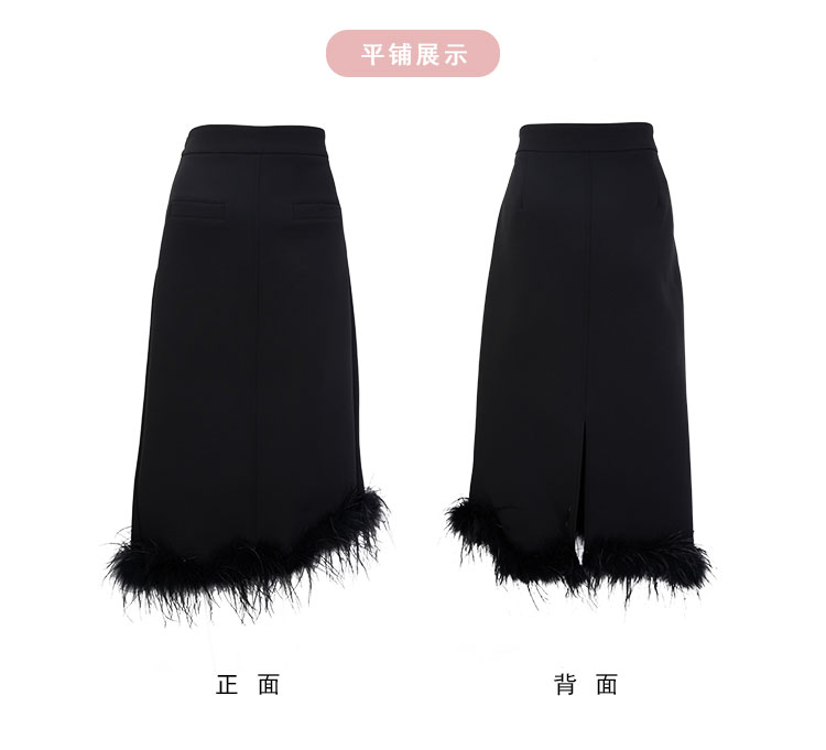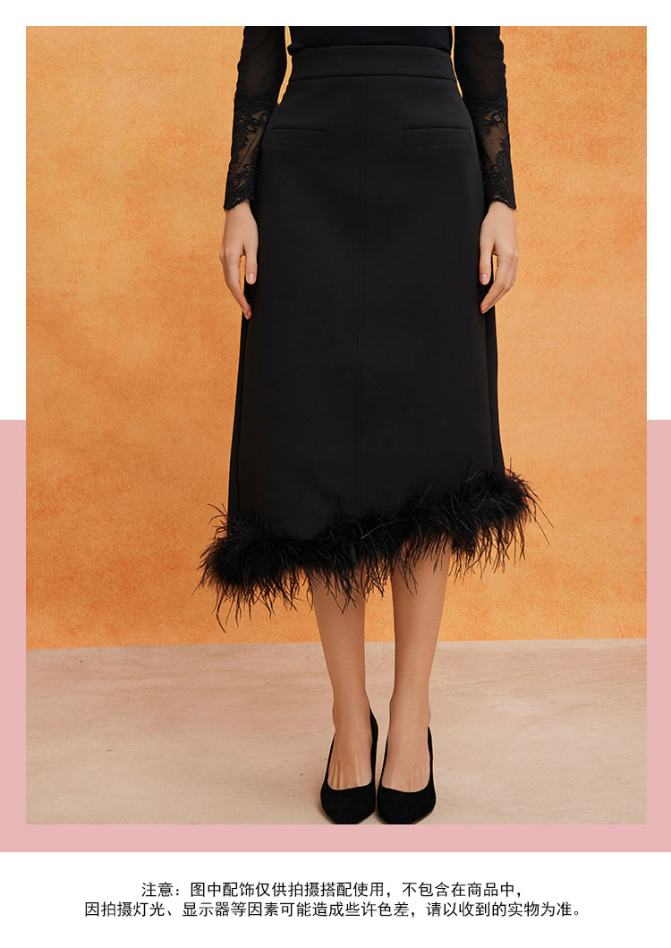 QE502斯尔丽25春季新款修身半裙可脱卸鸵鸟毛摇曳多姿不对称下摆半裙