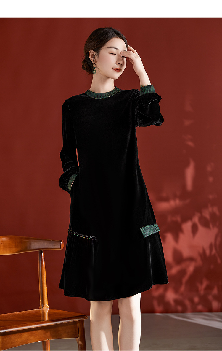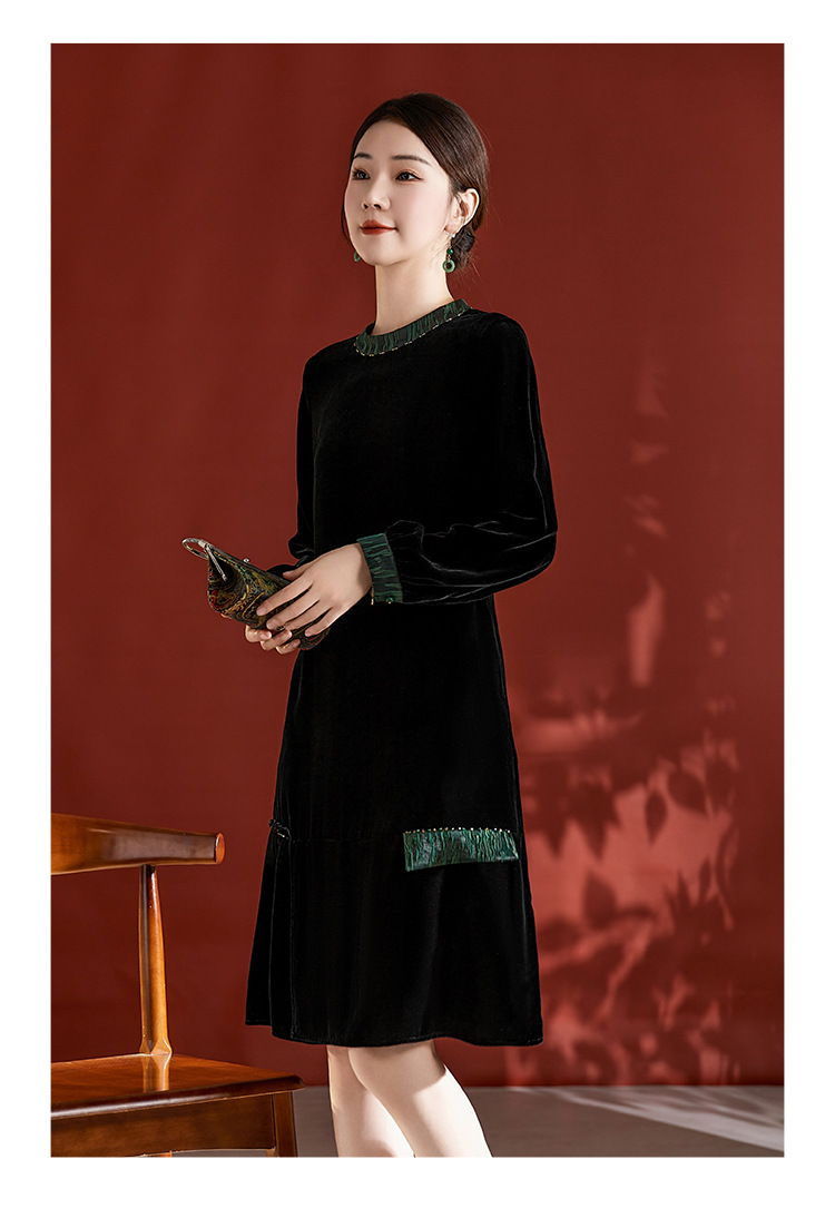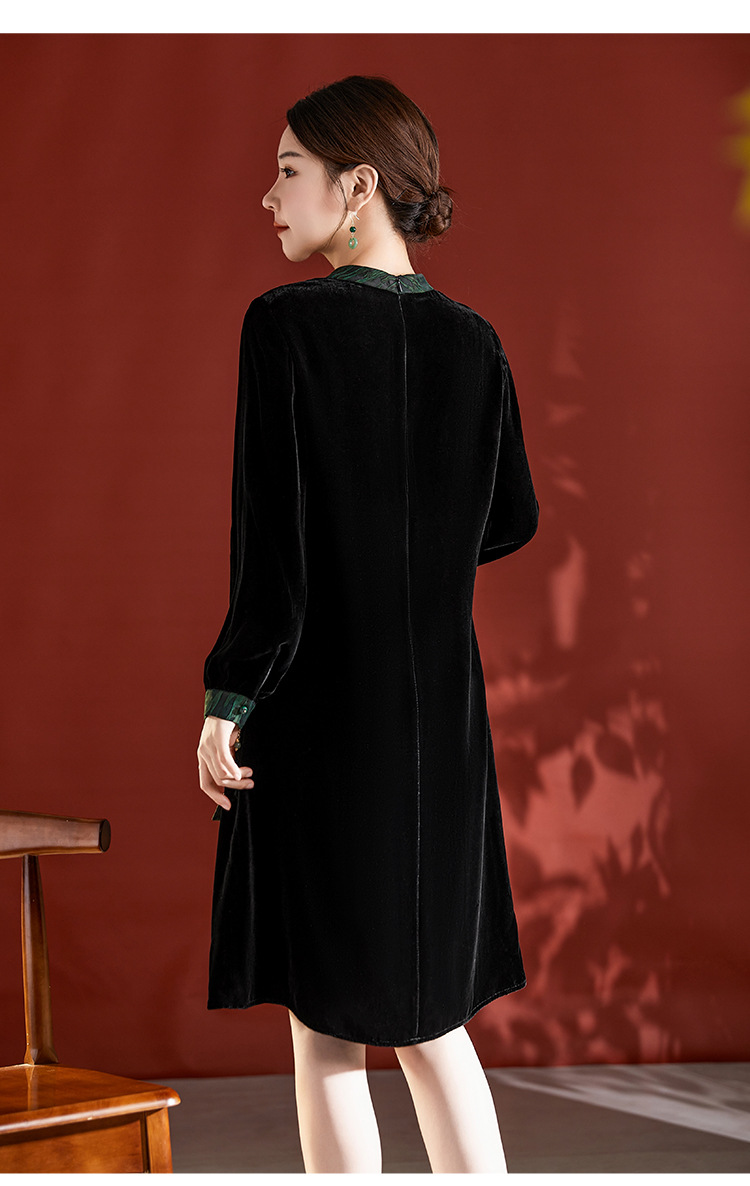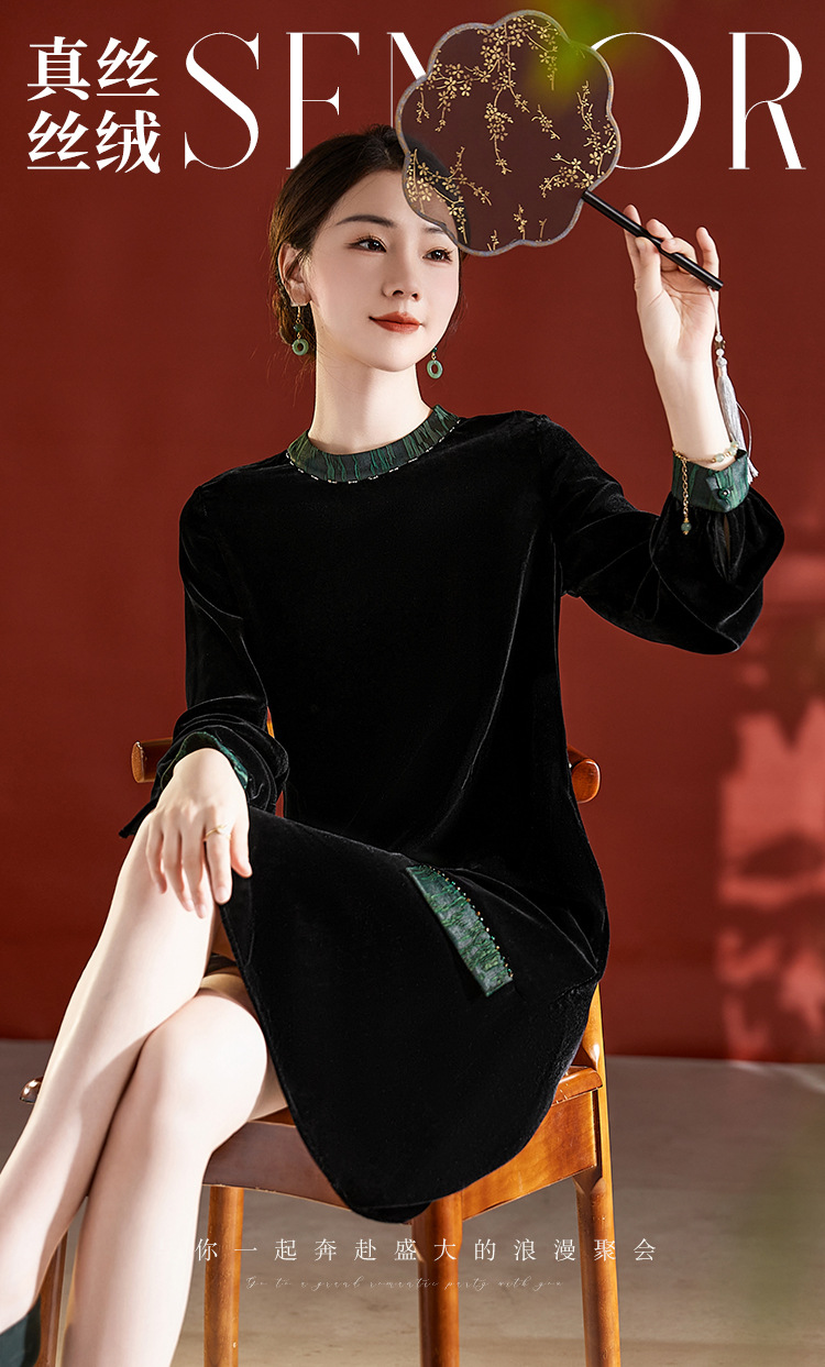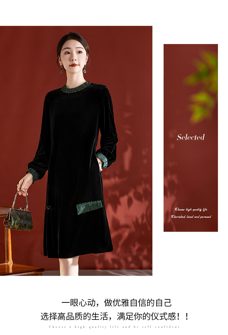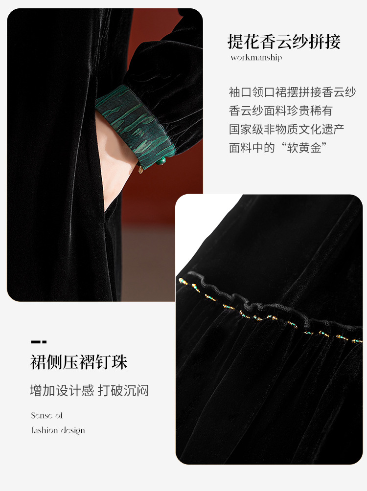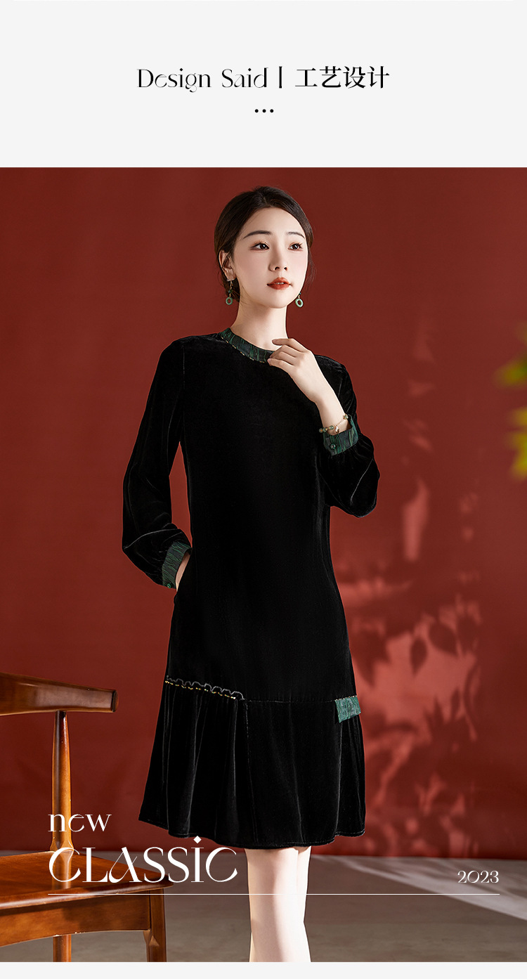 丝绒真丝连衣裙女2023秋季新款中式轻奢香云纱拼接桑蚕丝复古长裙QS-82395600