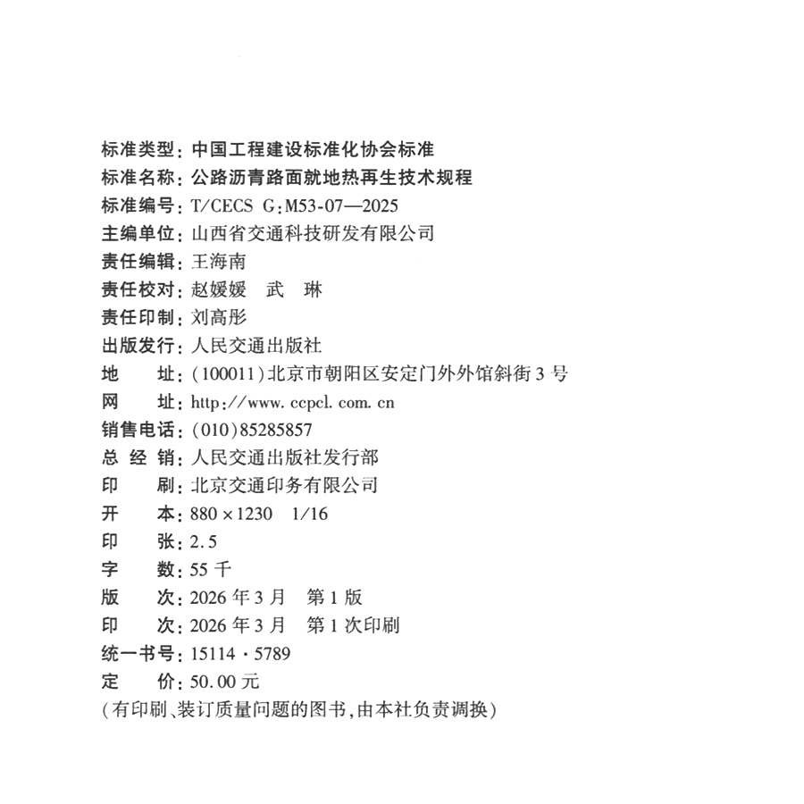 书名:公路沥青路面就地热再生技术规程(T/CECS G:M53-07—2025)