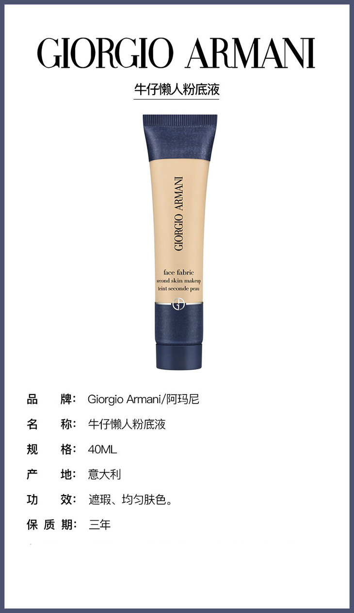 原装进口 阿玛尼(ARMANI COLLEZIONI)阿玛尼粉底液牛仔懒人粉底液40ML 0.5乳白色