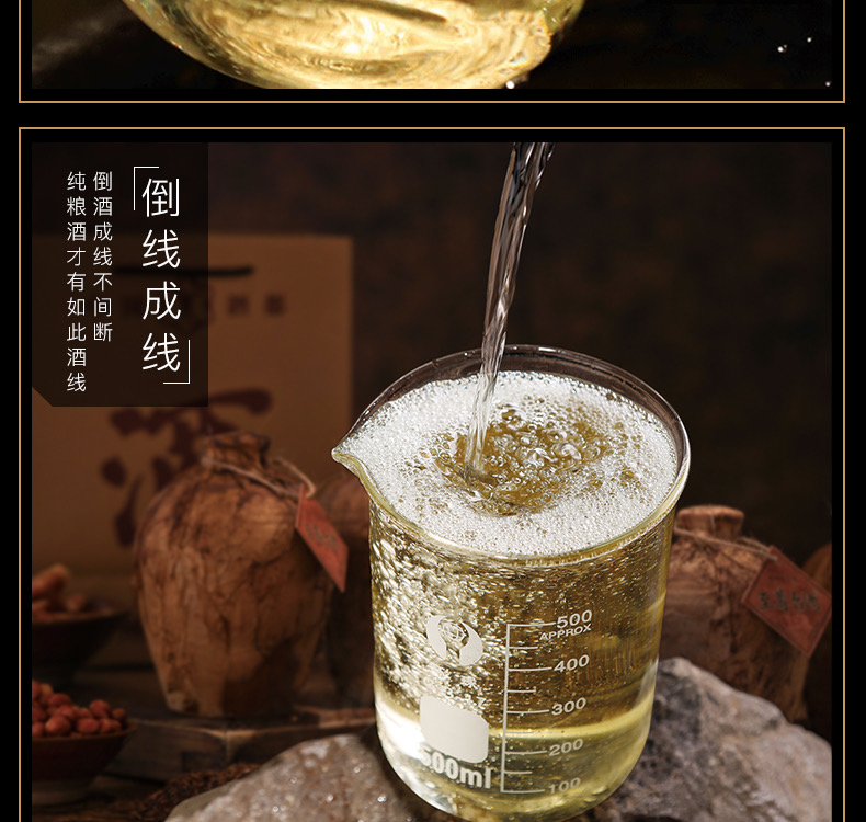 使用传统的酿造方法,加上多年老窖保存,窖藏使酒体老鼠、熟加快,产生老酒特有的醇厚柔顺口感
