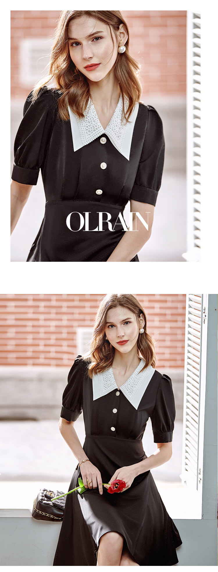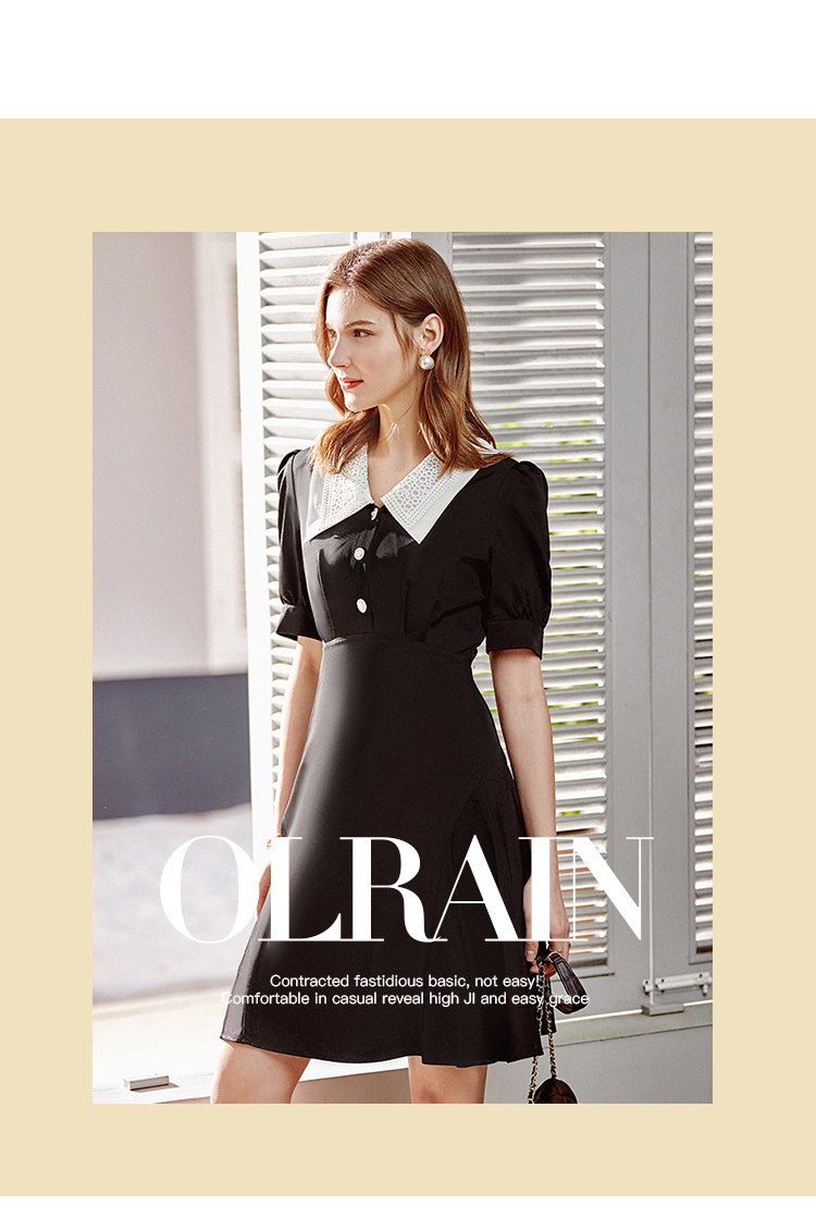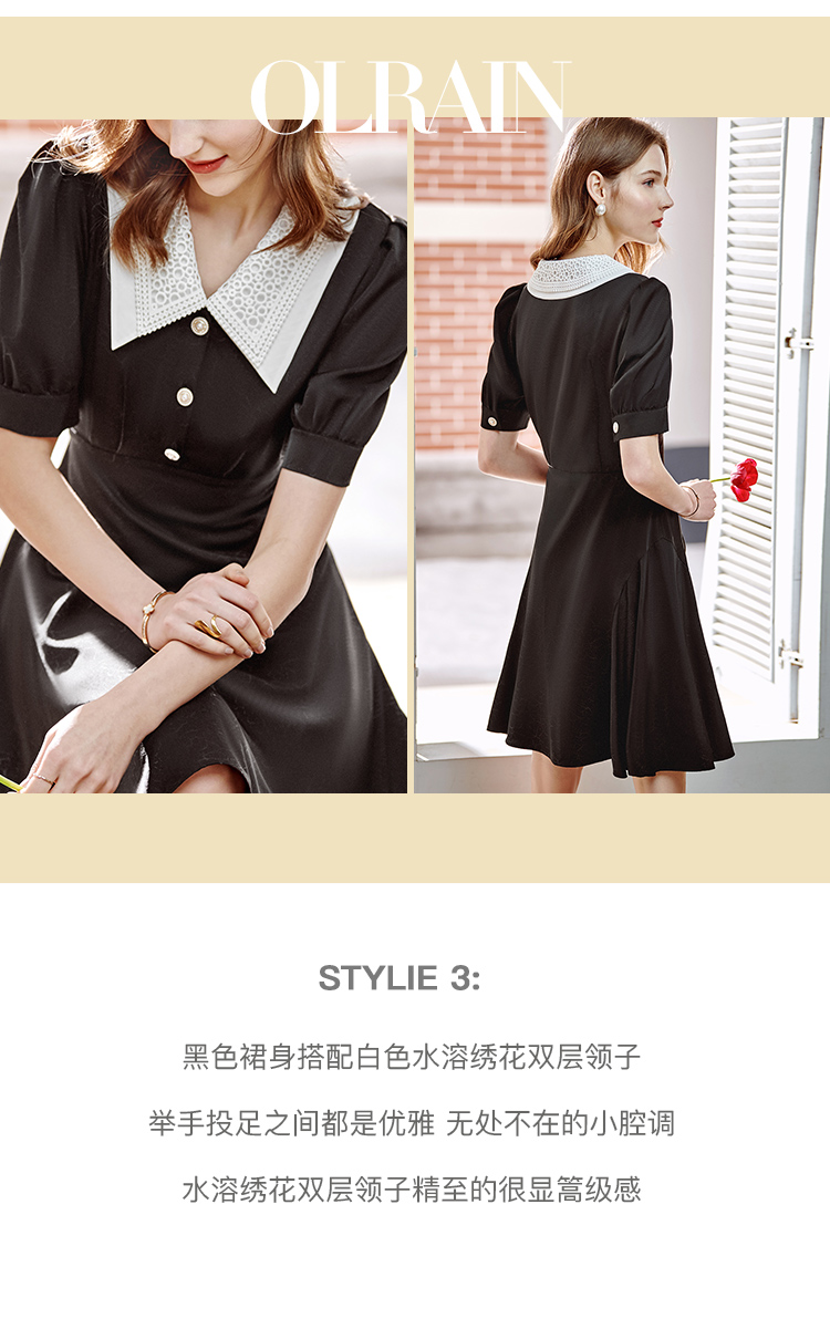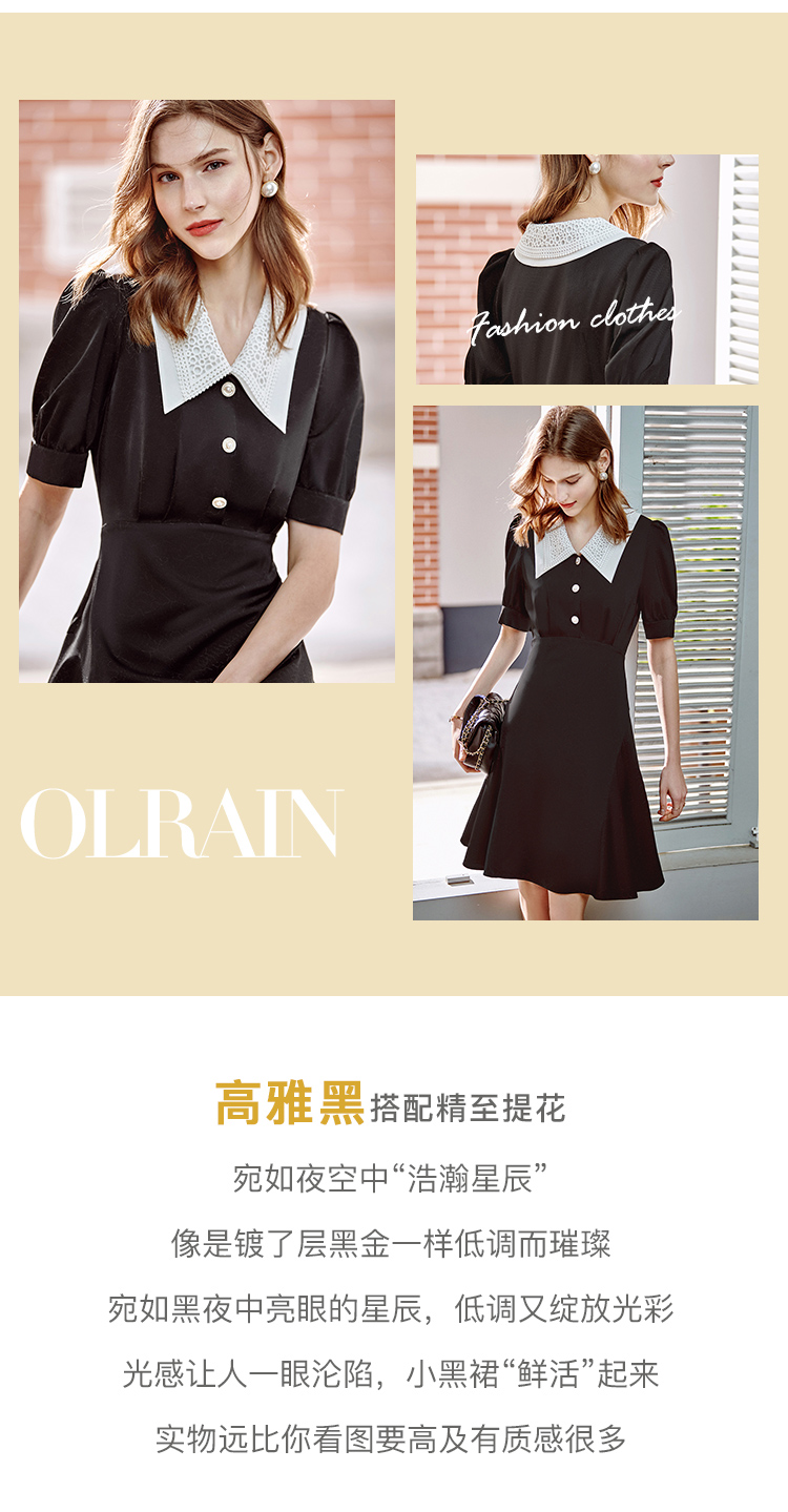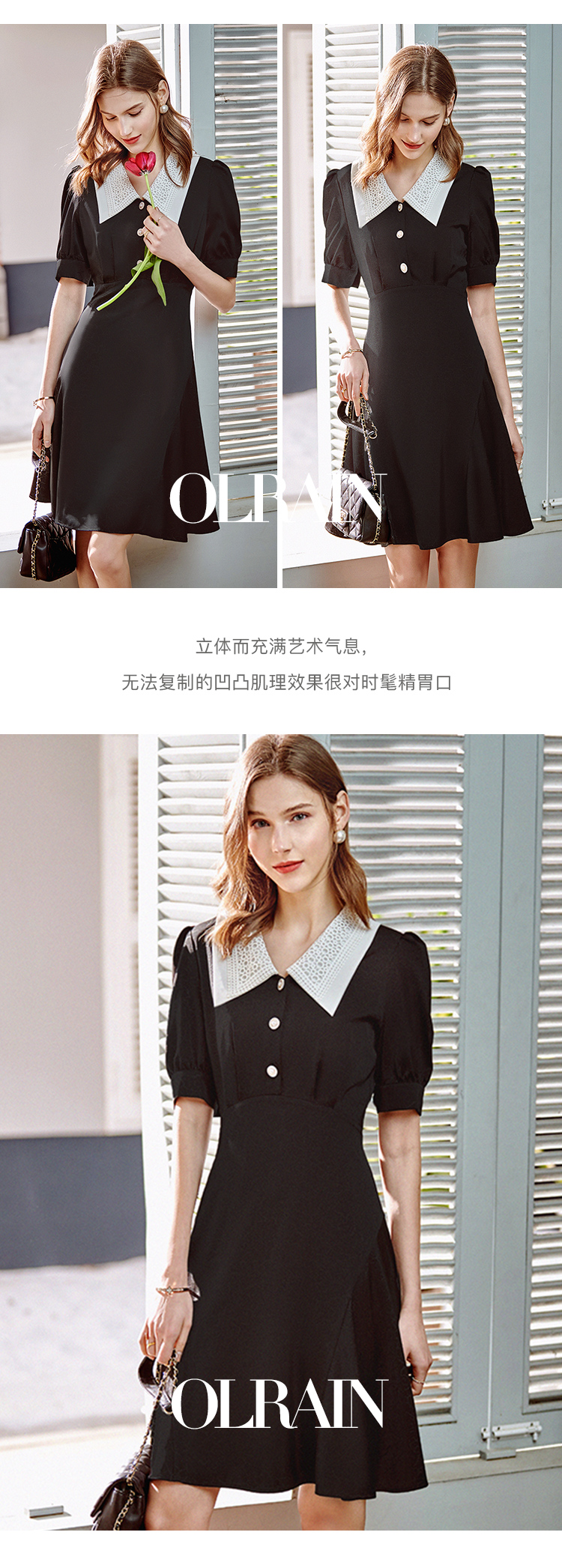 欧芮儿黑色连衣裙女2021新款收腰显瘦精致拼领高雅名媛风裙子
