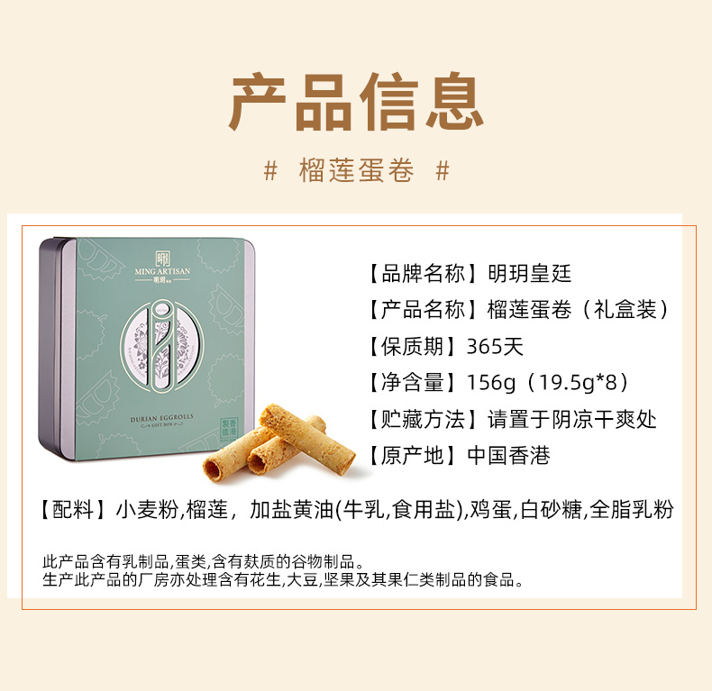 明玥皇廷榴莲蛋卷礼盒156g/055273 榴莲的清香口感松脆层次丰富