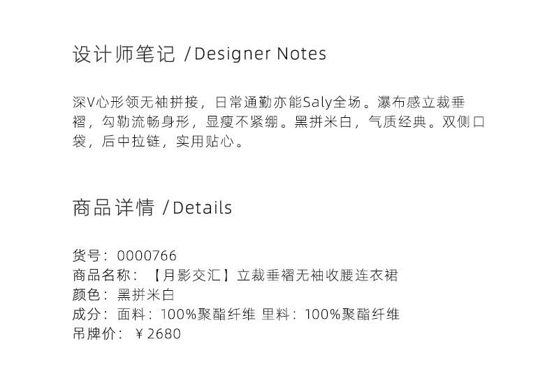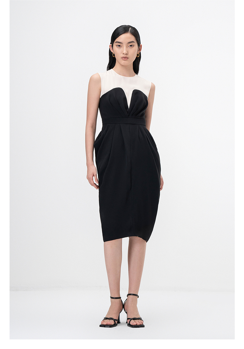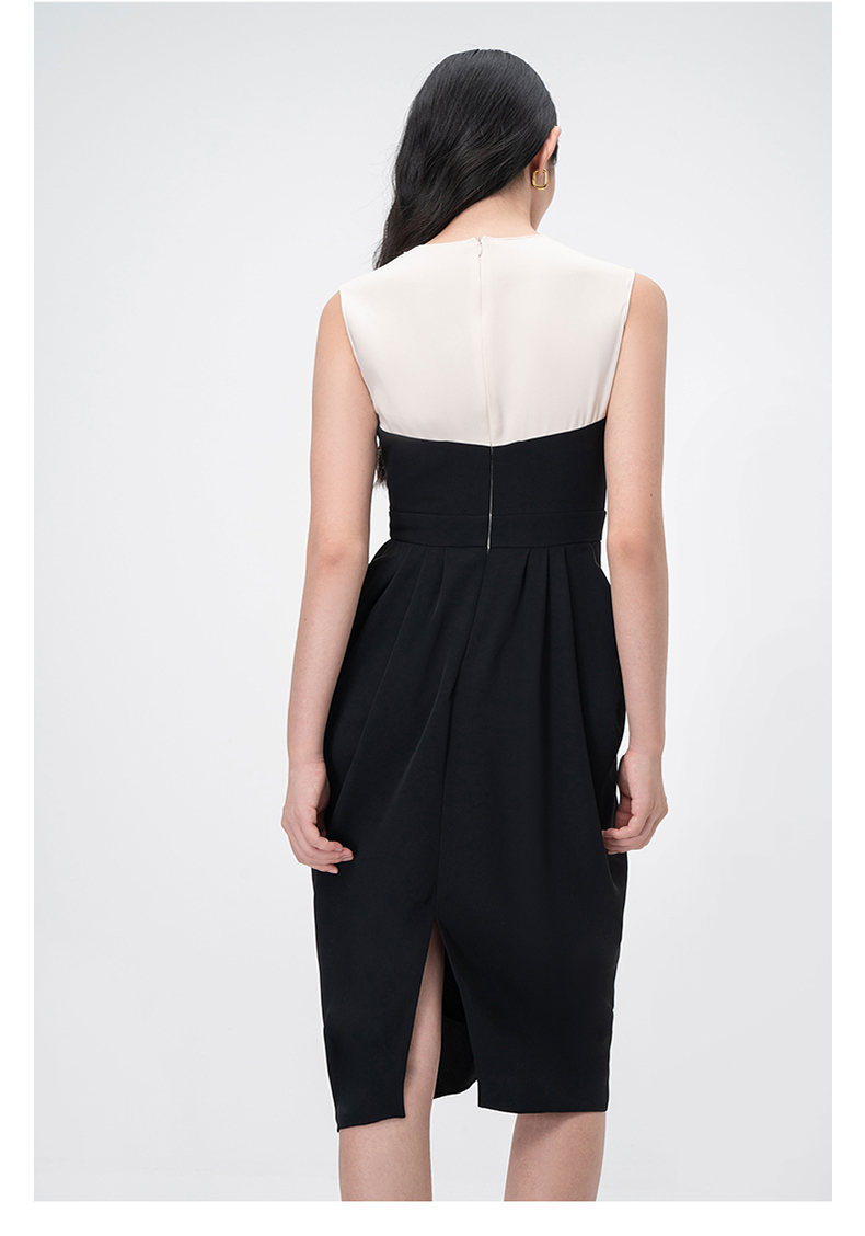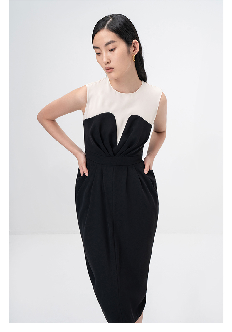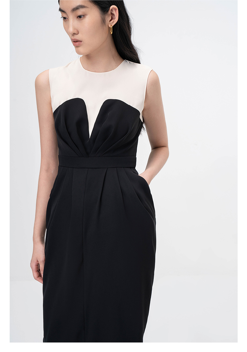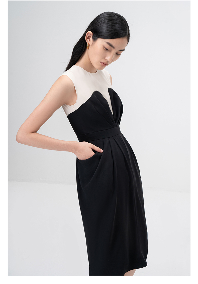 【月影交汇】立裁垂褶黑拼米白无袖收腰连衣裙/0000766