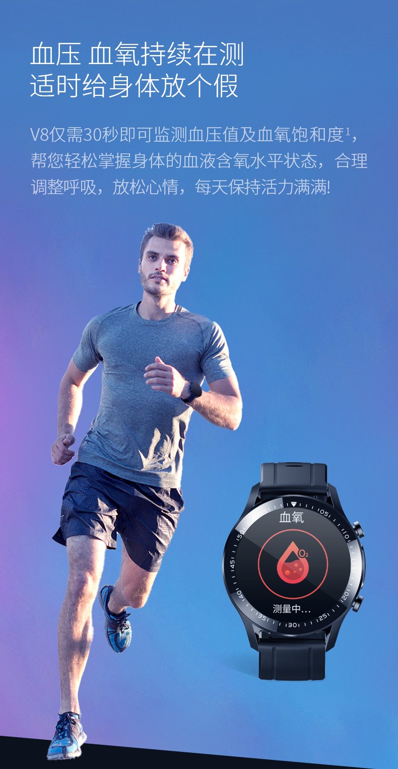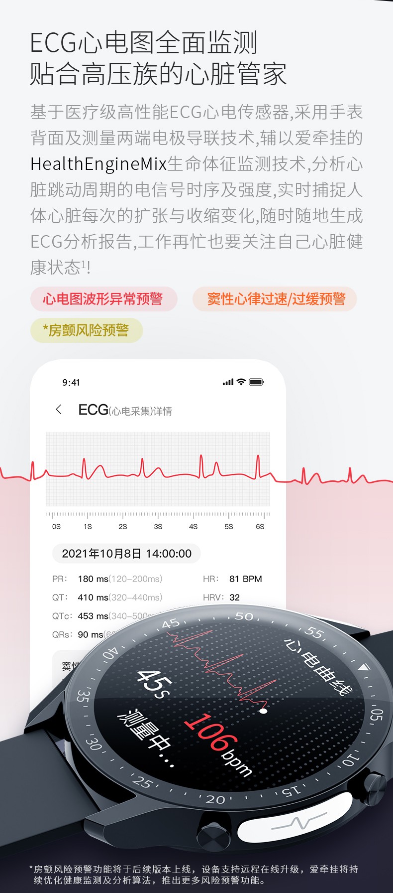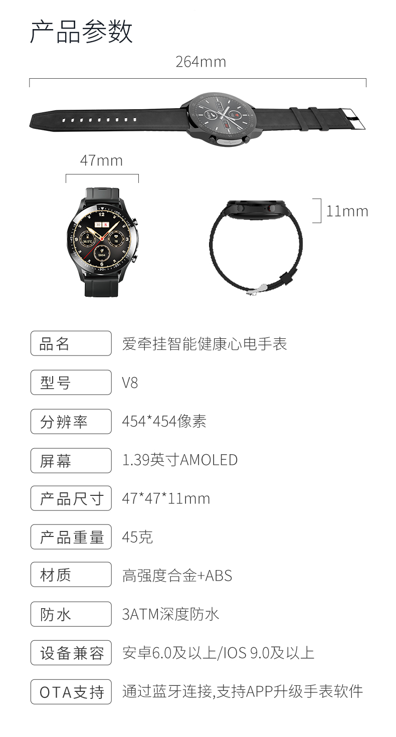 爱牵挂V8运动智能手表ecg心电图蓝牙多功能运动男士女款手环测心率血压运动负荷强度监测自测体温睡眠监控