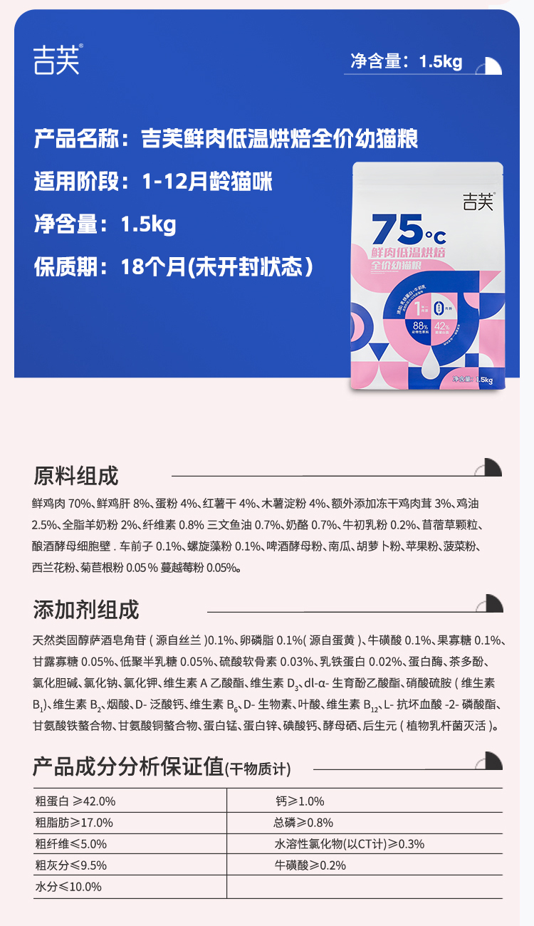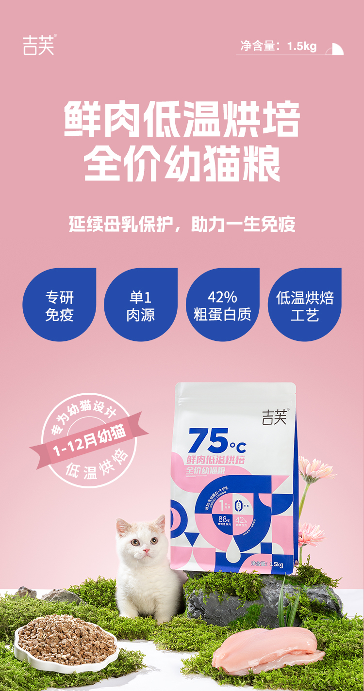 吉芙鲜肉低温烘焙幼猫粮无谷猫咪主粮英短美短成猫食品1.5kg