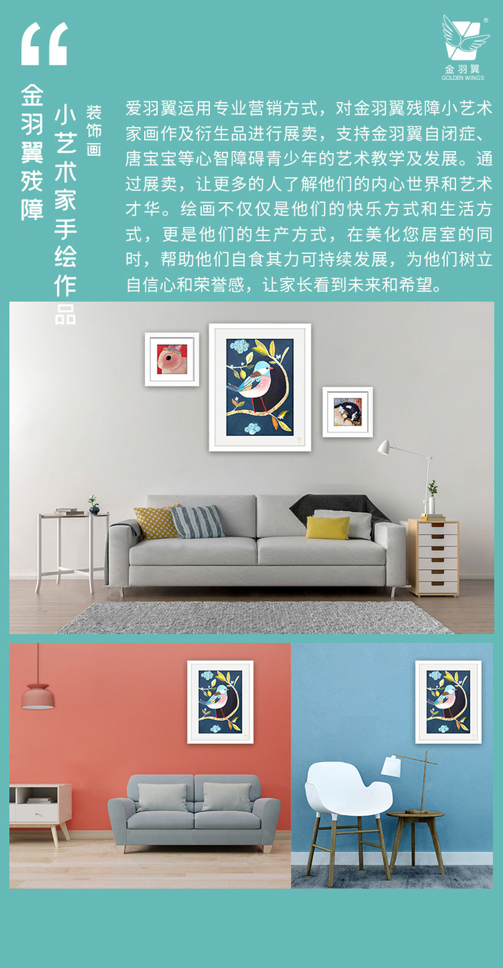 - 金羽翼将艺术与心理治疗相结合,用艺术教育的形式帮助残障青少年体现自身价值、提高生活质量、实现艺术梦想,并将绘画作品开发成衍生品销售,收入扣除成本后,20%返还给学员家庭,80%用于金羽翼艺术康复教学。