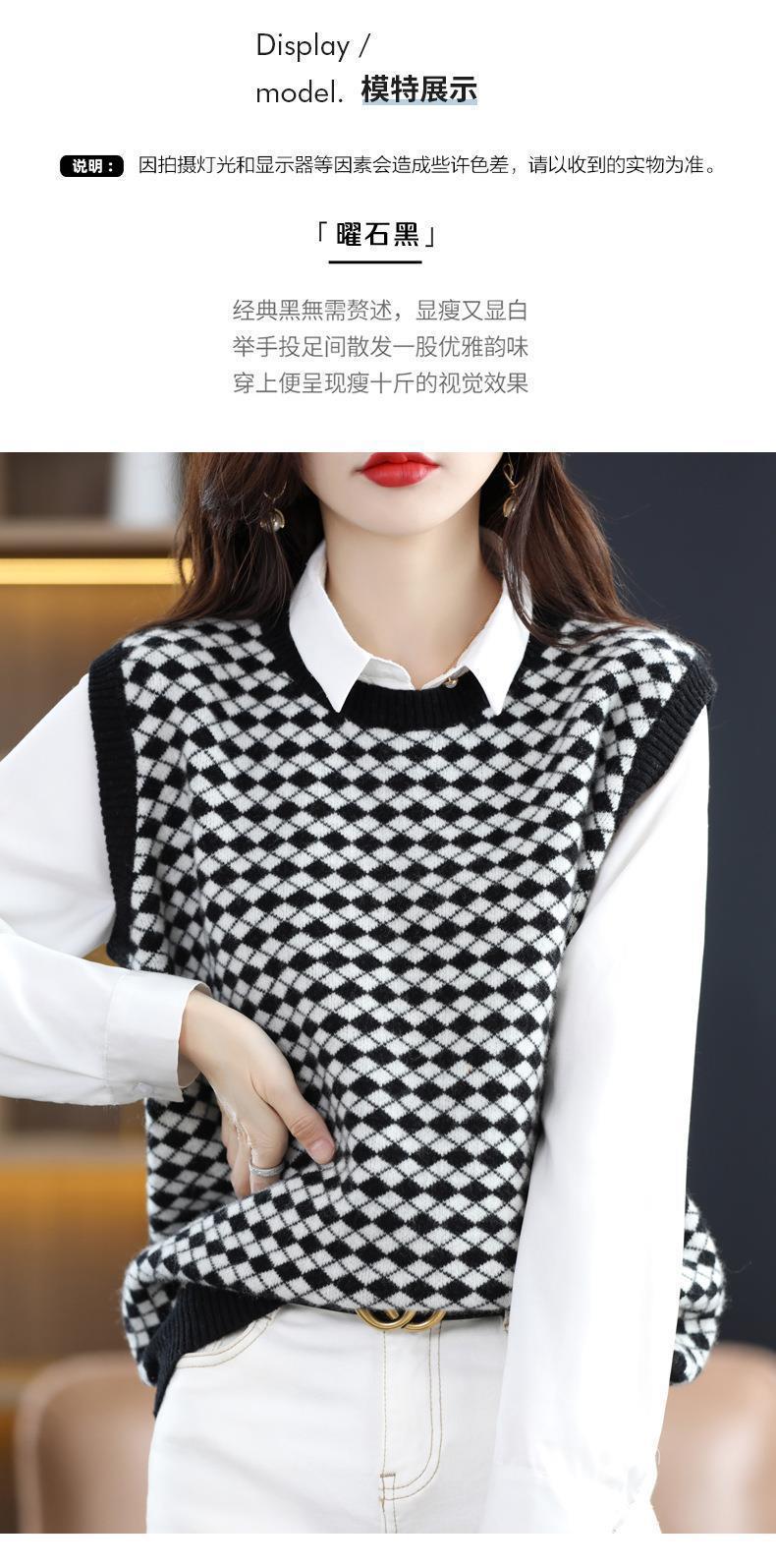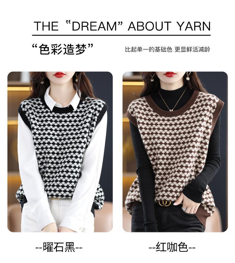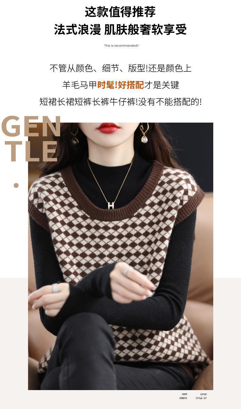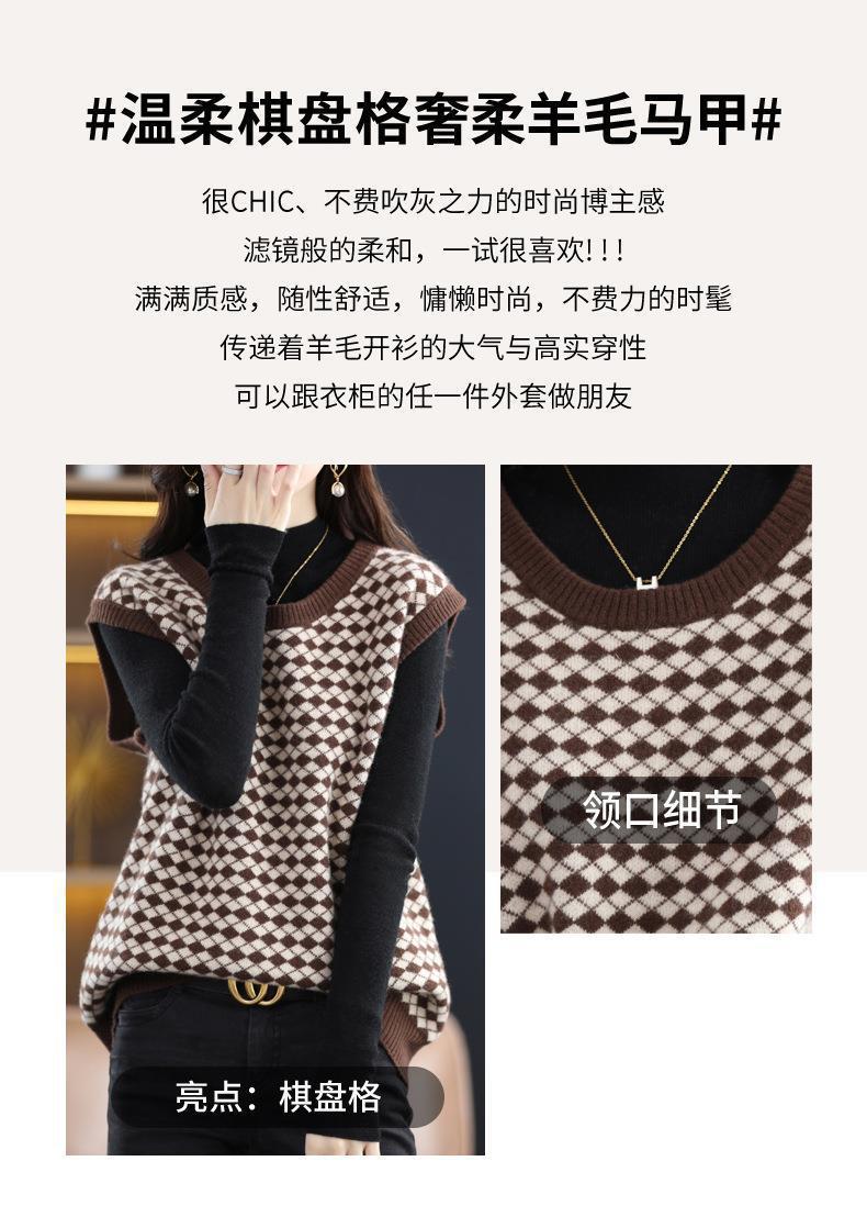 棋盘格圆领叠穿套头马甲背心女新款休闲格子宽松针织坎肩毛衣女