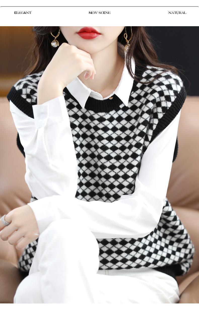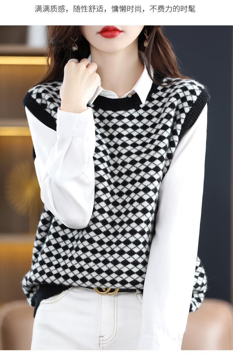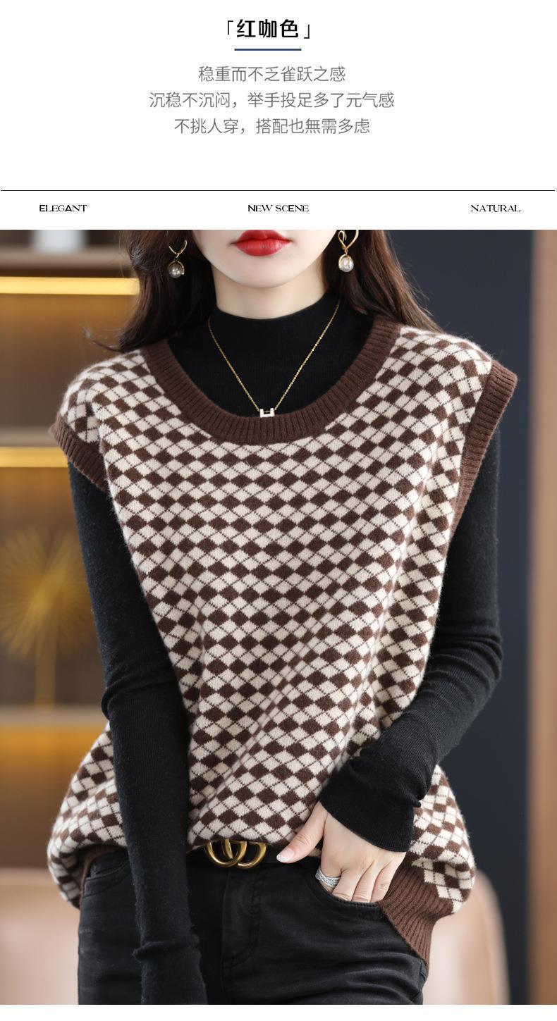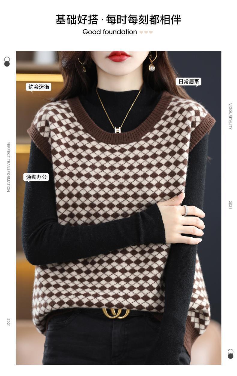 棋盘格圆领叠穿套头马甲背心女新款休闲格子宽松针织坎肩毛衣女