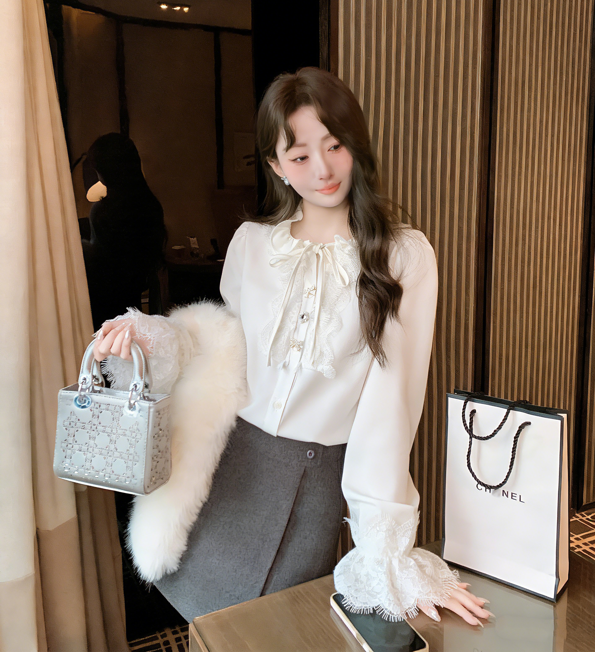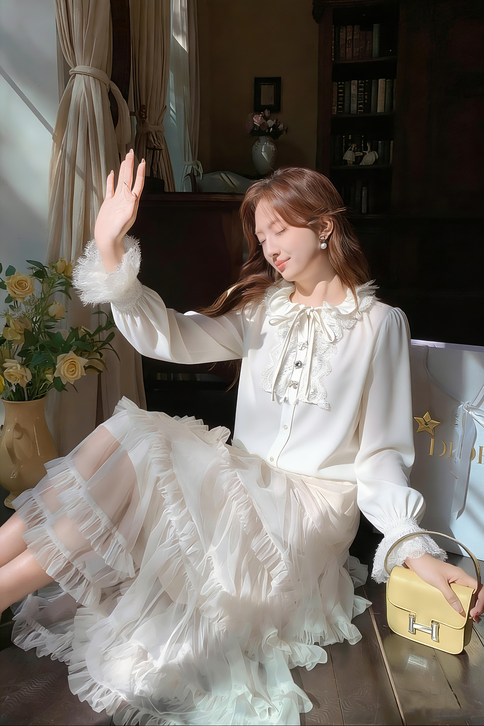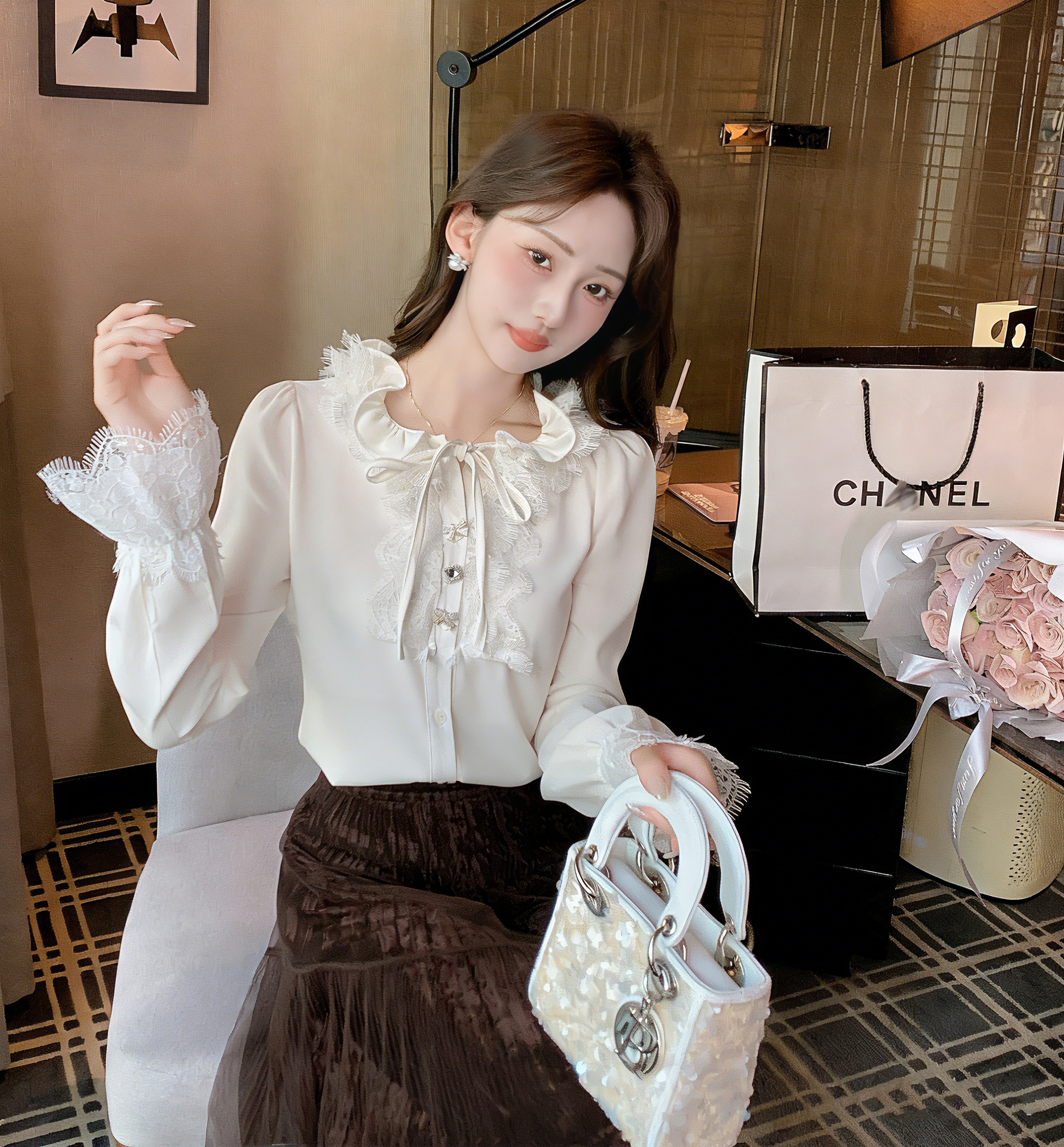 张心子【春日层次】优雅气质缎面系带蕾丝拼接衬衫上衣 U2603016