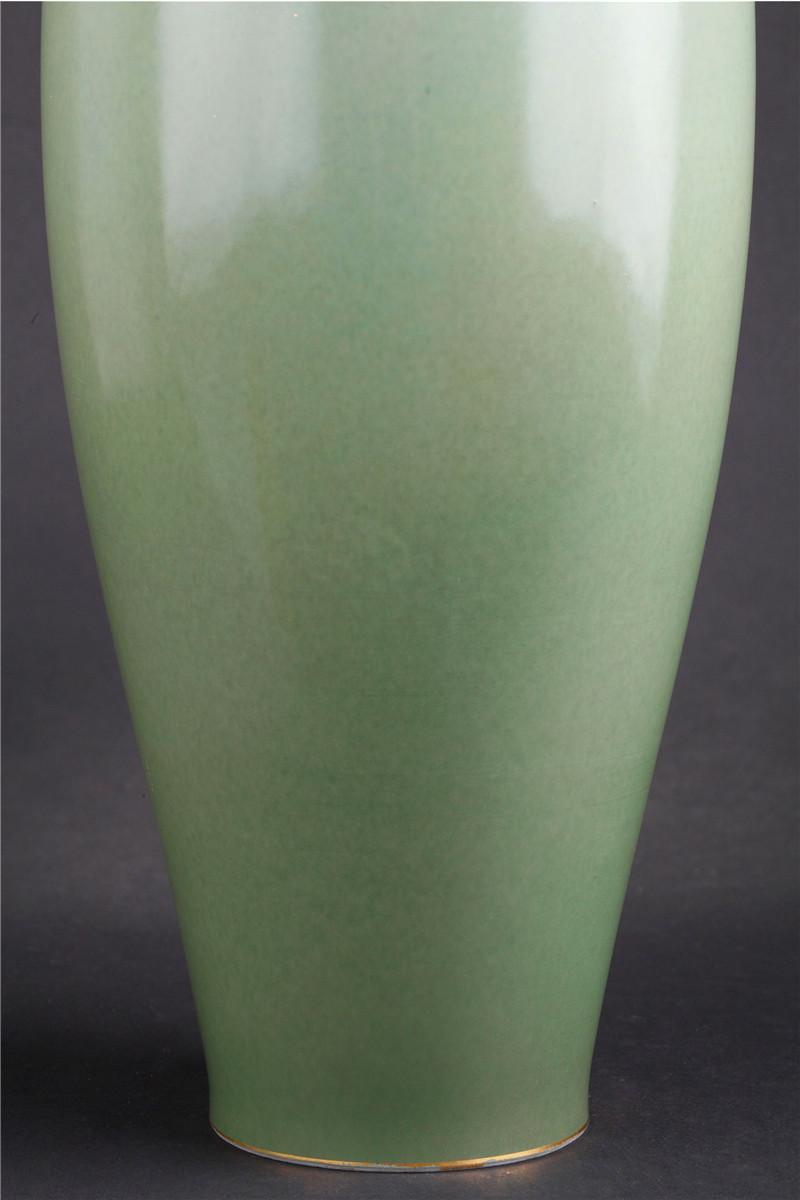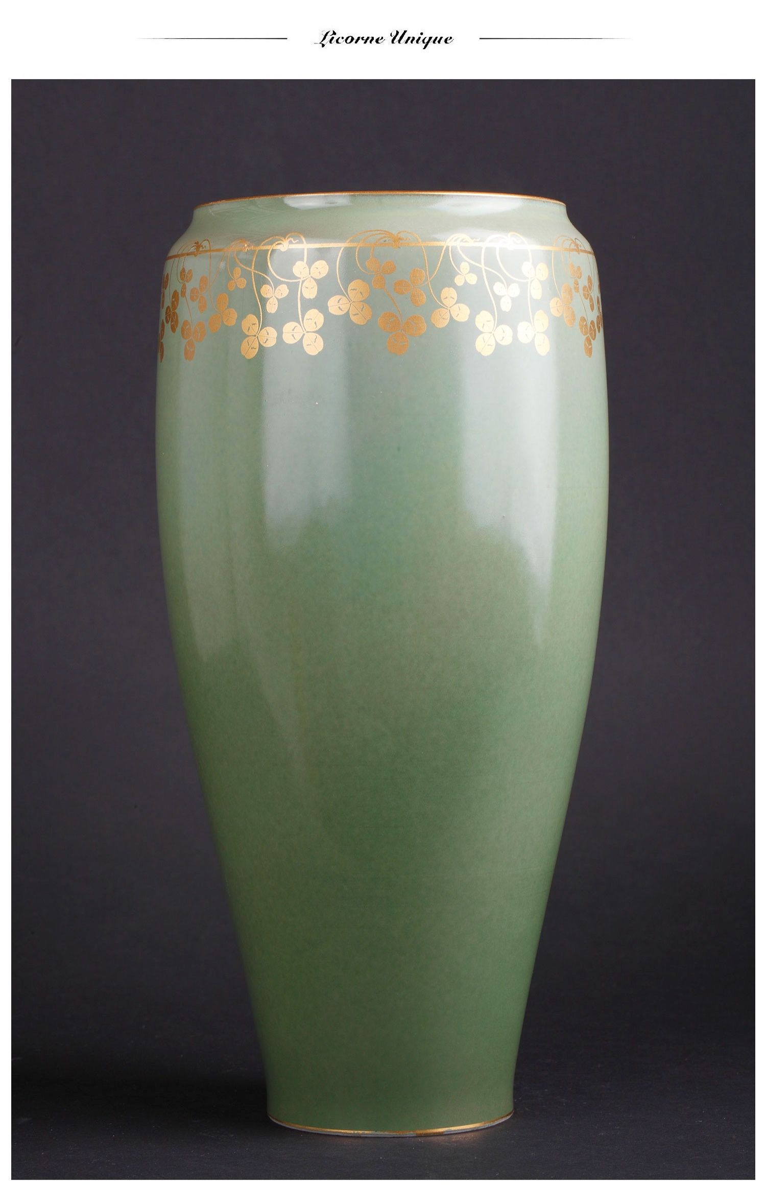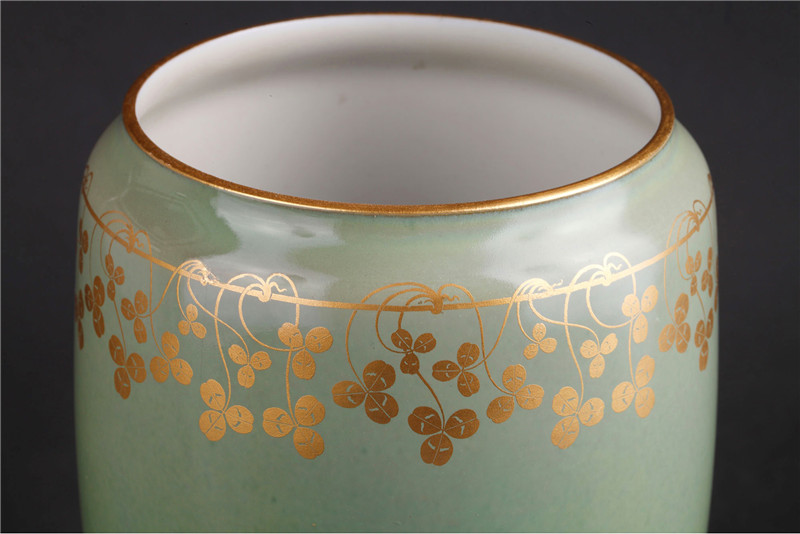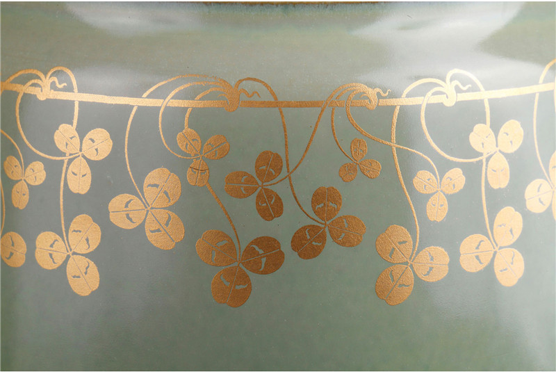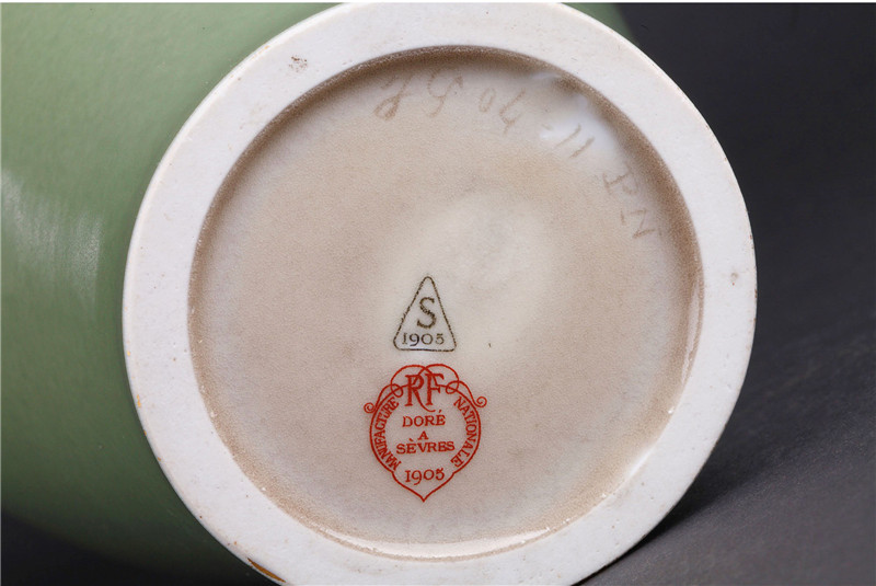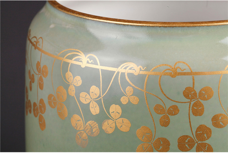 独角鹿西洋古董1905年法国塞弗尔瓷器豆绿釉色三叶草描金花瓶瓷瓶
