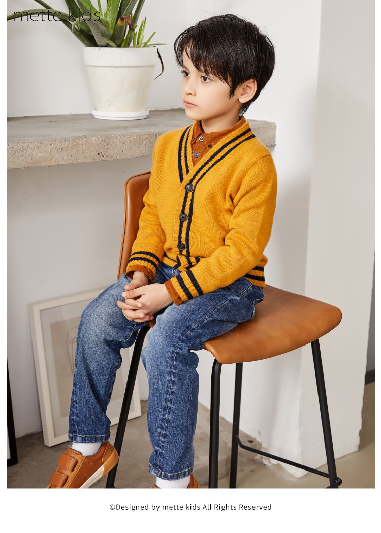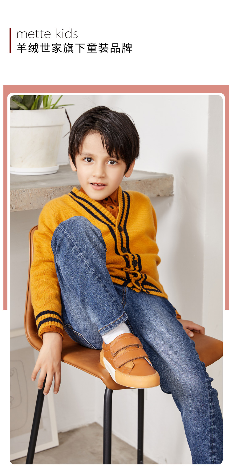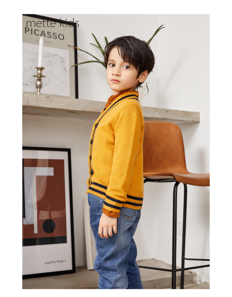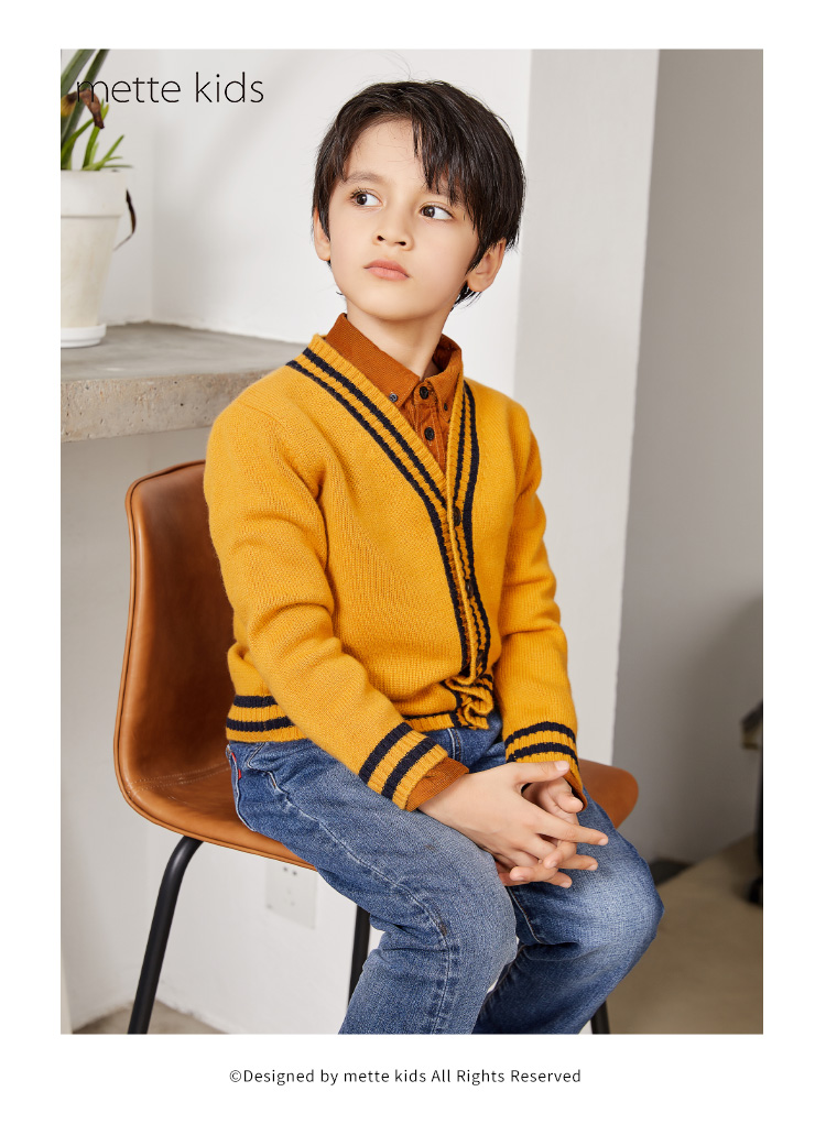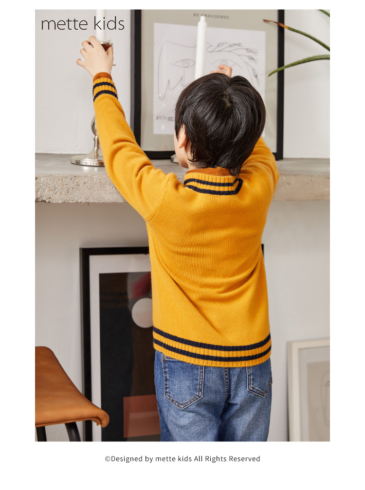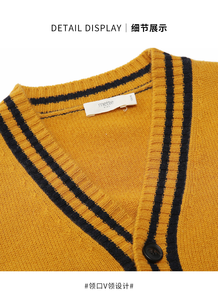 METTE羊绒世家童装男中大童100%山羊绒开衫时尚撞色条纹V领开衫保暖外套