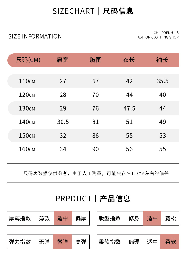| 参考身高: 110/52 120/56 130/60 140/64 150/68 160/72 | 适用季节: 春秋 |