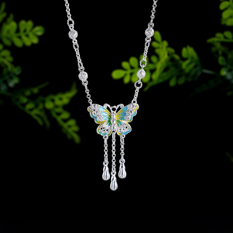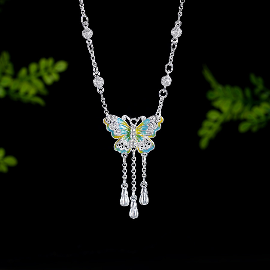 子佩集S990银【翩翩蝶舞】套链【QFTL012】纯银花丝珐琅彩项链蝴蝶2412