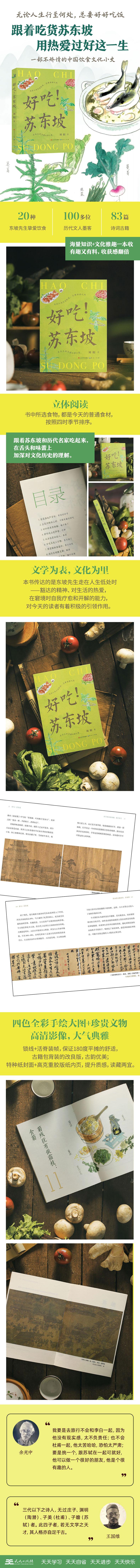 ◆ 20种东坡先生挚爱饮食,100多位历代文人墨客,83篇诗词古籍,海量知识+文化雅趣一本收。有趣又有料,让读者收获感翻倍。 ◆严谨的考证和知识补充,全书所提到的人物故事、历史背景皆有来处。语言反复打磨,浅近、流畅、自然,避免生涩的阅读障碍。 ◆适合立体阅读,书中所选取的食物,都是今天我们随时可得的普通食材,按照四时季节排序,在阅读的同时,可以跟着苏东坡以及历代名家吃起来,在舌头和味蕾上加深对文化历史的理解。 ◆文学为表,文化为里,本书传达的不仅仅是苏东坡的文学与生平故事,更是东坡走在人生低处时豁达的精神、对生活的热爱,在窘境时自我疗愈和开解的能力,对今天的读者有着积极的引领作用。 ◆设计精致独特,四色全彩手绘大图+珍贵文物高清影像,大气典雅;锁线+活脊装帧,保证180度平摊的舒适,也是古籍包背装的改良版,古韵优美;特种纸封面+高克重胶版纸内页,提升质感,读藏两宜。