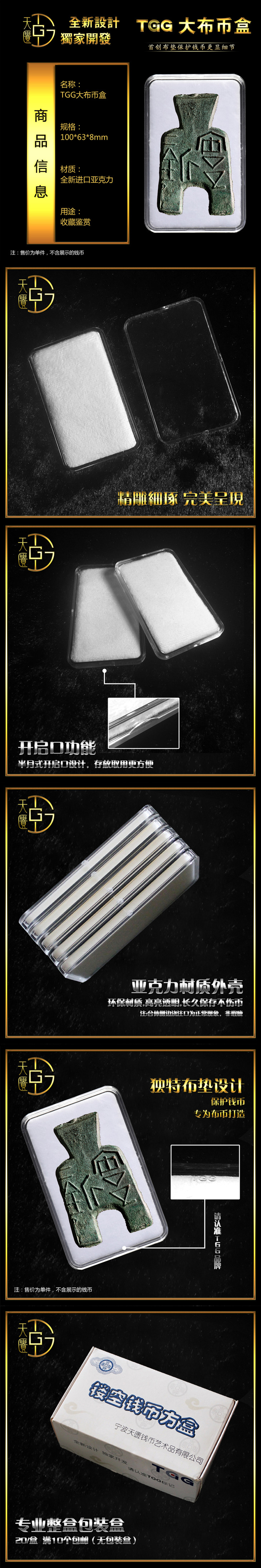 高透进口亚克力材料制作,外径100MM*65MM,大方盒有垫片形(海绵垫具有很好的弹性性),钱币置于绵垫上,通过盒盖的扣压固定钱币。镂空形(可以展示钱币独特的美)