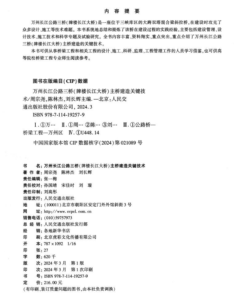 书名:万州长江公路三桥(牌楼长江大桥)主桥建造关键技术