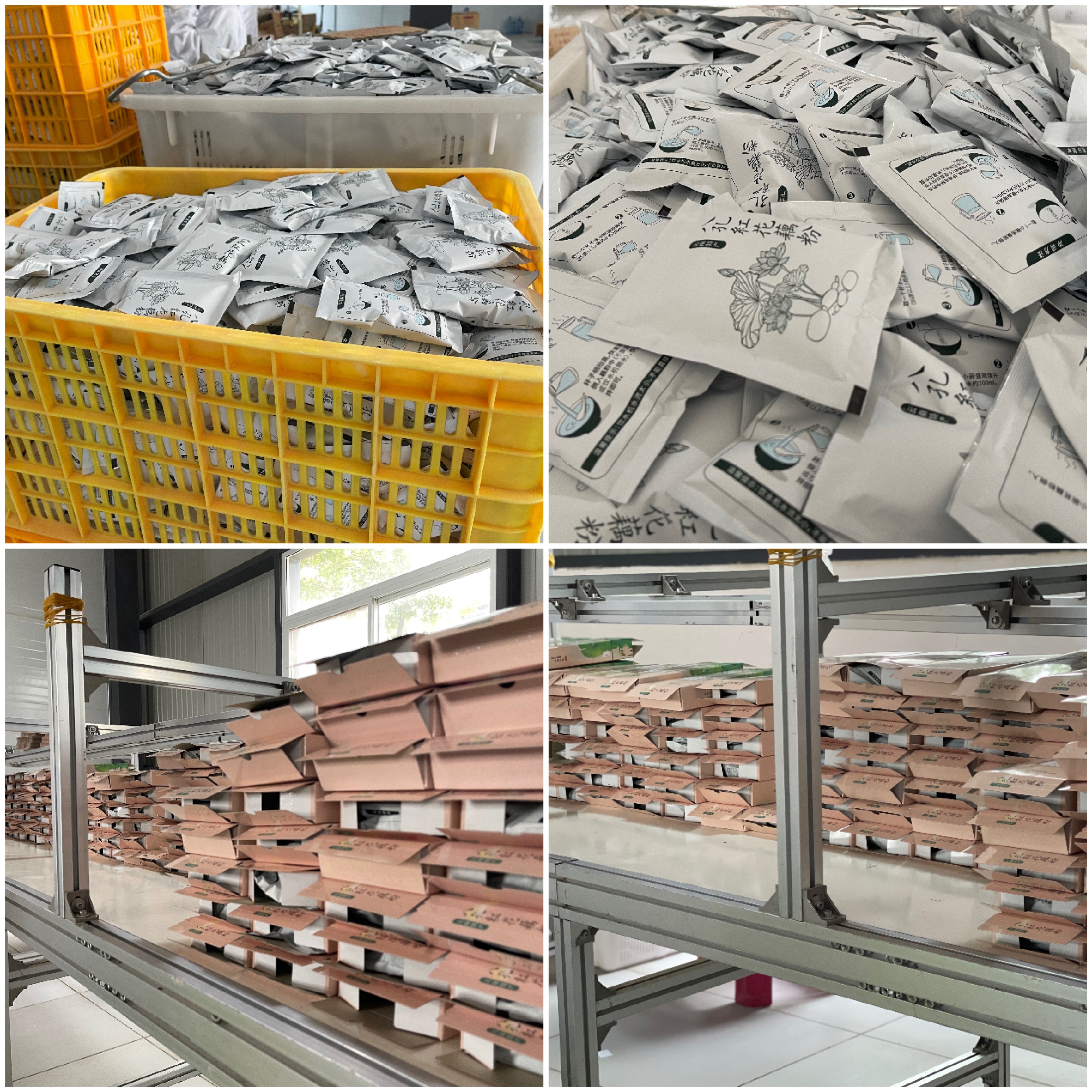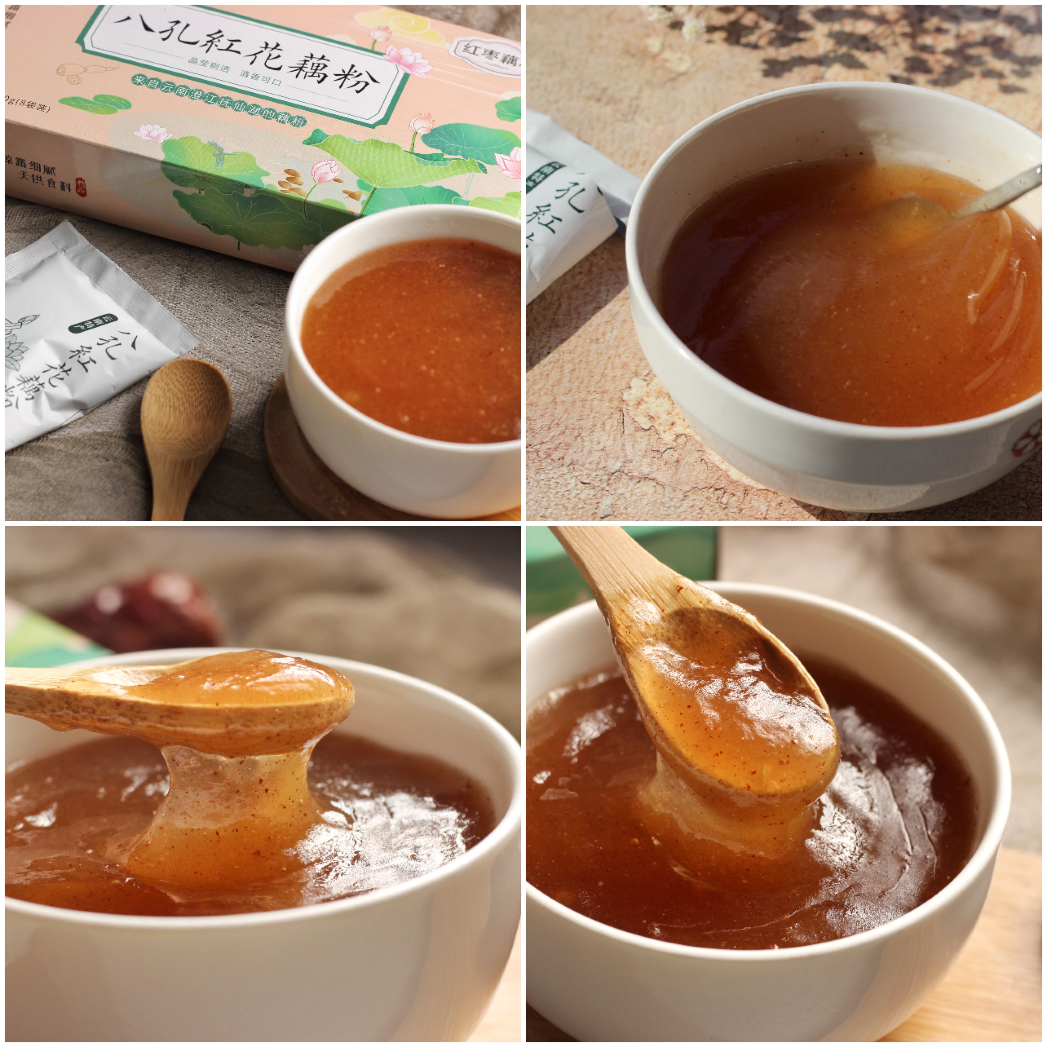 原味藕粉、玫瑰藕粉、红枣藕粉(颗粒状)均为纸盒装,净重200克,一盒8袋,25克/袋。