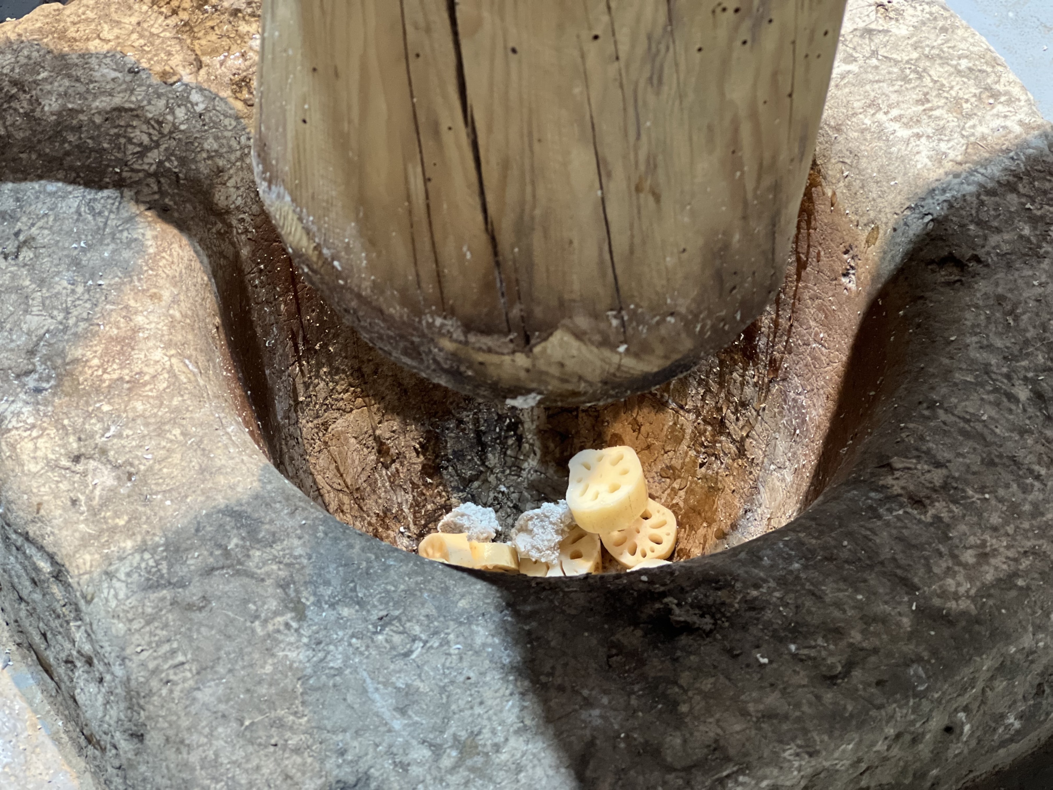 用木槌将清洗干净的莲藕置入石臼冲碎