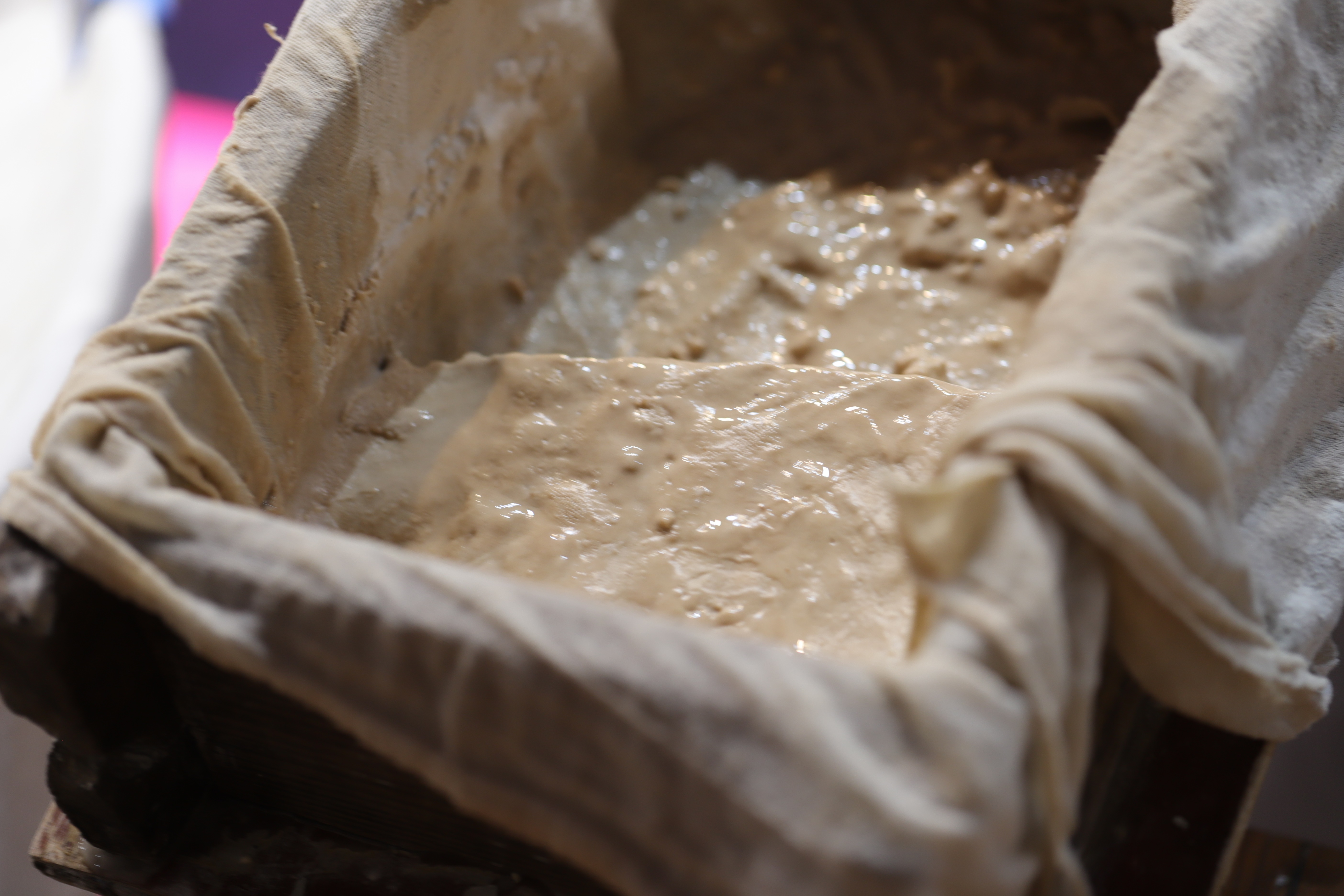 把藕浆包裹于纱布之中静压,使藕浆中的水分被纱布吸收,凝结成快