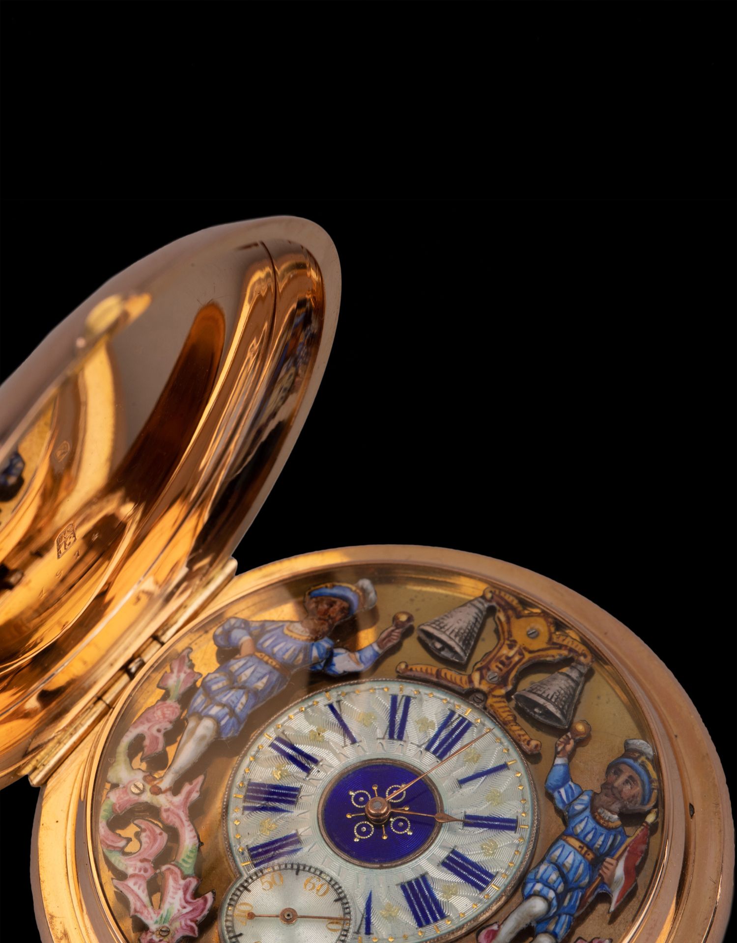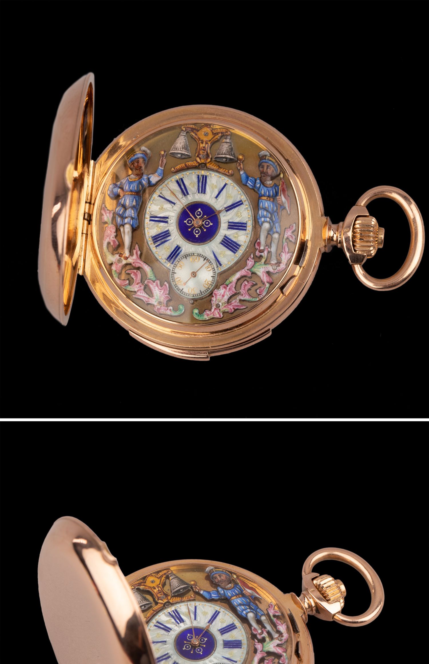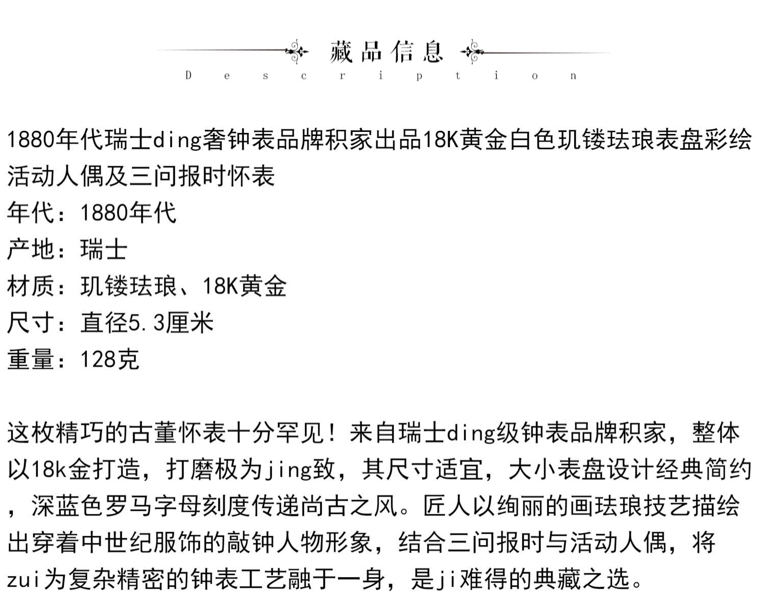 独角鹿西洋古董瑞士18K黄金白色玑镂珐琅活动人偶三问报时怀表