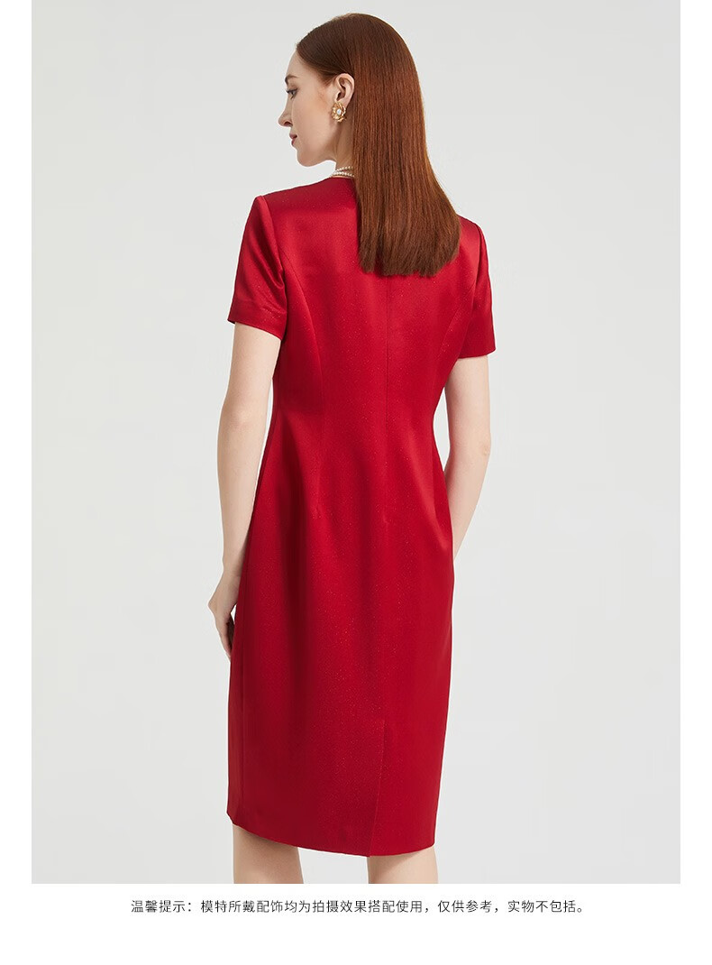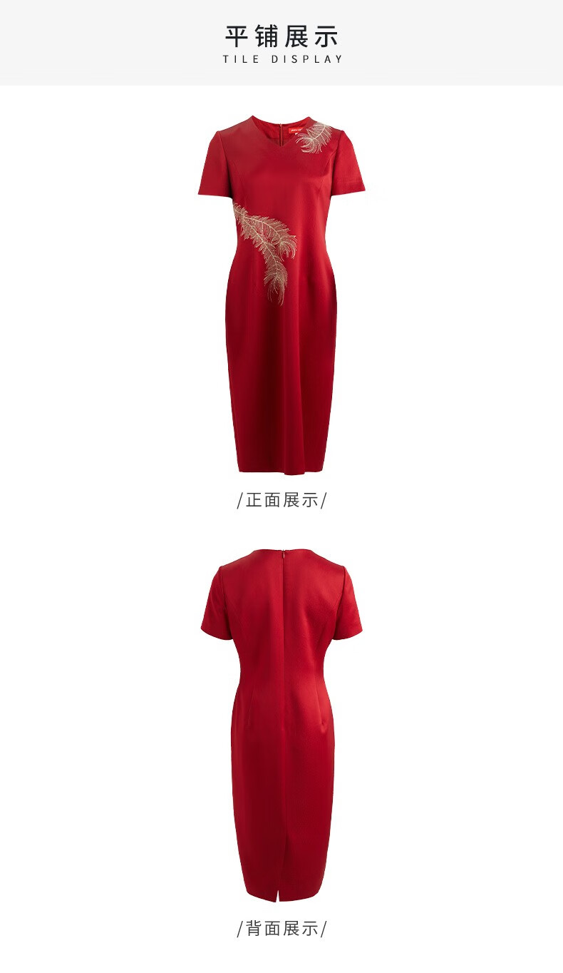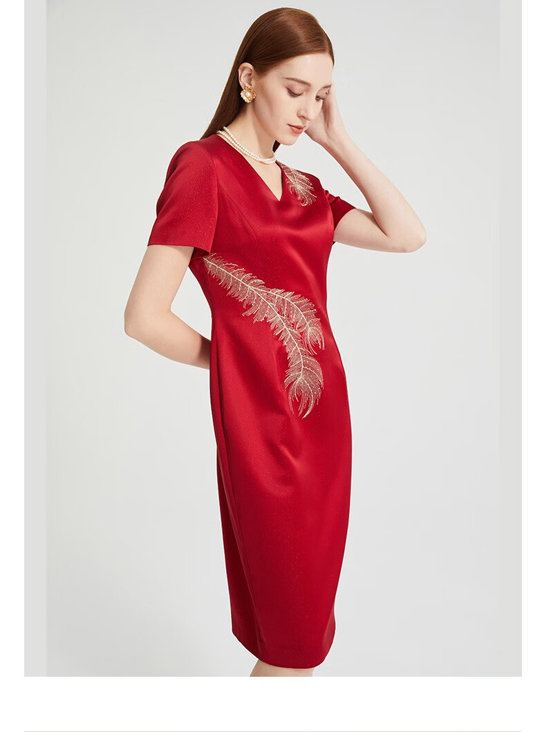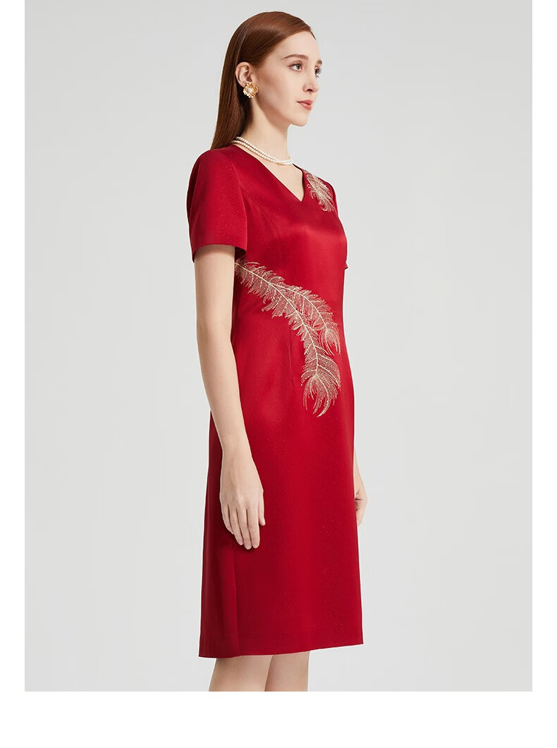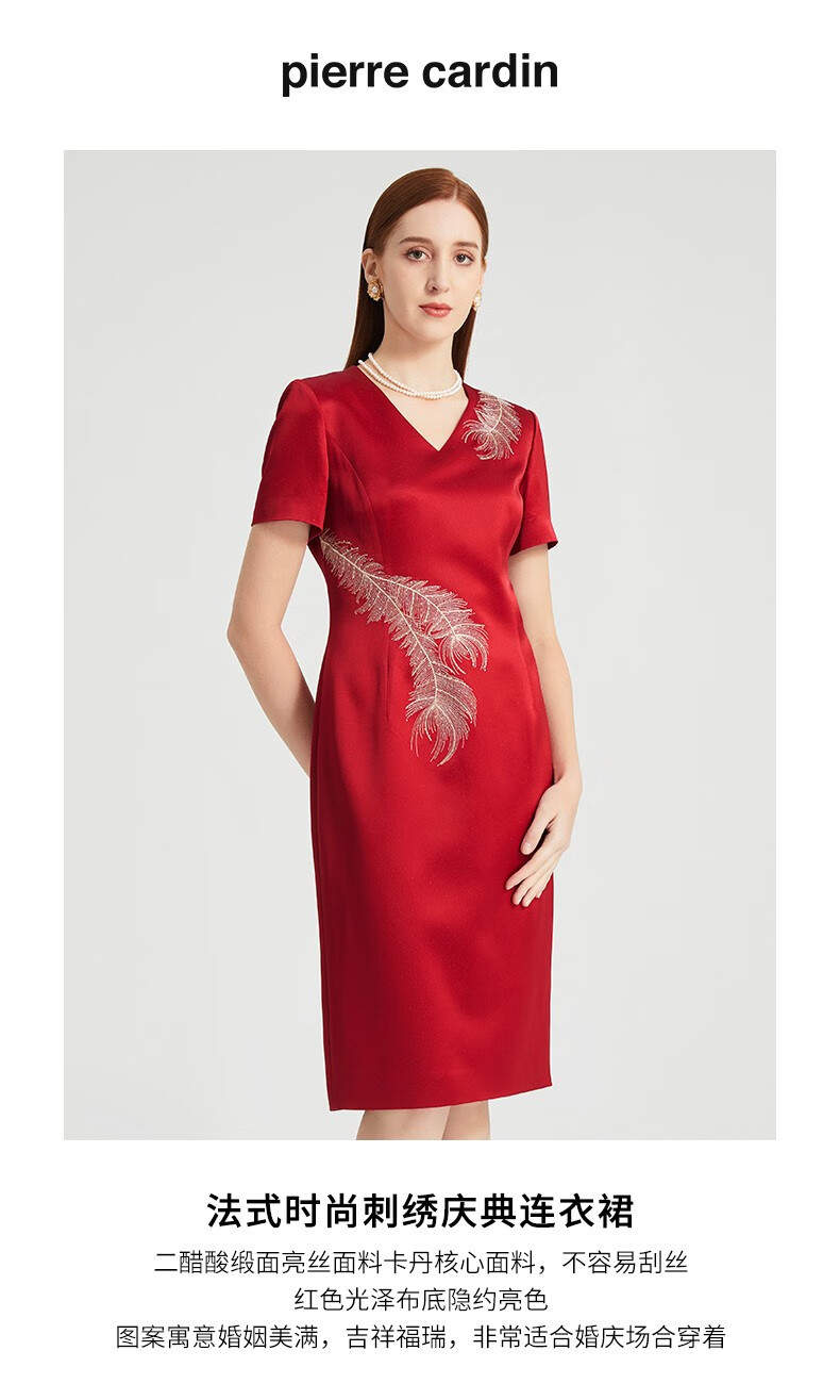 皮尔卡丹女装连衣裙红色刺绣端庄V领短袖场合宴会裙P2206D2081T0