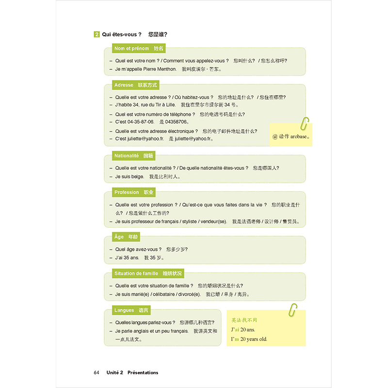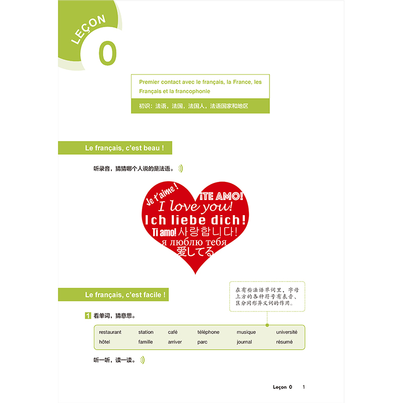 教材板块结构简单实用,设计新颖有吸引力。开篇课(Leçon 0)以新颖简练的文字带领学习者“初识”法语,语音单元(phonétique)通过6课完成基础的语音学习,10个基础单元(Unité)围绕日常主题展开,2个复习单元(Bilan)进行阶段性复习训练。其中每个基础单元以1~2篇对话为文本语料,通过词汇(Vocabulaire)、主题拓展词汇(Pour dire plus)、语法(Grammaire)、练习(Exercices)等项目充分挖掘语料的语言知识信息,配以主题阅读(Lecture)、文化点滴,以文化交际辅助语言学习。根据板块内容特点,使用“小贴士”、图表、插画、电影海报等,希望为学习者提供理解和学习的便利同时,带来学习的乐趣和美的享受。附录收录法语音素表、读音规则表,法语输入法下的键盘布局,法语标点符号,动词变位表和词汇表,供学习者随学随参考。