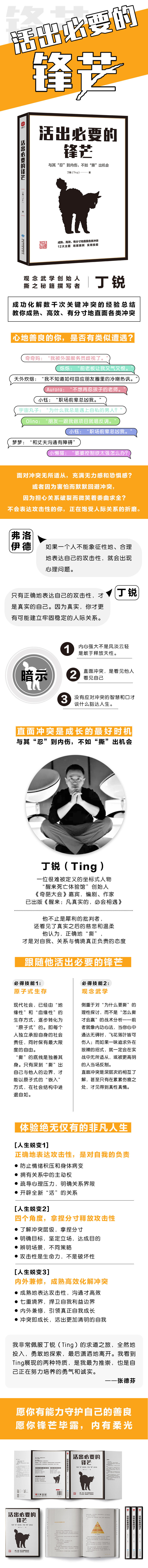 导言:冲突面前,除了忍,我们还能做什么 序言:直面冲突,是看见他人,看见自己 第一章 冲突来了一味“忍”,你是否压抑了创造力 冲突面前,为什么我们习惯性地“忍” 冲突的场域:问题与命题 你可以更灵活地解决冲突 如何释放你的“锋芒” 第二章 “观念武学”的基本要领 边界不同,捍卫的方法也不同 不能拿结果说事儿 化解冲突,需要“组合拳” 第三章 活出必要的锋芒 公众场合里的冲突 我被外国服务员歧视了——表达你的愤怒 如何回应朋友圈的冷嘲热讽——权威“扫堂腿” 我不想再忍孩子的老师——后退一步看结构 邻居要投诉我的幼儿园——对抗中的个人和结构 网课退费——不占理就不要撕 职场里的冲突 前老板让我又气又恨——自己心中的“绝对道德” 职场前辈总凶我——脆弱交付 同事总是搞小动作——以彼之道 老板不兑现承诺——看清工作利益 留住真朋友 朋友“偷”了我的股份——冲突中的维度、区域、程度 错把熟人当朋友——关系层级 朋友一跟我做项目就唱反调——确定关系性质 对朋友恨铁不成钢——看到需求 我辞退了住家三年的保姆——看见价值 让亲密关系更结实 为什么我总是遇上自私的男人——不妨先“撕”一下自己 和丈夫沟通有障碍——自我意识 丈夫不配合办离婚手续,怎么办——宣讲和沟通 男友物化女性,分还是不分——坐标原理 老公总是瞒着我给公婆钱——步步为营建立共生关系 无法沟通的婚姻——亲密关系的底线 我想保住这个家——放风筝 家有“妈宝男”——因势利导 原生家庭的关系界限 父亲干涉我的生活习惯——分清权和利 怎么面对父亲带来的负面情绪——拓宽领土 爸爸要我帮忙——看见对方 看不惯姐姐养育孩子的方式——价值重心 不讲理的妈妈——独立和共生 父母离婚后母亲老是纠缠父亲——落差控制 婆婆控制欲太强怎么办——感受存在 为了成长“撕”自己 我总怕别人失望——你并不重要 怎么控制自己的情绪——愤怒武器 渴望被守护——看见未完成 别人都说我很冷漠——建立关系 拖延症怎么治——制造对抗力 害怕权威——修补恐惧 我总是被权威的话影响——权威后置 我总是缺乏耐心——个体属性 面对压力总想逃跑——打开黑箱 别人总是对我发火——理性VS不可控 害怕被评价——柔化畏惧 我要不要生二胎——自我实现 我总想怼人——个人边界 无家可归感——看清现实 舍不得扔东西——断舍离 我不想当墙头草——弹性边界 面对权威很紧张——你的情在喊你 后记
