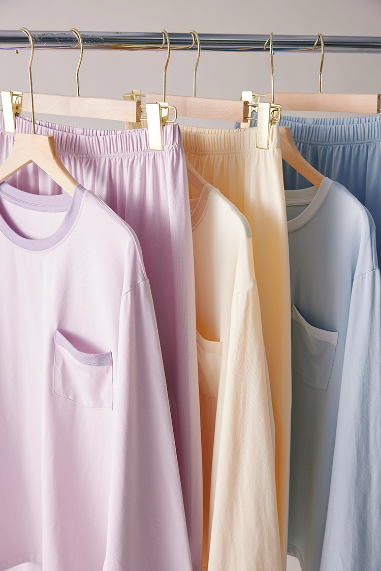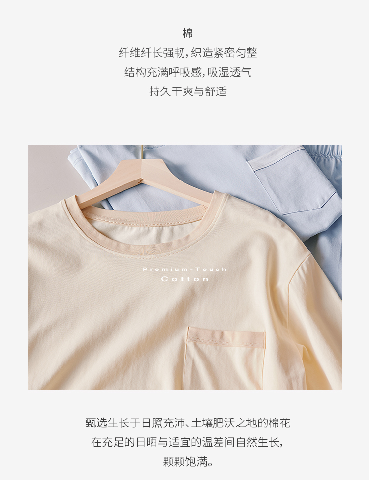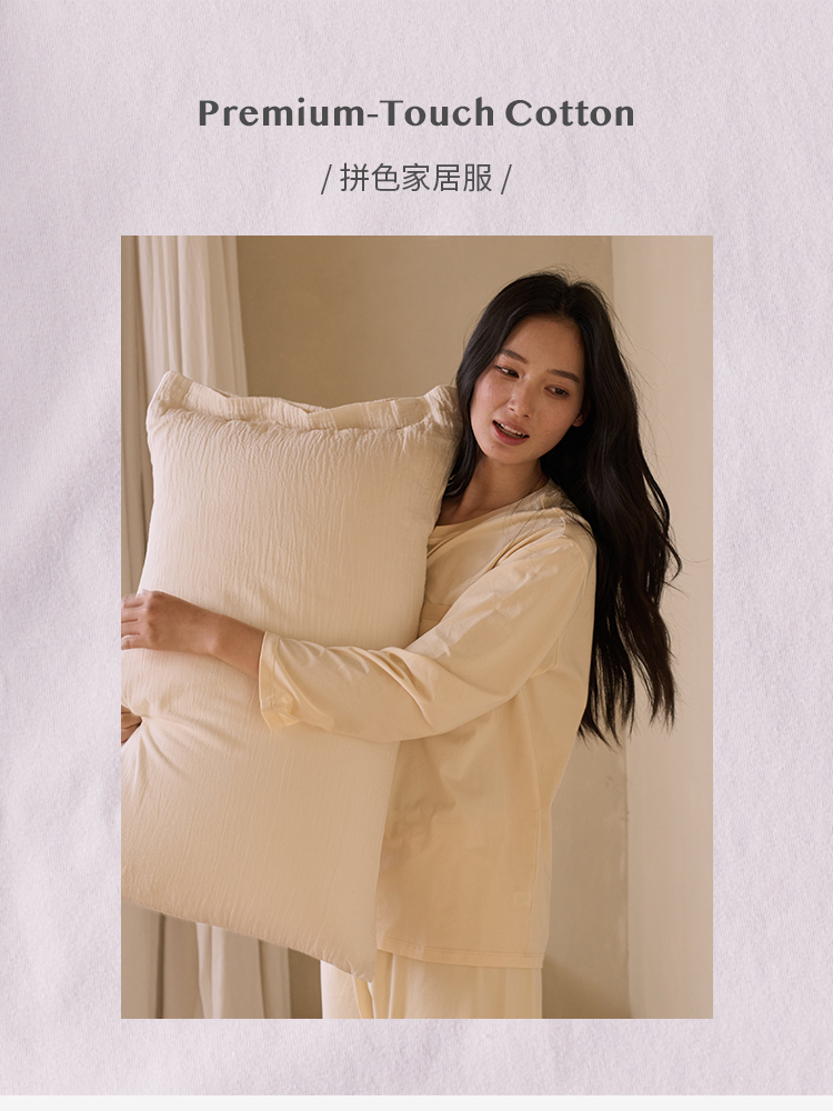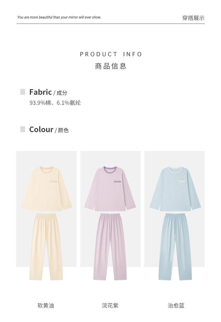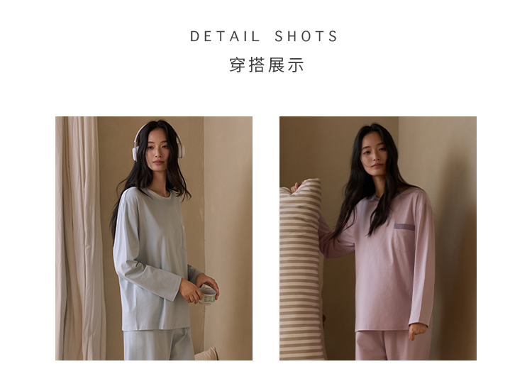 采用93.9%高含棉量材质,6.1%氨纶,弹力大,更舒适。裸感穿着体验。 宅家的放松感,一定要有一套让身体舒展的家居服 。