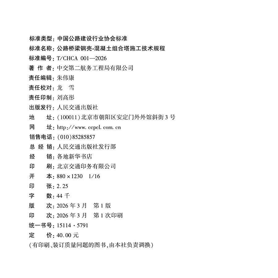 书名:公路桥梁钢壳-混凝土组合塔施工技术规程(T/CHCA 001—2026)